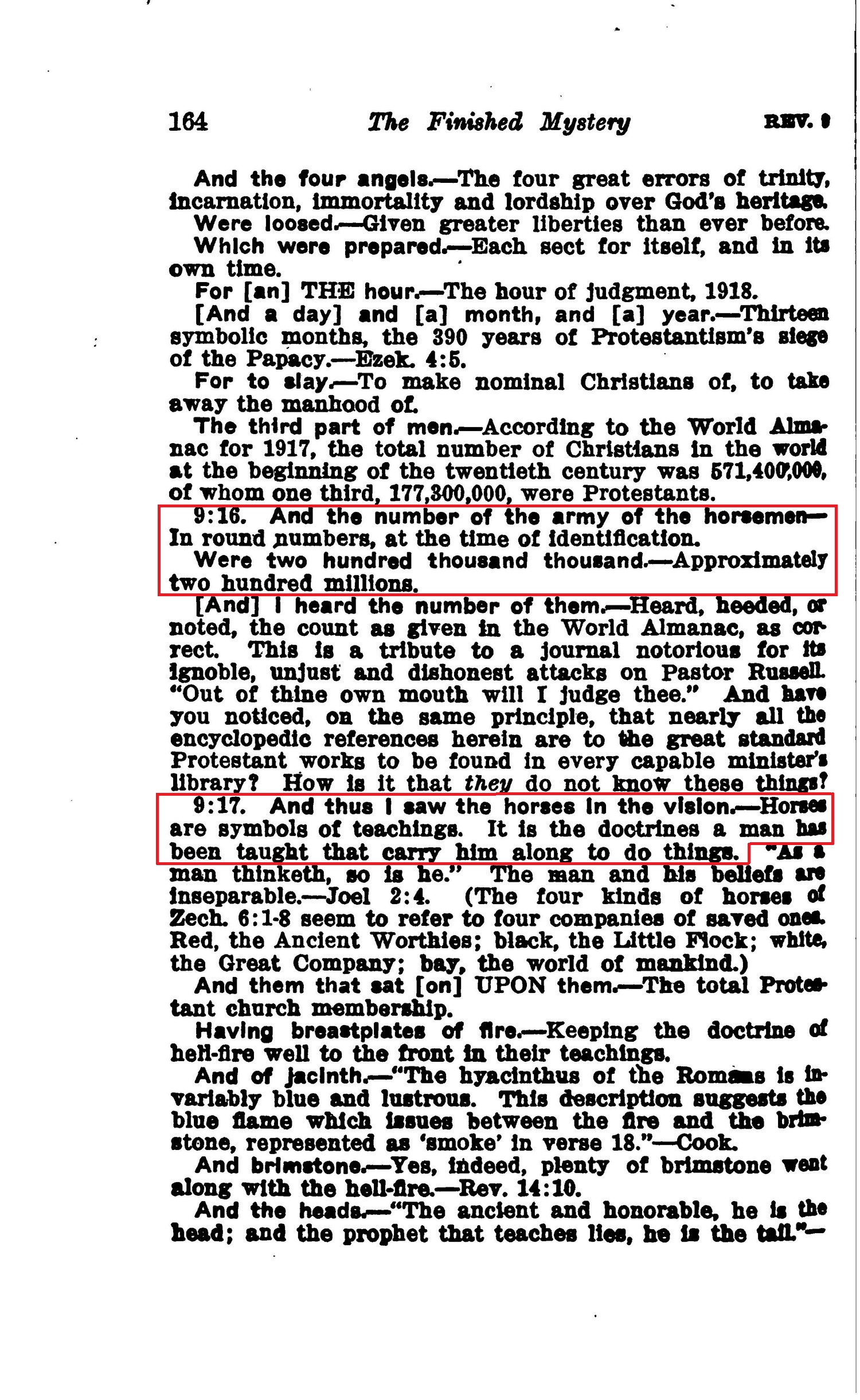 9:16. And the number of the army of the horsemen — In round numbers, at the time of identification. Were two hundred thousand thousand. — Approximately two hundred millions. 9:17. And thus I saw the horses In the vision. - Horses are symbols of teachings. It is the doctrines a man has been taught that carry him along to do things. Source : 🇺🇸 1917 - Studies in the Scriptures, Vol 7, The finished mystery, page 164 + Cover |