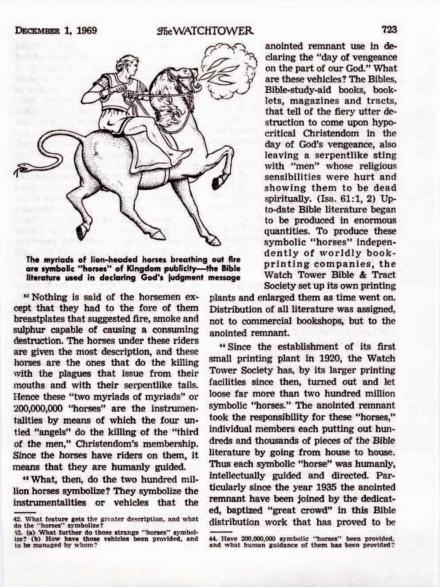 Hence these “two myriads of myriads” or 200,000,000 “horses” are the instrumentalities by means of which the four untied “angels” do the killing of the “third of the men,” Christendom’s membership. [...] What, then, do the two hundred million horses symbolize? They symbolize the instrumentalities or vehicles that the anointed remnant use [...] What are these vehicles? The Bibles, Bible-study-aid books, booklets, magazines and tracts, that tell of the fiery utter destruction to come upon hypocritical Christendom in the day of God’s vengeance, also leaving a serpentlike sting with “men” [...] Up-to-date Bible literature began to be produced in enormous quantities. To produce these symbolic "horses" independently of worldly book-printing companies, the Watch Tower Bible & Tract Society set up its own printing plants and enlarged them as time went on. Distribution of all literature was assigned, not to commercial bookshops, but to the anointed remnant.