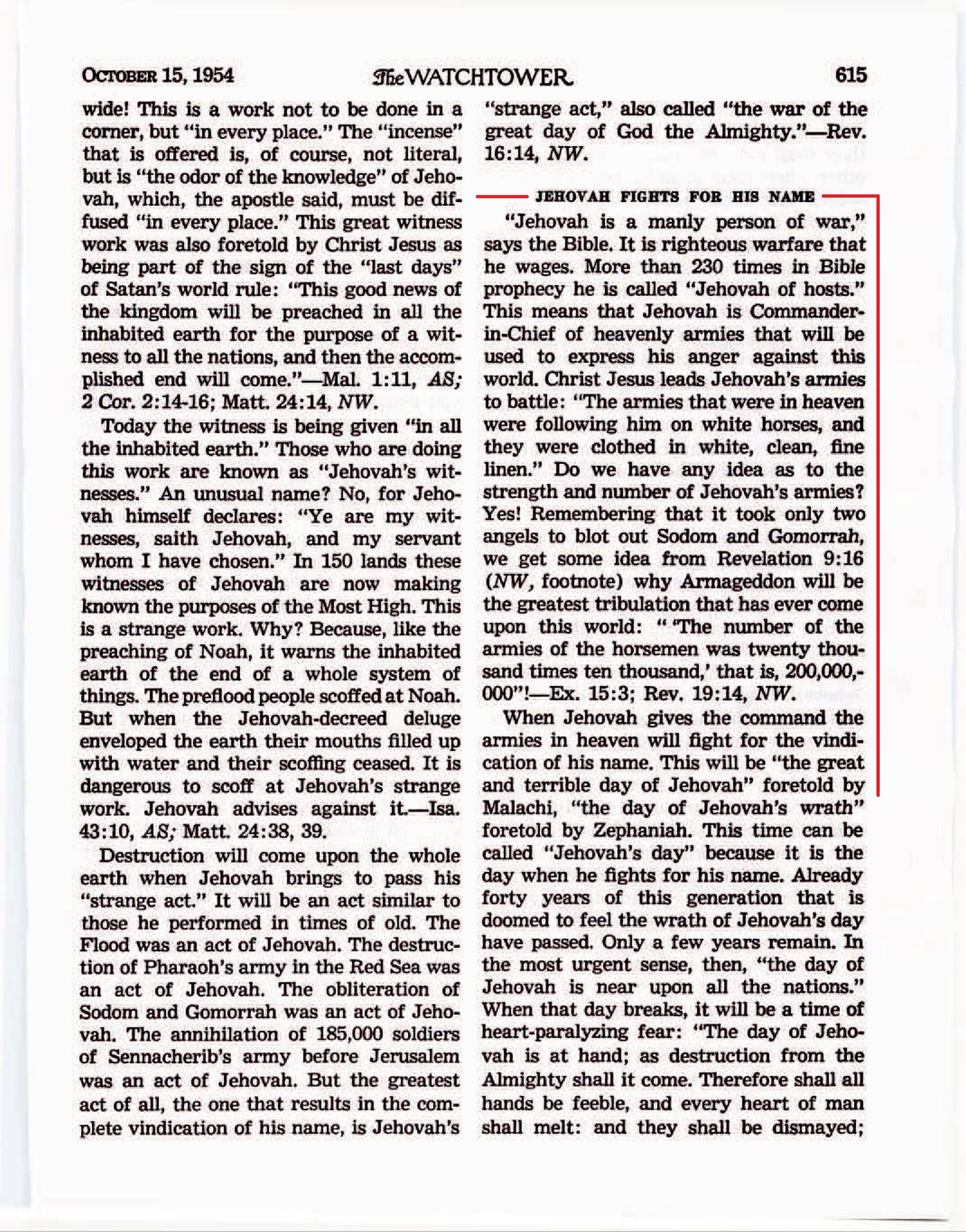 Jehovah is Commanderin-Chief of heavenly armies that will be used to express his anger against this world. Christ Jesus leads Jehovah’s armies to battle: “The armies that were in heaven were following him on white horses, and they were clothed in white, clean, fine linen.” Do we have any idea as to the strength and number of Jehovah’s armies? Yes! Remembering that it took only two angels to blot out Sodom and Gomorrah, we get some idea from Revelation 9:16 (NW, footnote) why Armageddon will be the greatest tribulation that has ever come upon this world: “‘The number of the armies of the horsemen was twenty thousand times ten thousand,’ that is, 200,000,- 000” !—Ex. 15:3; Rev. 19:14, When Jehovah gives the command the armies in heaven will fight for the vindication of his name. This will be “the great and terrible day of Jehovah” [...] So when Christ Jesus leads Jehovah’s armies “from heaven with his powerful angels in a flaming fire, as he brings due punishment upon those who do not know God,” the world will not in the least expect it. Source : 🇺🇸 The Watchtower, October 15 1954, page 615, page 616 + Cover |