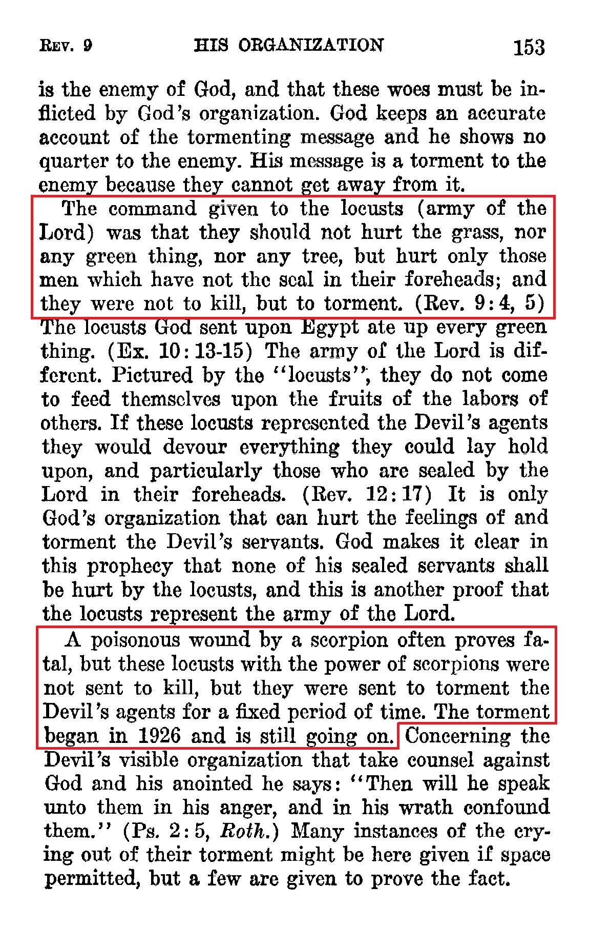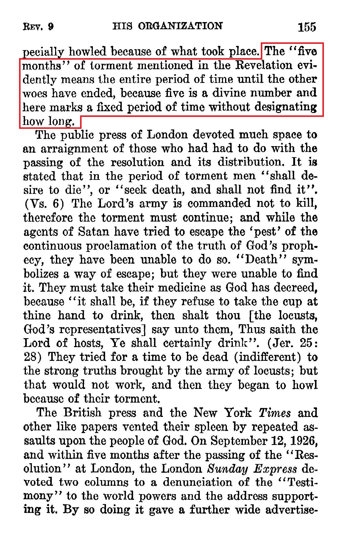 The command given to the locusts (army of the Lord) was that they should not hurt the grass, nor any green thing, nor any tree, but hurt only those men which have not the seal in their foreheads; and they were not to kill, but to torment. (Rev. 9: 4, 5) [...] A poisonous wound by a scorpion often proves fatal, but these locusts with the power of scorpions were not sent to kill, but they were sent to torment the Devil's agents for a fixed period of time. The torment began in 1926 and is still going on. [...] The "five months" or torment mentioned in the Revelation evidently means the entire period of time until the other woes have ended, because five is a divine number and here marks a fixed period or time without designating how long. Source : 🇺🇸 1930 - Light, vol 1, page 153, page 155 + Cover |