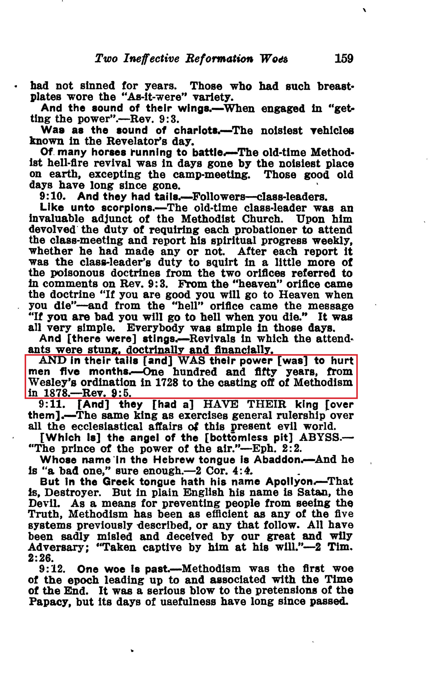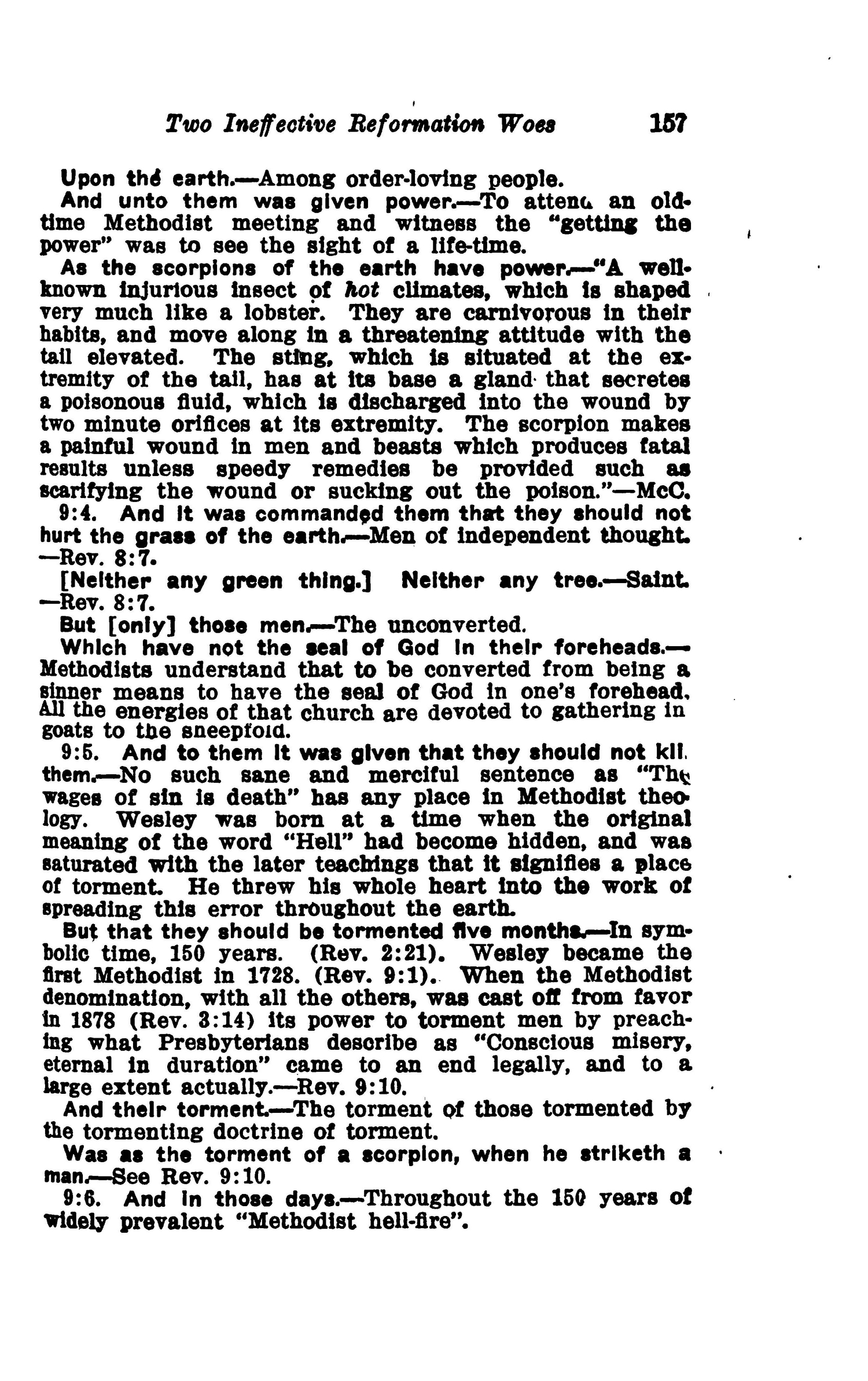AND in their tails [and] WAS their power [was] to hurt men five months. — One hundred and fifty years, from Wesley's ordination in 1728 to the casting off of Methodism in 1878. — Rev. 9:5. Source : 🇺🇸 1917 - Studies in the Scriptures, Vol 7, The finished mystery, page 159 + Cover |