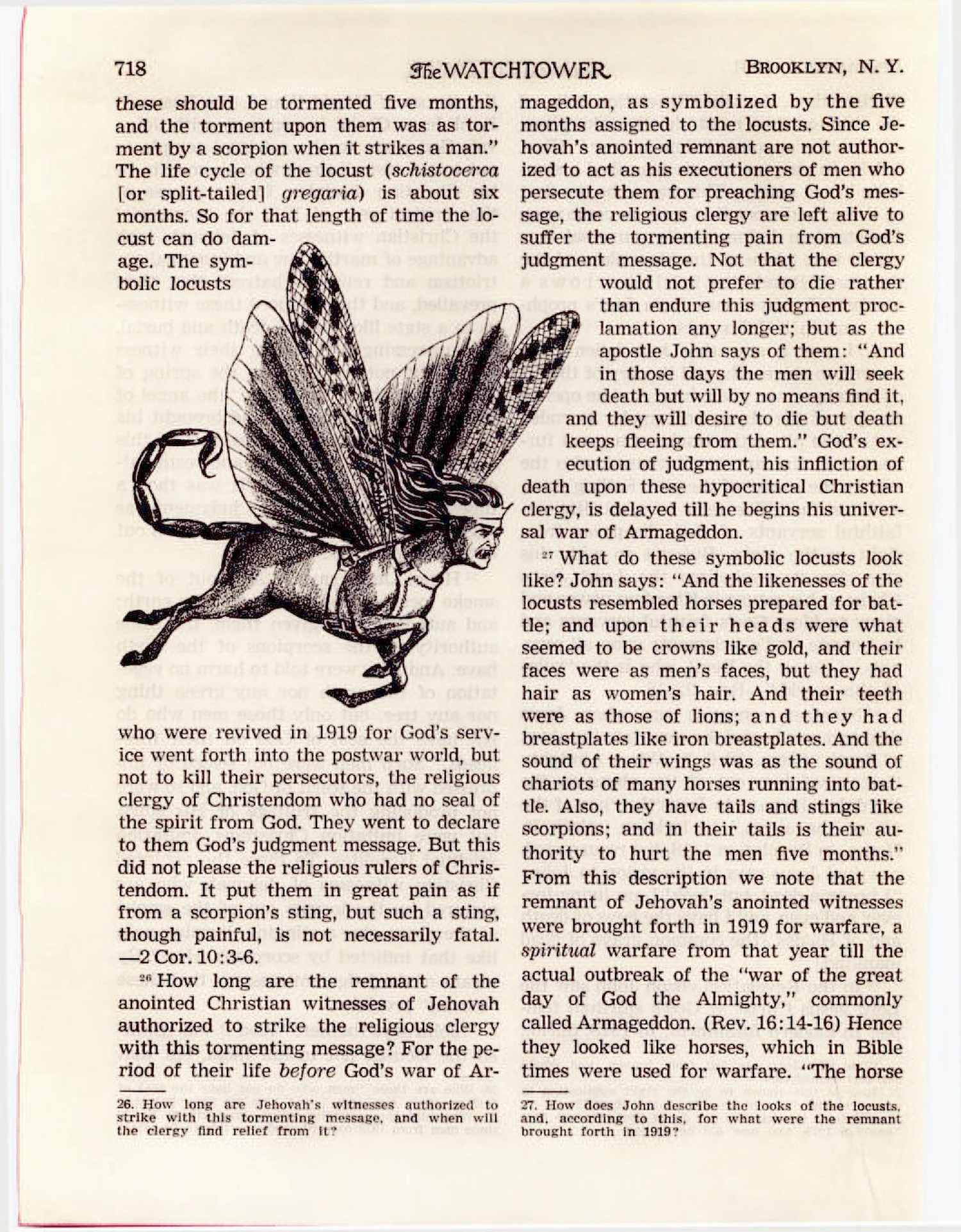 How long are the remnant of the anointed Christian witnesses of Jehovah authorized to strike the religious clergy with this tormenting message? For the period of their life before God’s war of Armageddon as symbolized by the five months assigned to the locusts. Since Jehovah’s anointed remnant are not authorized to act as his executioners of men who persecute them for preaching God’s message, the religious clergy are left alive to suffer the tormenting pain from God’s judgment message. [...] From this description we note that the remnant of Jehovah’s anointed witnesses were brought forth in 1919 for warfare, a spiritual warfare from that year till the actual outbreak of the “war of the great day of God the Almighty,” commonly called Armageddon. (Rev. 16:14-16) Source : 🇺🇸 The Watchtower, December 1 1961, page 718 + Cover |