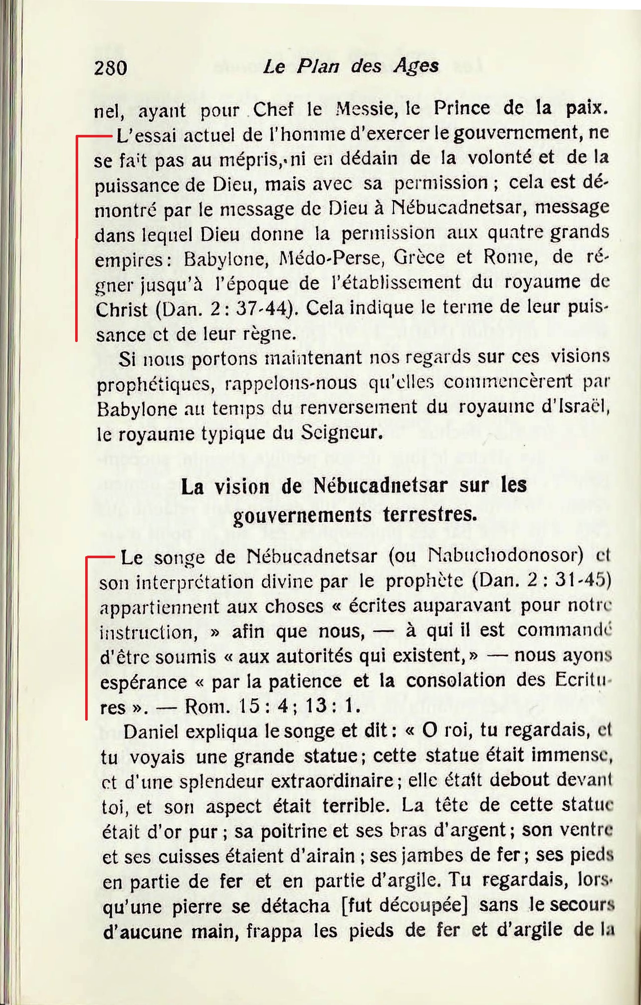 L'essai actuel de l'homme d'exercer le gouvernement, ne se fait pas au mépris, ni en dédain de la volonté et de la puissance de Dieu, mais avec sa permission ; cela est démontré par le message de Dieu à Nébucadnetsar, message dans lequel Dieu donne la permission aux quatre grands empires: Babylone, Médo-Perse, Grèce et Rome, de régner jusqu'à l'époque de l'établissement du royaume de Christ (Dan. 2:37-44). [...] Le songe de Nébucadnetsar (ou Nabuchodonosor) et son interprétation divine par le prophète (Dan. 2:31-45) appartiennent aux choses « écrites auparavant pour notre instruction, » afin que nous, — à qui il est commandé d'être soumis « aux autorités qui existent,» — nous ayons espérance « par la patience et la consolation des Écritures ». — Rom. 15:4; 13:1.