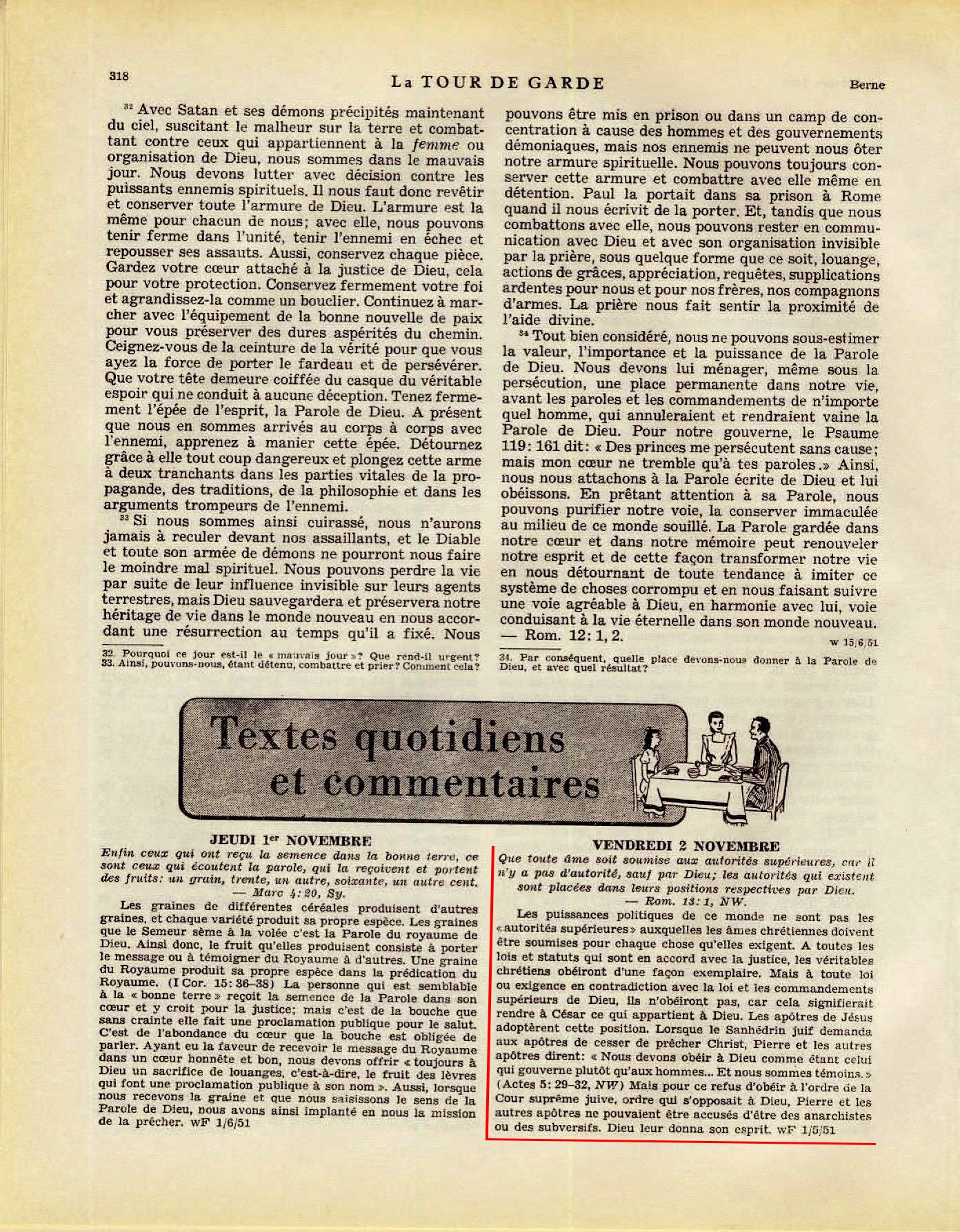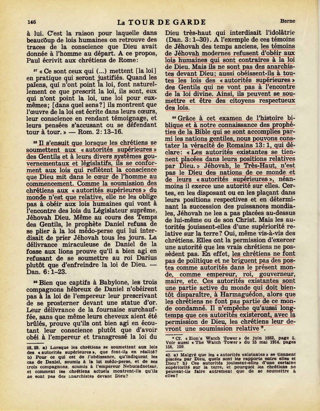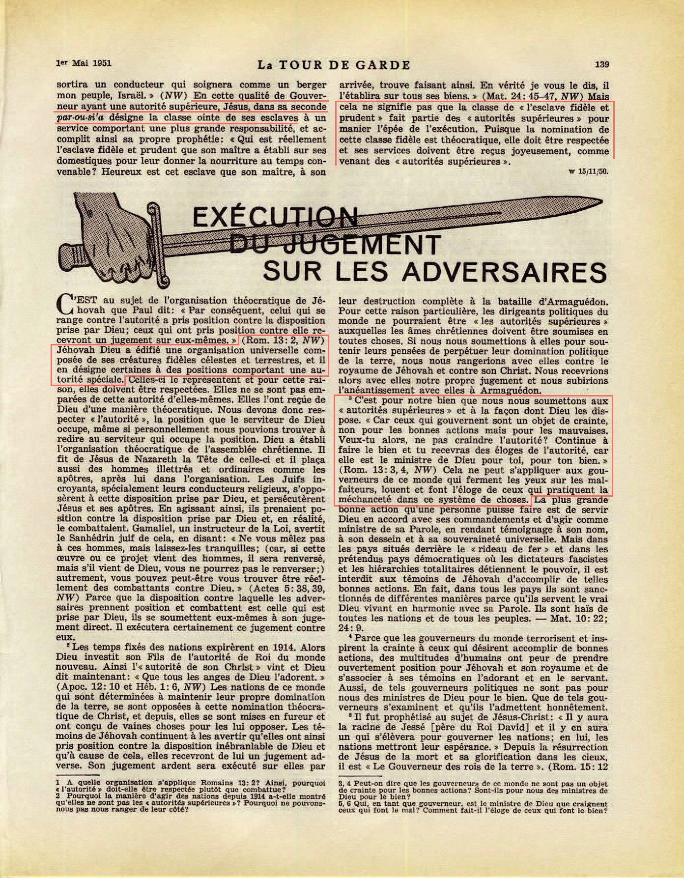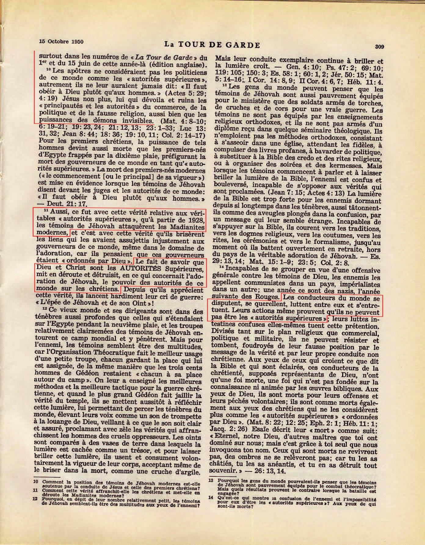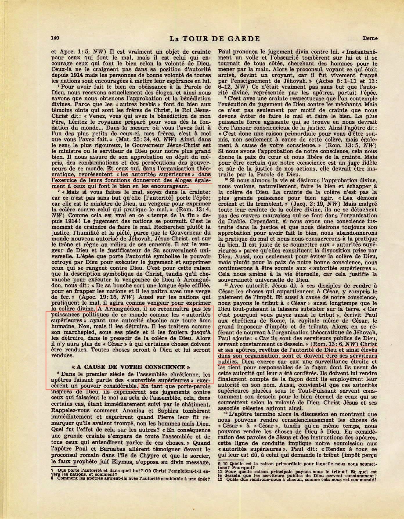 [...] à cause de la doctrine religieuse prévalant encore, selon laquelle les chefs de l'organisation visible de Satan sont les "autorités supérieures" auxquelles toutes les âmes chrétiennes doivent être soumises, comme cela est recommandé dans l'épître aux Romains, chapitre 13, verset 1 [...] Cette interprétation religieuse erronée des Ecritures, au sujet des "autorités supérieures", a longtemps incité les chrétiens ignorants à se soumettre aux dirigeant de ce monde, au détriment des intérêts de l'oeuvre de Dieu et de la vraie liberté. "La Tour de Garde" publia l'explication scripturale du chapitre 13 de l'épître aux Romains. Elle montrait que Jéhovah et Christ sont les "autorités supérieures" et non les gouvernants de ce monde "
