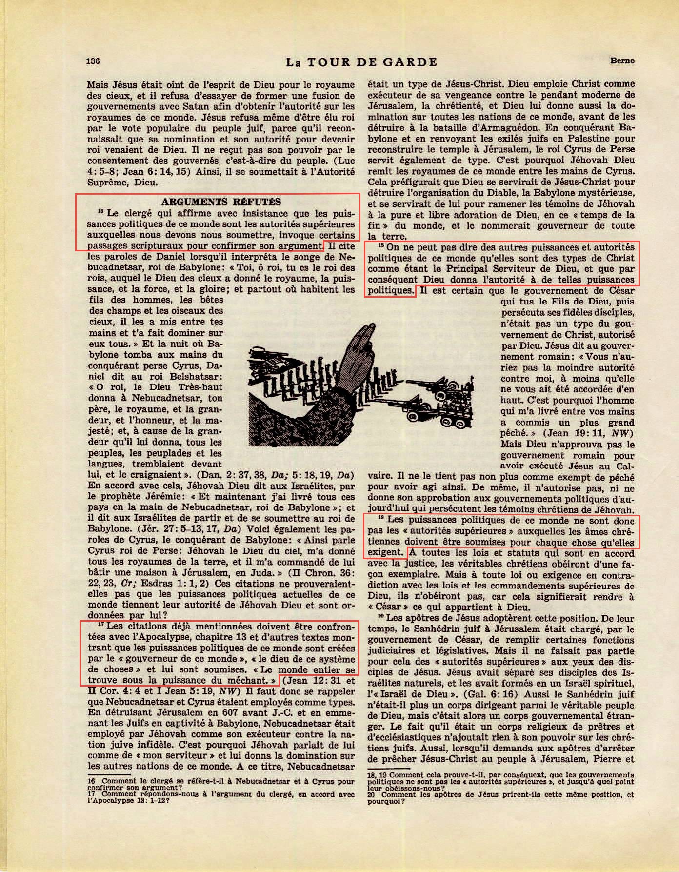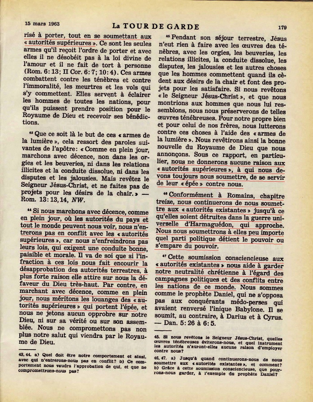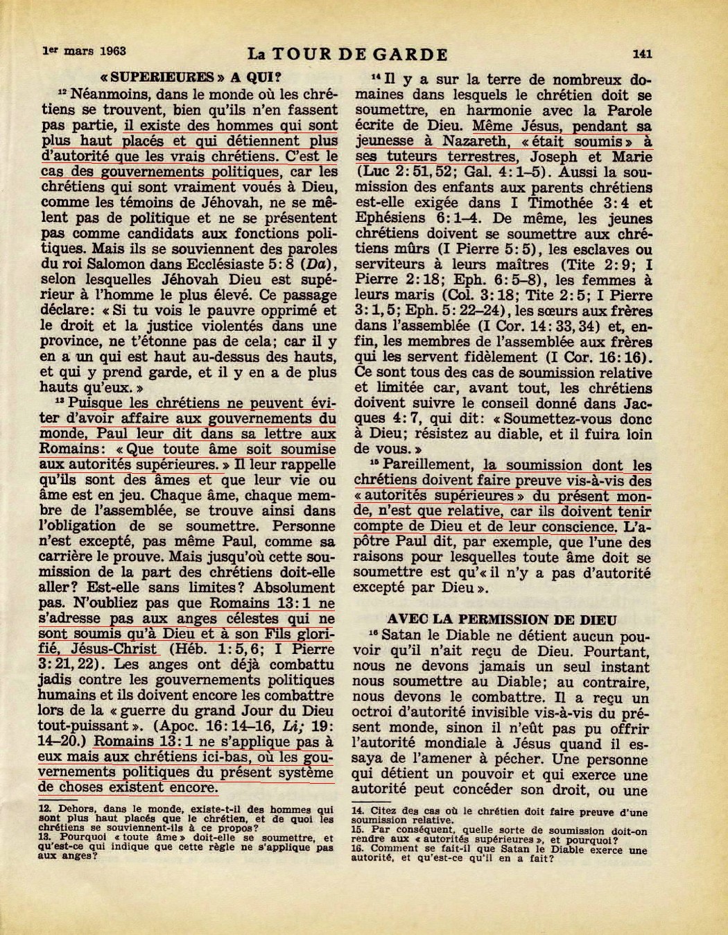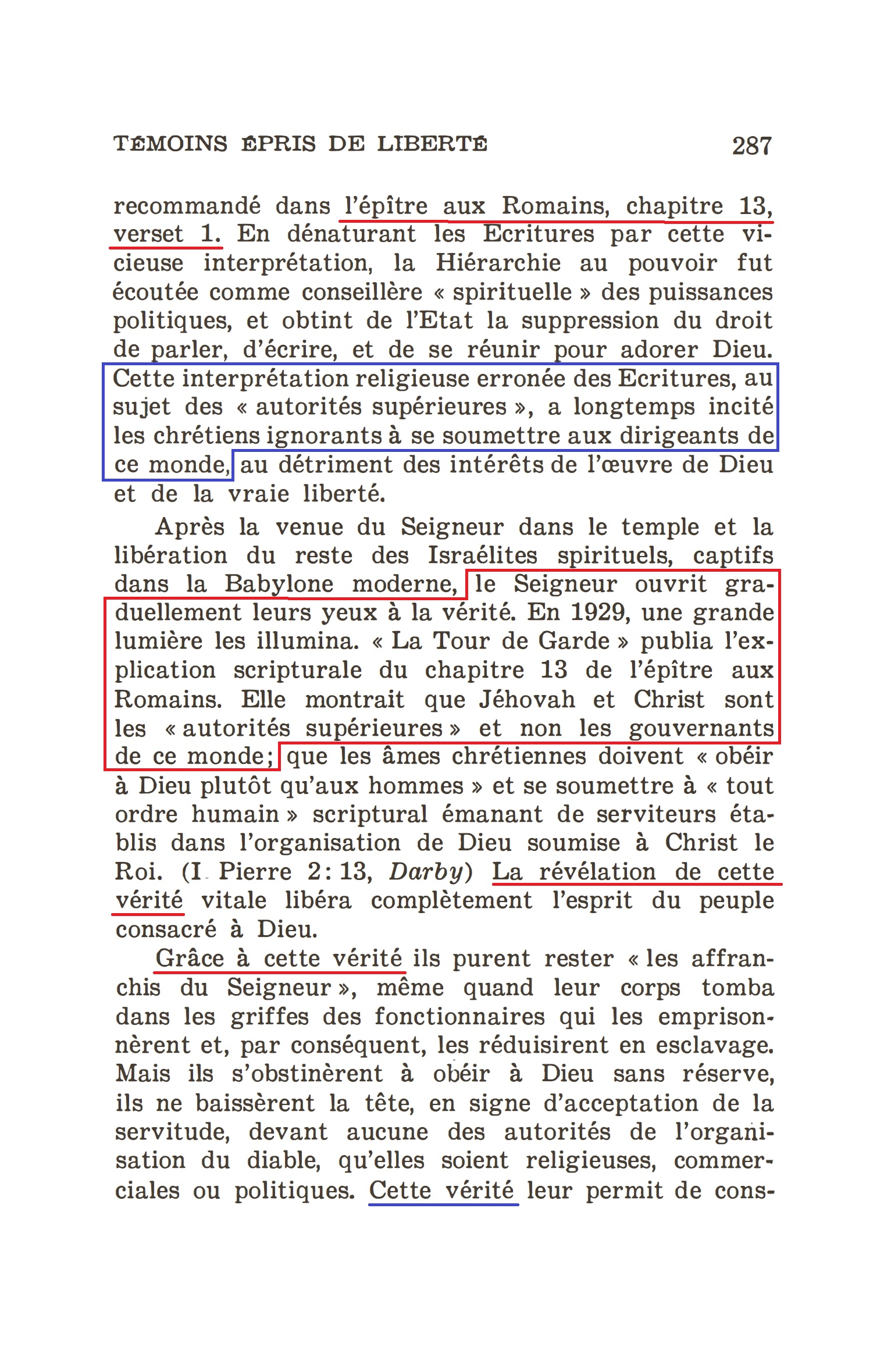 [...] à cause de la doctrine religieuse prévalant encore, selon laquelle les chefs de l'organisation visible de Satan sont les "autorités supérieures" auxquelles toutes les âmes chrétiennes doivent être soumises, comme cela est recommandé dans l'épître aux Romains, chapitre 13, verset 1 [...] Cette interprétation religieuse erronée des Ecritures, au sujet des "autorités supérieures", a longtemps incité les chrétiens ignorants à se soumettre aux dirigeant de ce monde, au détriment des intérêts de l'oeuvre de Dieu et de la vraie liberté. "La Tour de Garde" publia l'explication scripturale du chapitre 13 de l'épître aux Romains. Elle montrait que Jéhovah et Christ sont les "autorités supérieures" et non les gouvernants de ce monde "