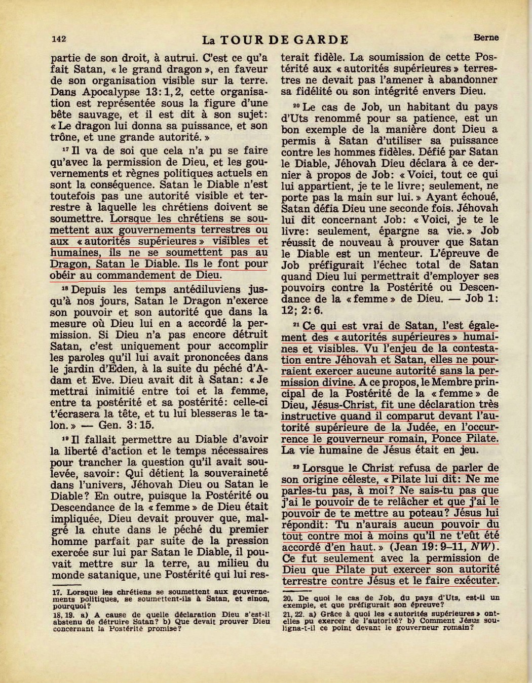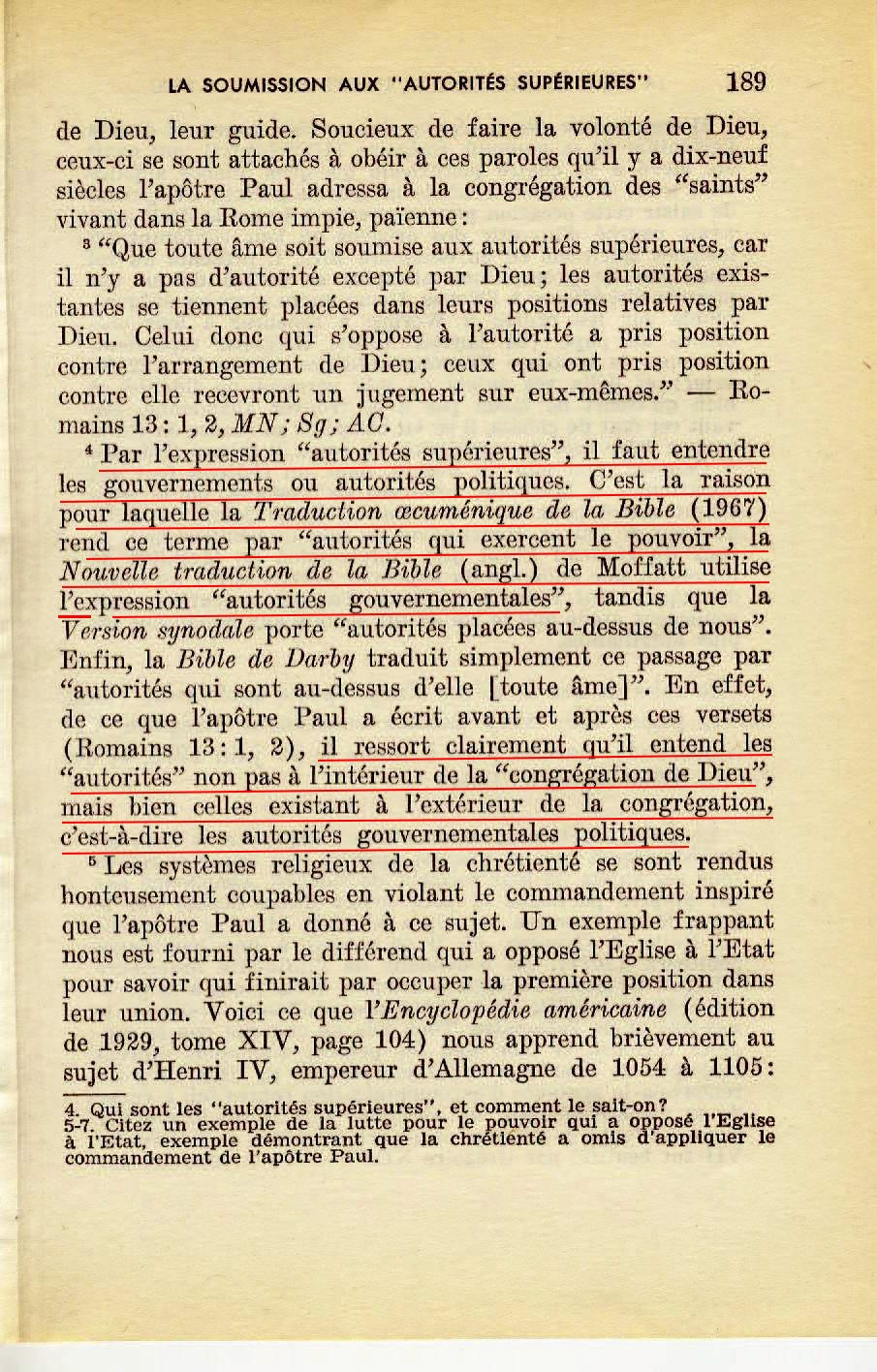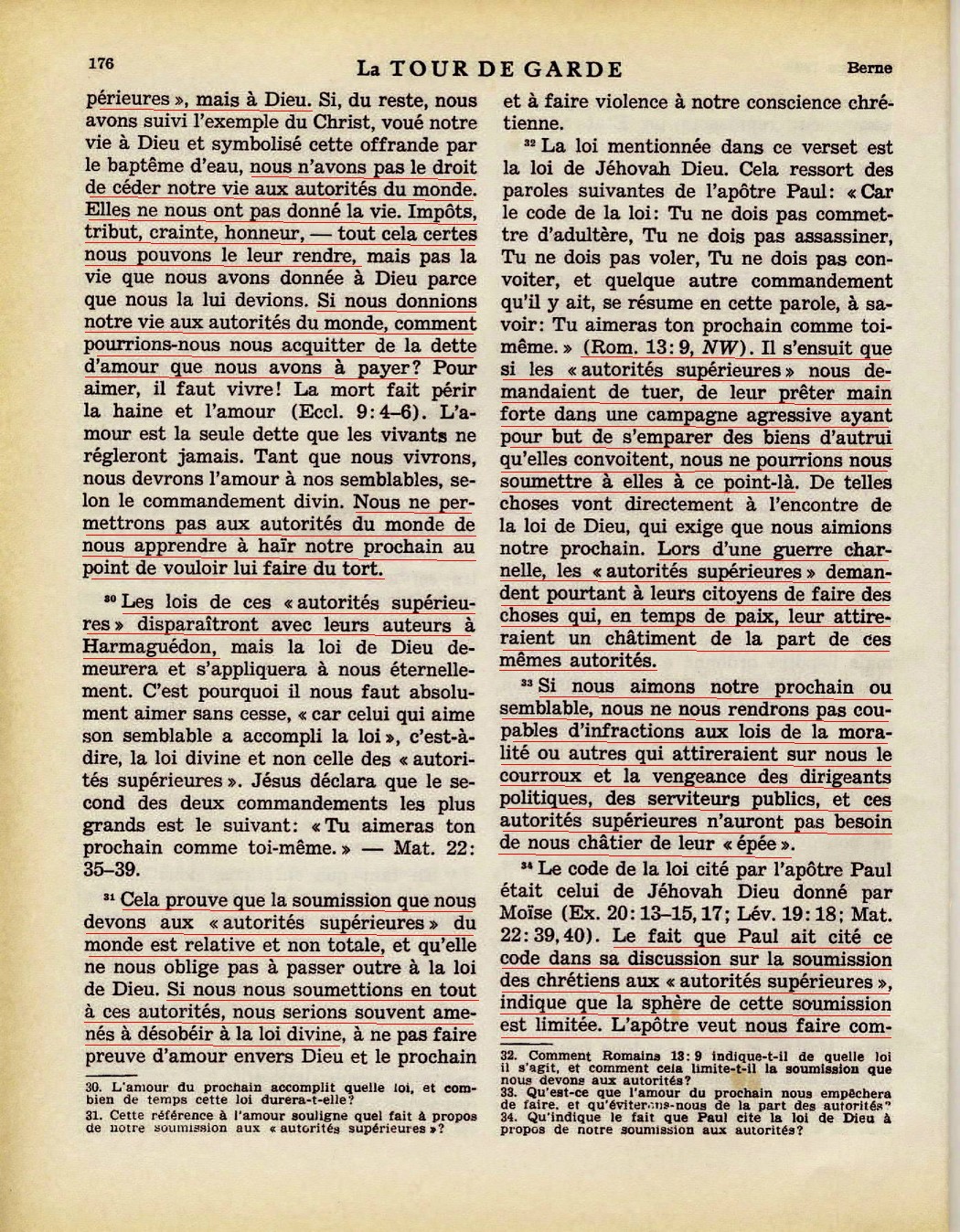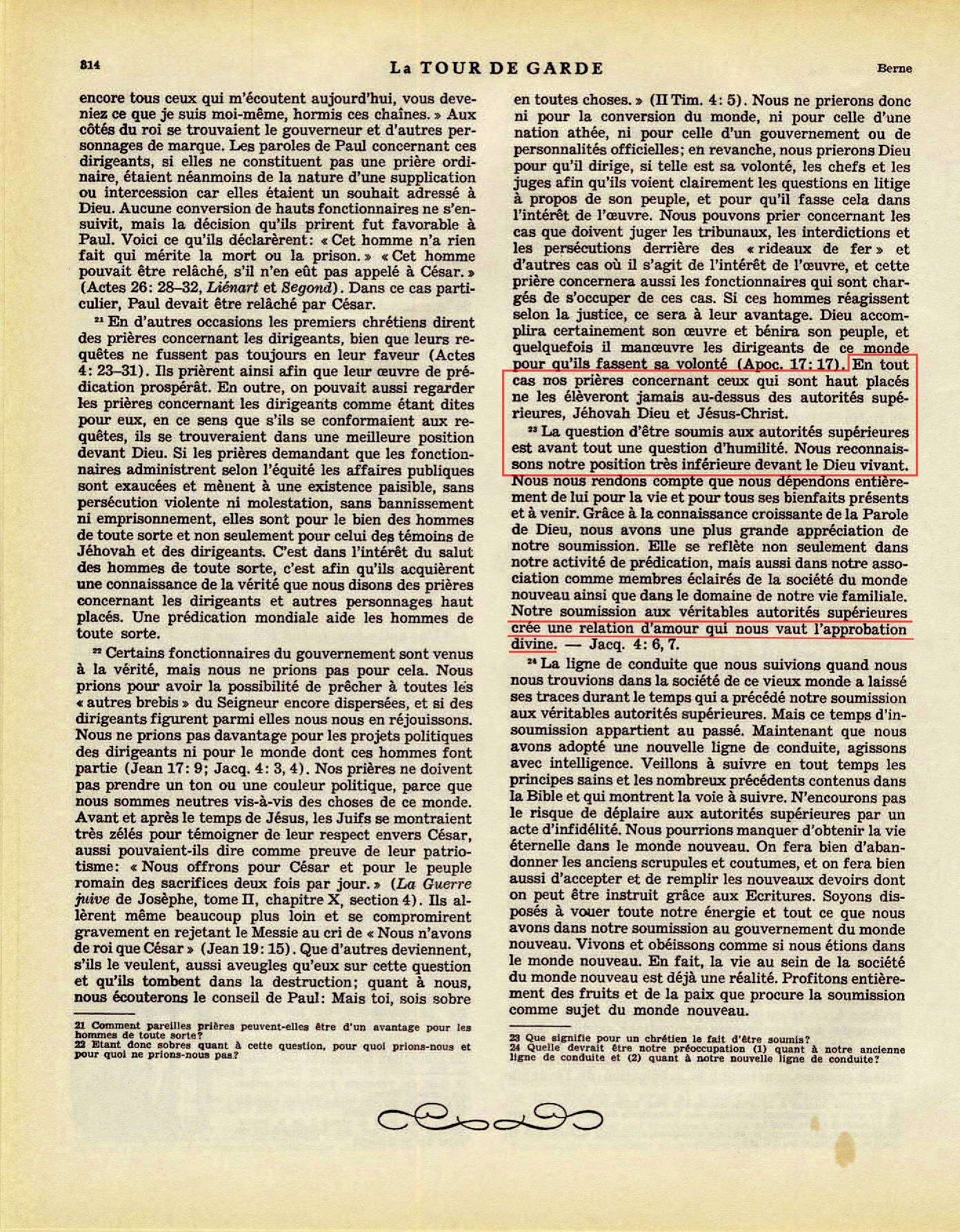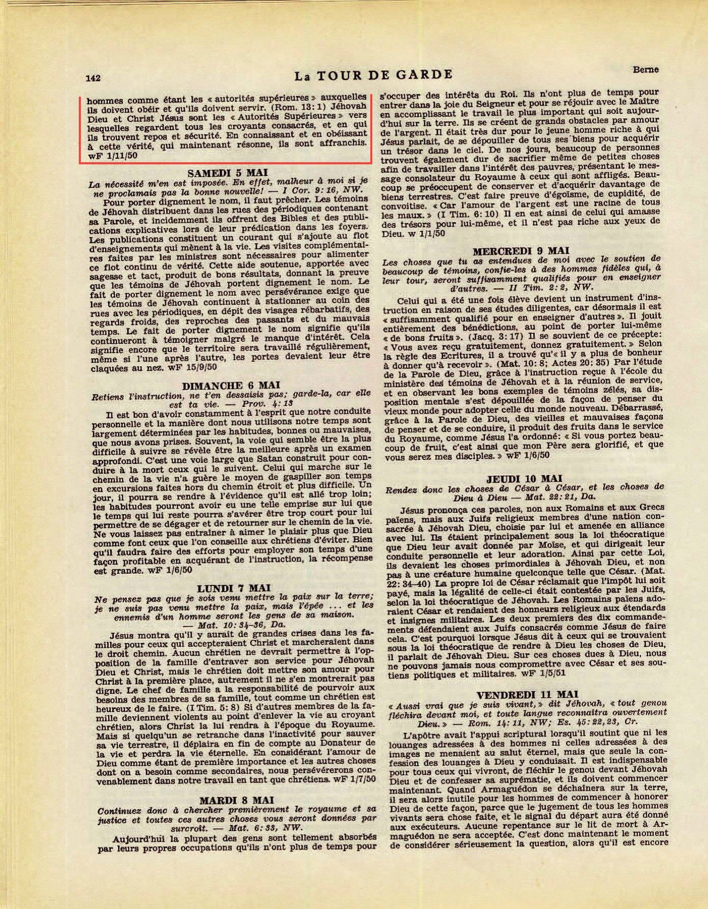[...] à cause de la doctrine religieuse prévalant encore, selon laquelle les chefs de l'organisation visible de Satan sont les "autorités supérieures" auxquelles toutes les âmes chrétiennes doivent être soumises, comme cela est recommandé dans l'épître aux Romains, chapitre 13, verset 1 [...] Cette interprétation religieuse erronée des Ecritures, au sujet des "autorités supérieures", a longtemps incité les chrétiens ignorants à se soumettre aux dirigeant de ce monde, au détriment des intérêts de l'oeuvre de Dieu et de la vraie liberté. "La Tour de Garde" publia l'explication scripturale du chapitre 13 de l'épître aux Romains. Elle montrait que Jéhovah et Christ sont les "autorités supérieures" et non les gouvernants de ce monde "