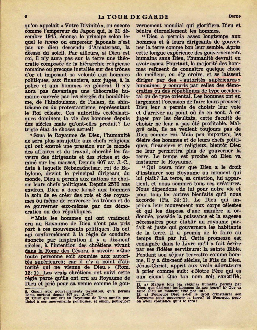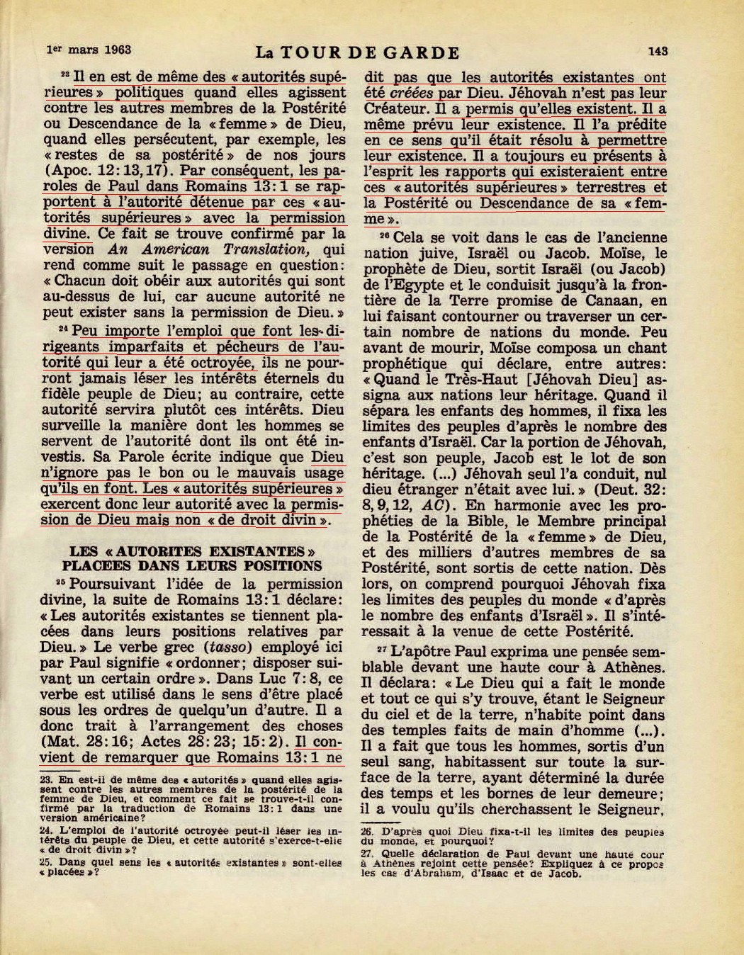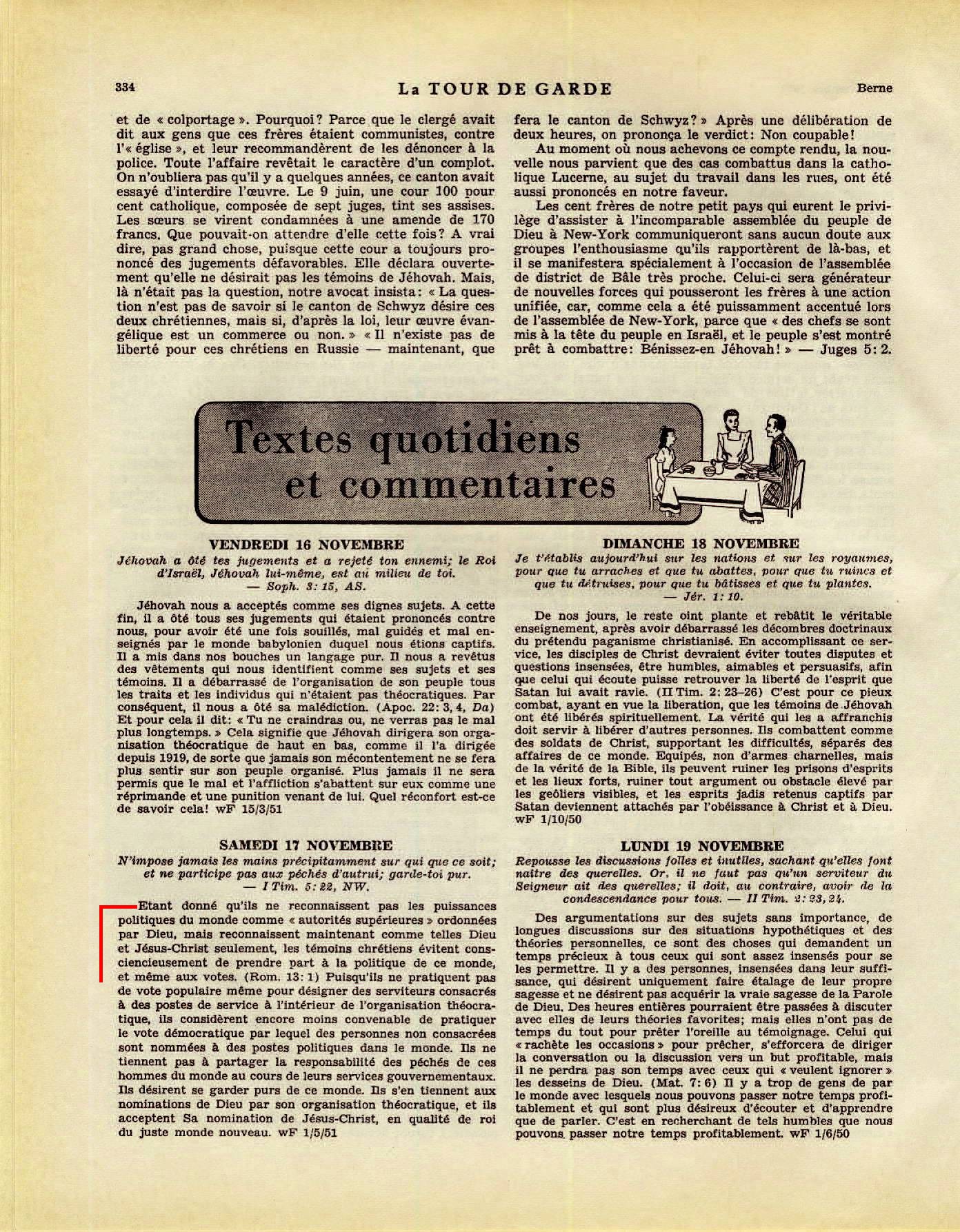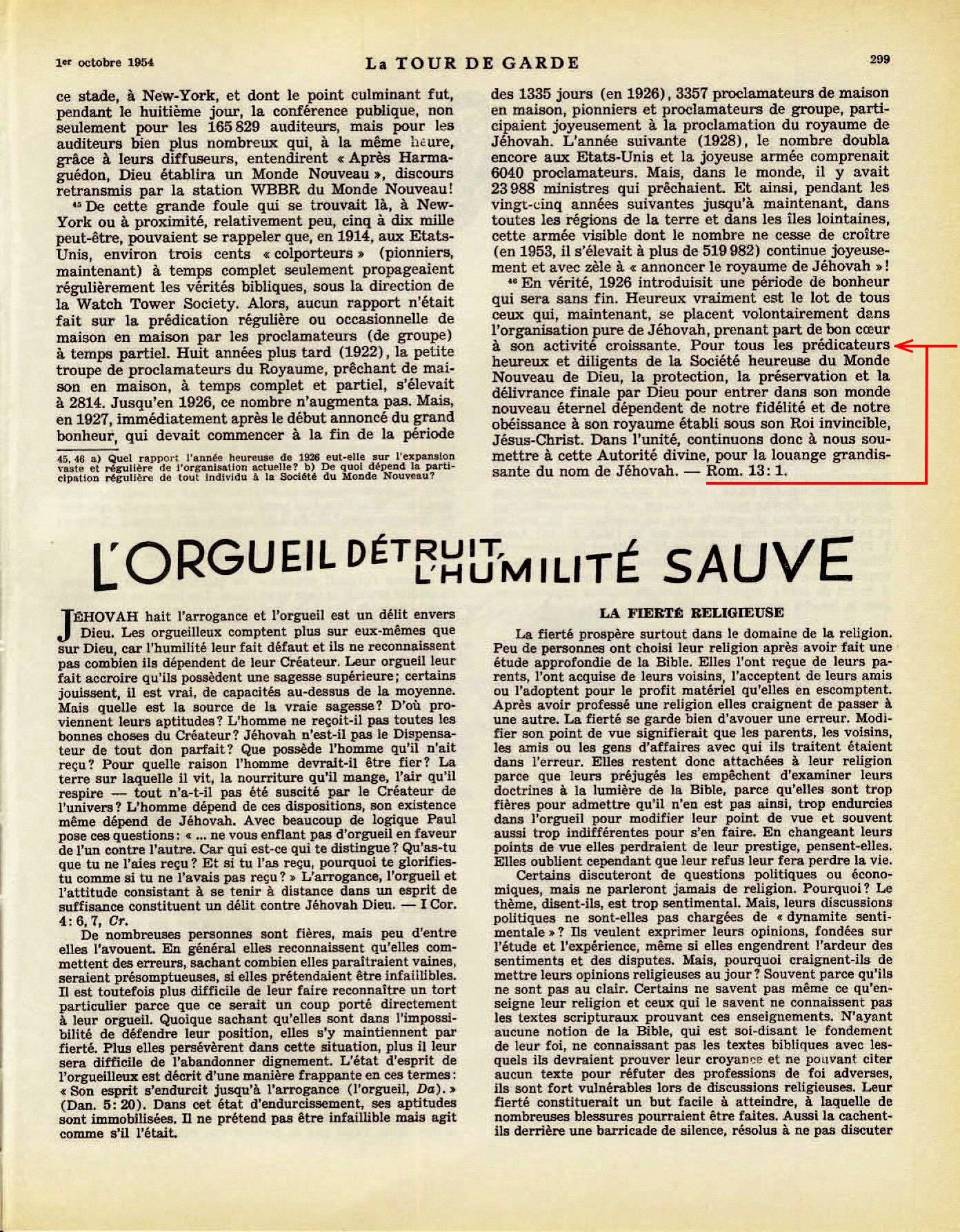 [...] à cause de la doctrine religieuse prévalant encore, selon laquelle les chefs de l'organisation visible de Satan sont les "autorités supérieures" auxquelles toutes les âmes chrétiennes doivent être soumises, comme cela est recommandé dans l'épître aux Romains, chapitre 13, verset 1 [...] Cette interprétation religieuse erronée des Ecritures, au sujet des "autorités supérieures", a longtemps incité les chrétiens ignorants à se soumettre aux dirigeant de ce monde, au détriment des intérêts de l'oeuvre de Dieu et de la vraie liberté. "La Tour de Garde" publia l'explication scripturale du chapitre 13 de l'épître aux Romains. Elle montrait que Jéhovah et Christ sont les "autorités supérieures" et non les gouvernants de ce monde "