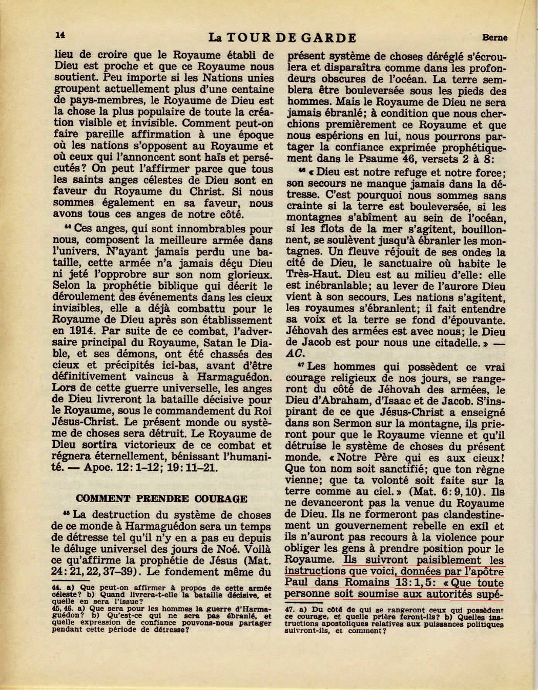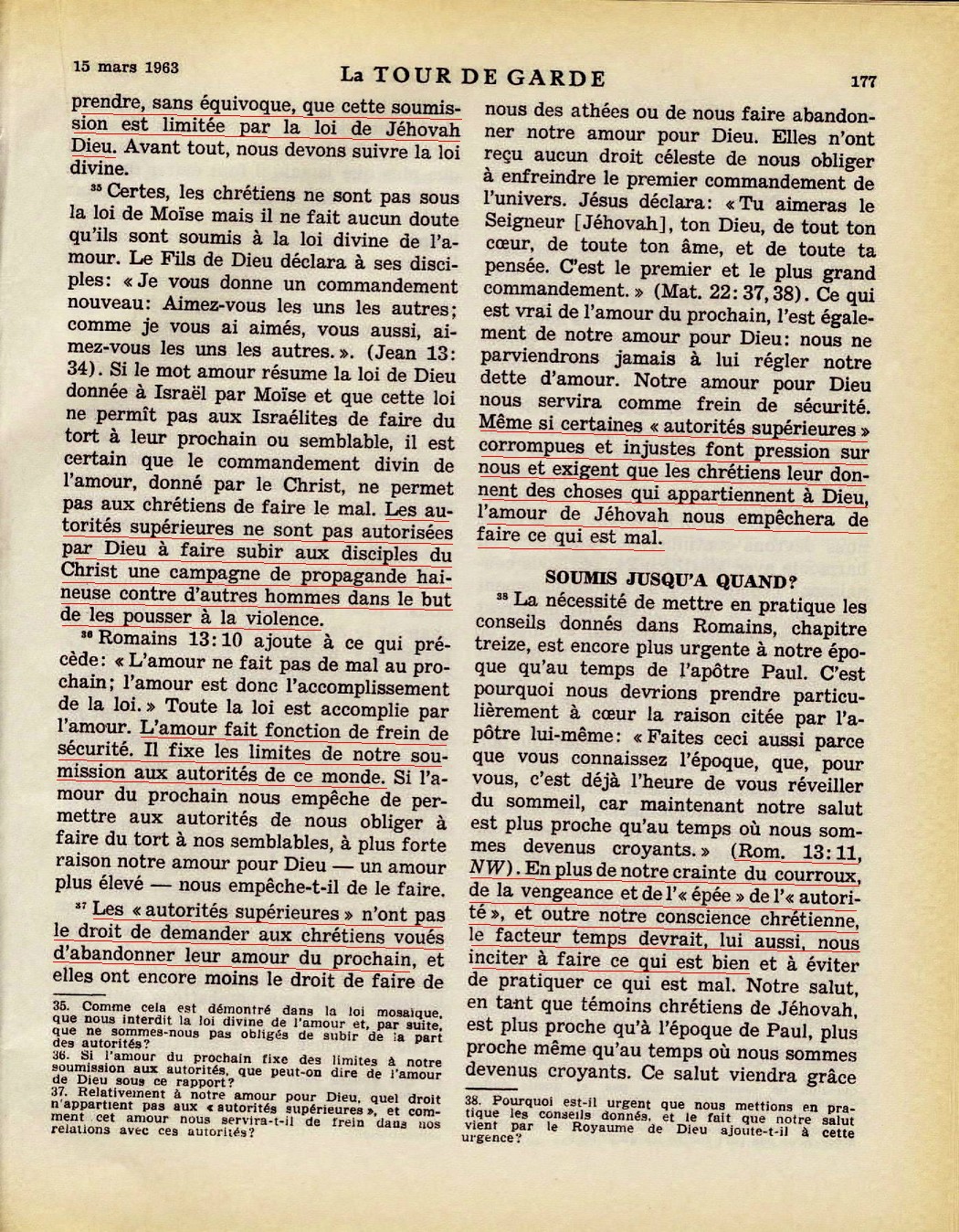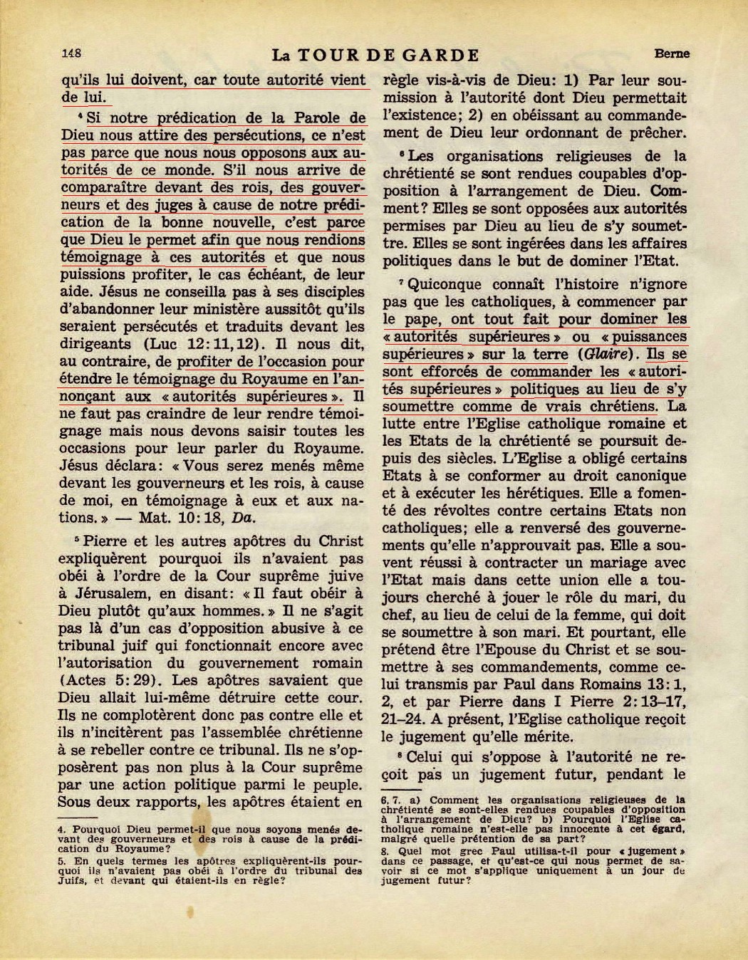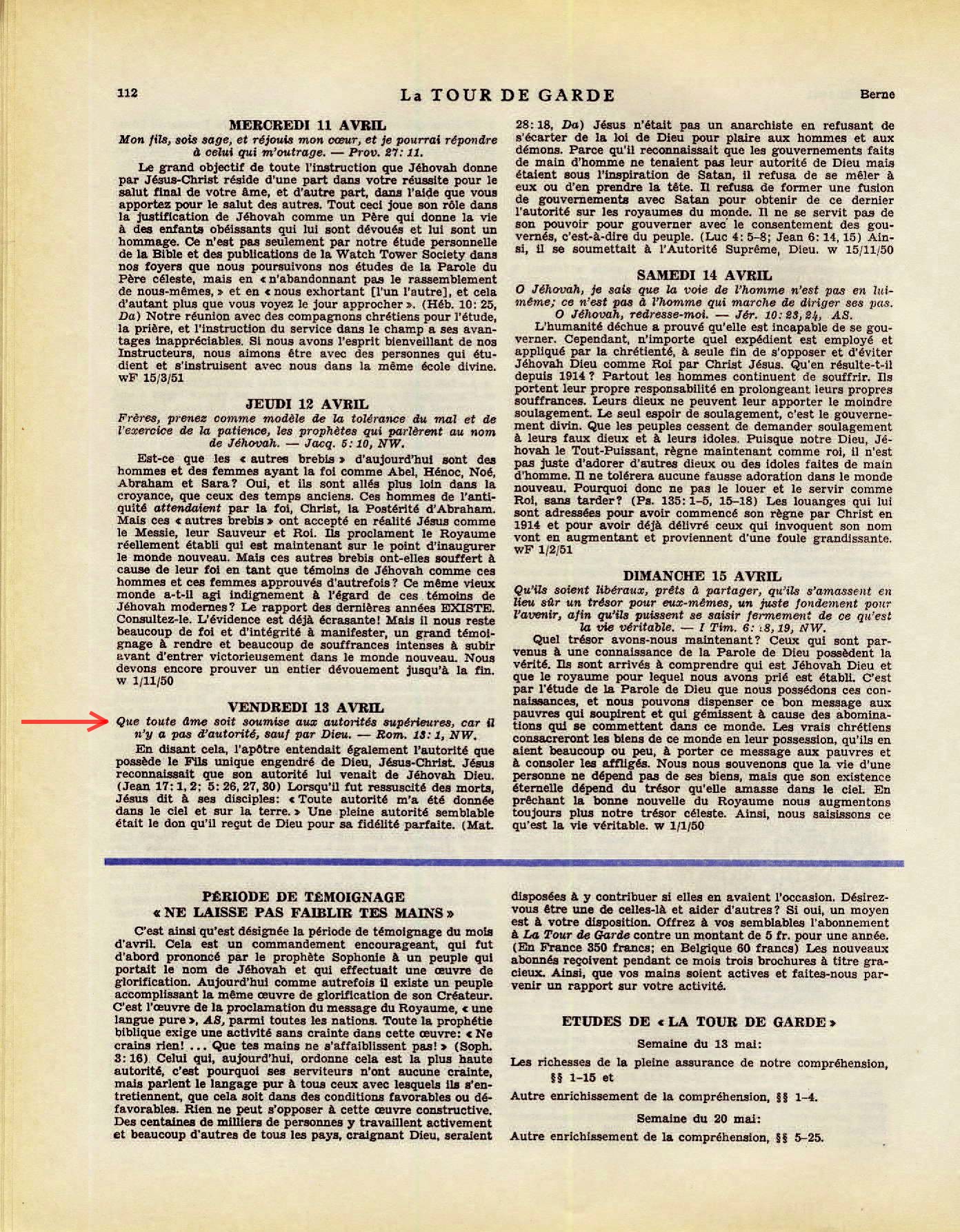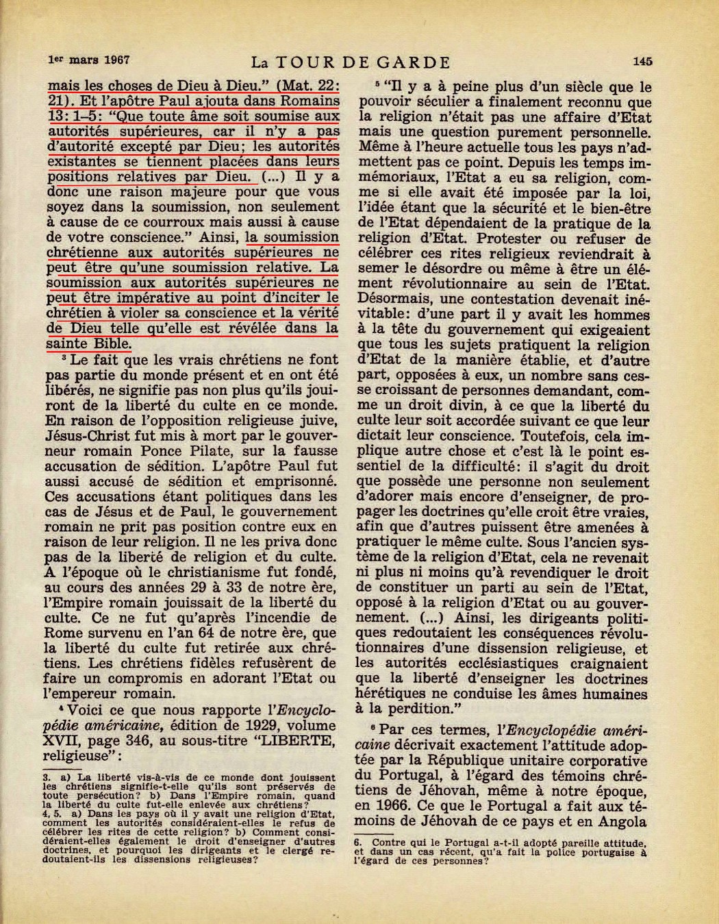 [...] à cause de la doctrine religieuse prévalant encore, selon laquelle les chefs de l'organisation visible de Satan sont les "autorités supérieures" auxquelles toutes les âmes chrétiennes doivent être soumises, comme cela est recommandé dans l'épître aux Romains, chapitre 13, verset 1 [...] Cette interprétation religieuse erronée des Ecritures, au sujet des "autorités supérieures", a longtemps incité les chrétiens ignorants à se soumettre aux dirigeant de ce monde, au détriment des intérêts de l'oeuvre de Dieu et de la vraie liberté. "La Tour de Garde" publia l'explication scripturale du chapitre 13 de l'épître aux Romains. Elle montrait que Jéhovah et Christ sont les "autorités supérieures" et non les gouvernants de ce monde "