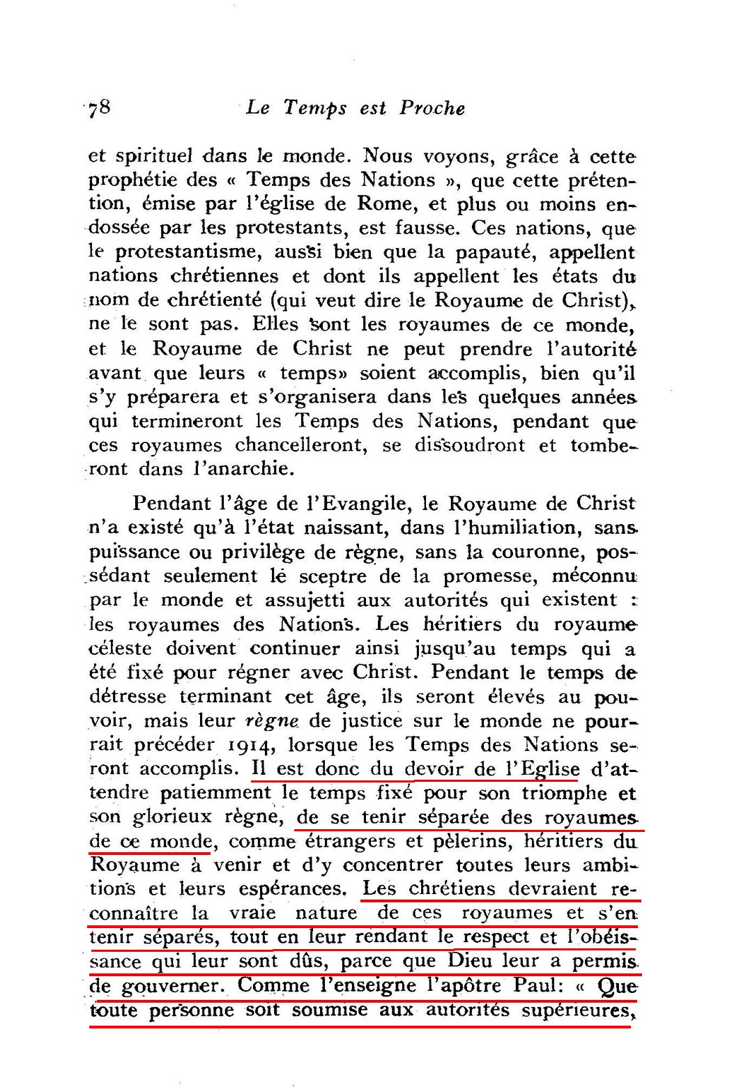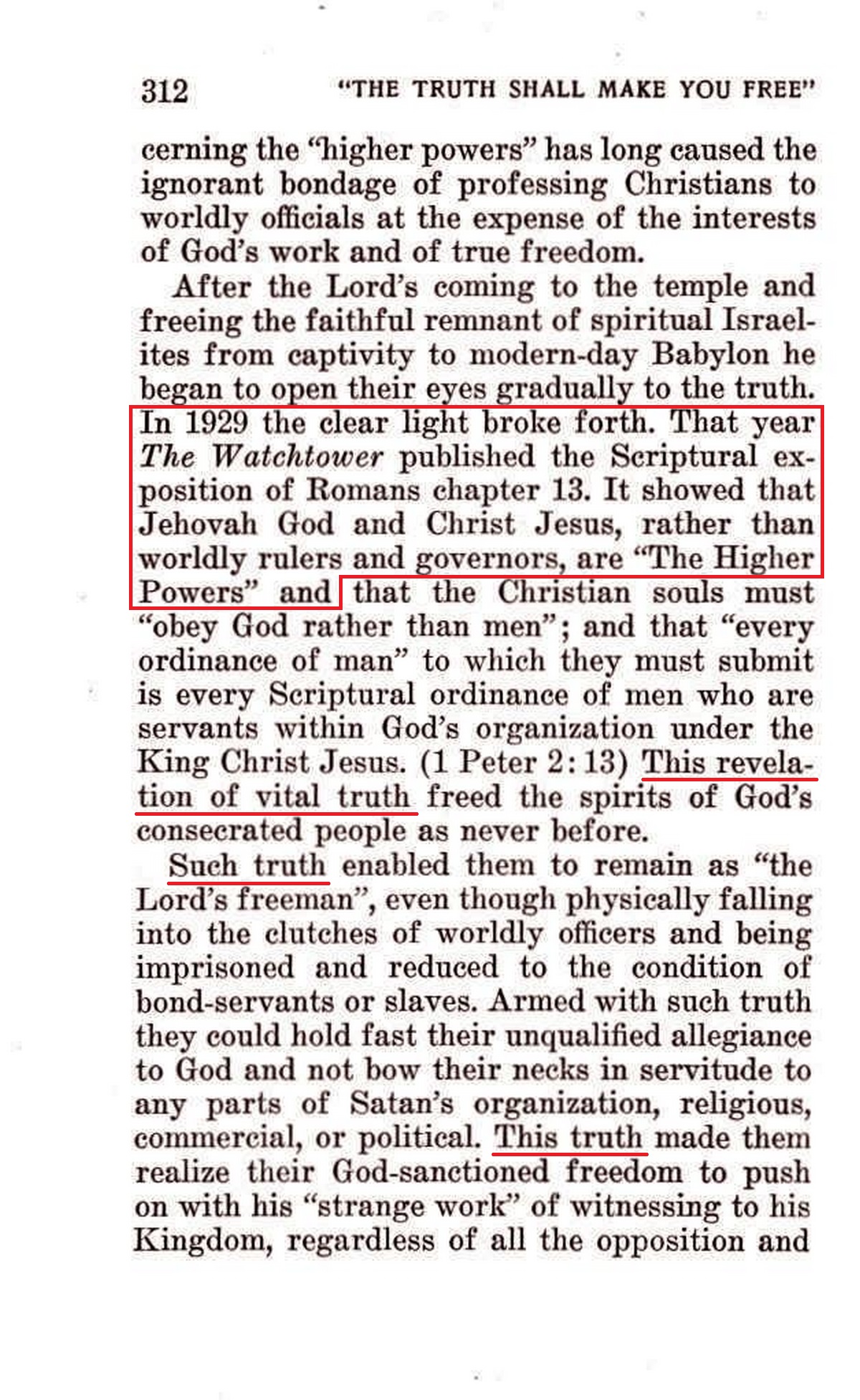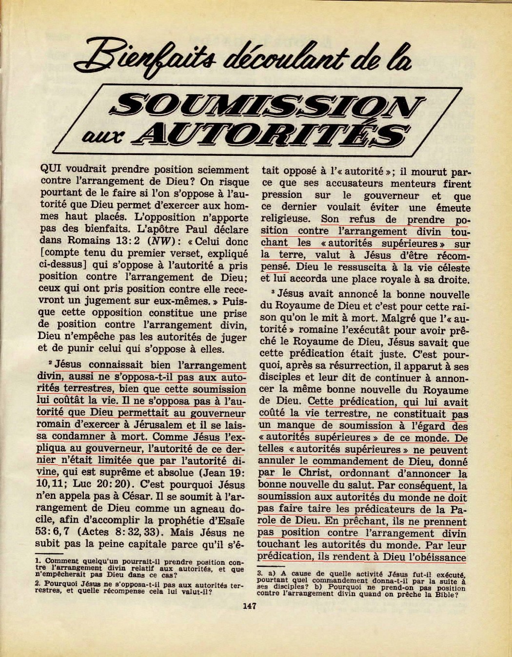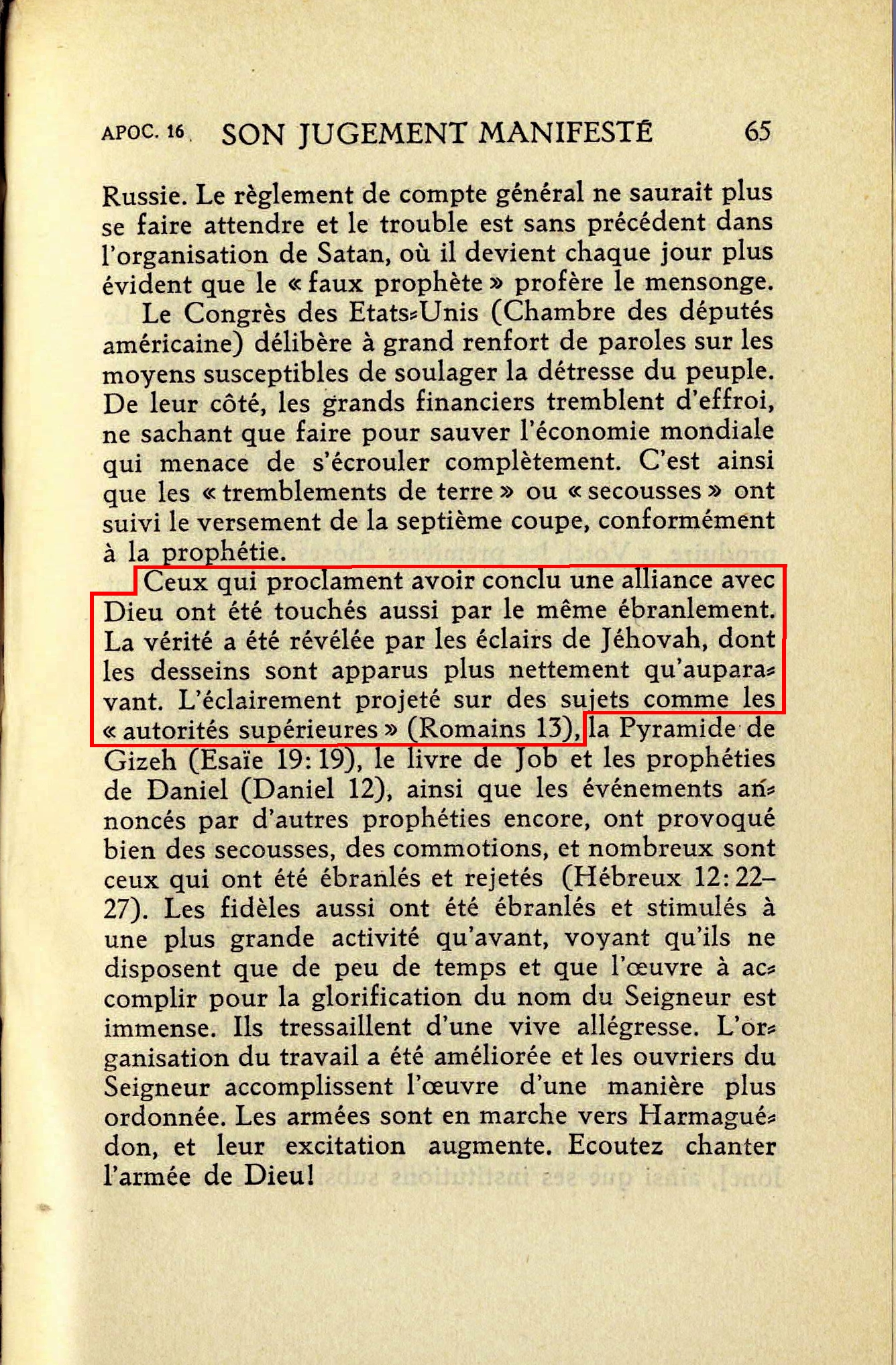 [...] à cause de la doctrine religieuse prévalant encore, selon laquelle les chefs de l'organisation visible de Satan sont les "autorités supérieures" auxquelles toutes les âmes chrétiennes doivent être soumises, comme cela est recommandé dans l'épître aux Romains, chapitre 13, verset 1 [...] Cette interprétation religieuse erronée des Ecritures, au sujet des "autorités supérieures", a longtemps incité les chrétiens ignorants à se soumettre aux dirigeant de ce monde, au détriment des intérêts de l'oeuvre de Dieu et de la vraie liberté. "La Tour de Garde" publia l'explication scripturale du chapitre 13 de l'épître aux Romains. Elle montrait que Jéhovah et Christ sont les "autorités supérieures" et non les gouvernants de ce monde "