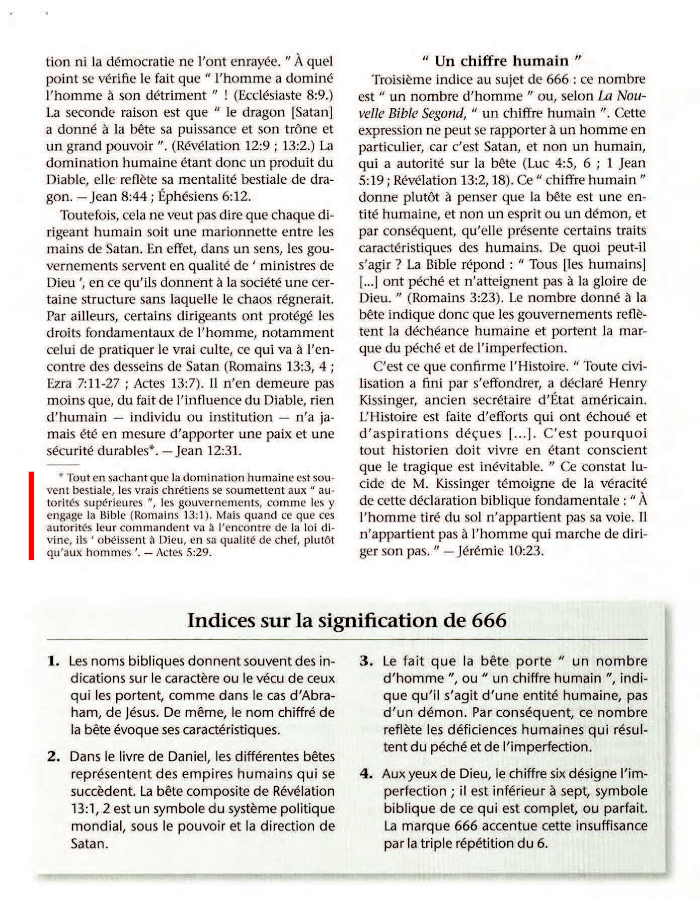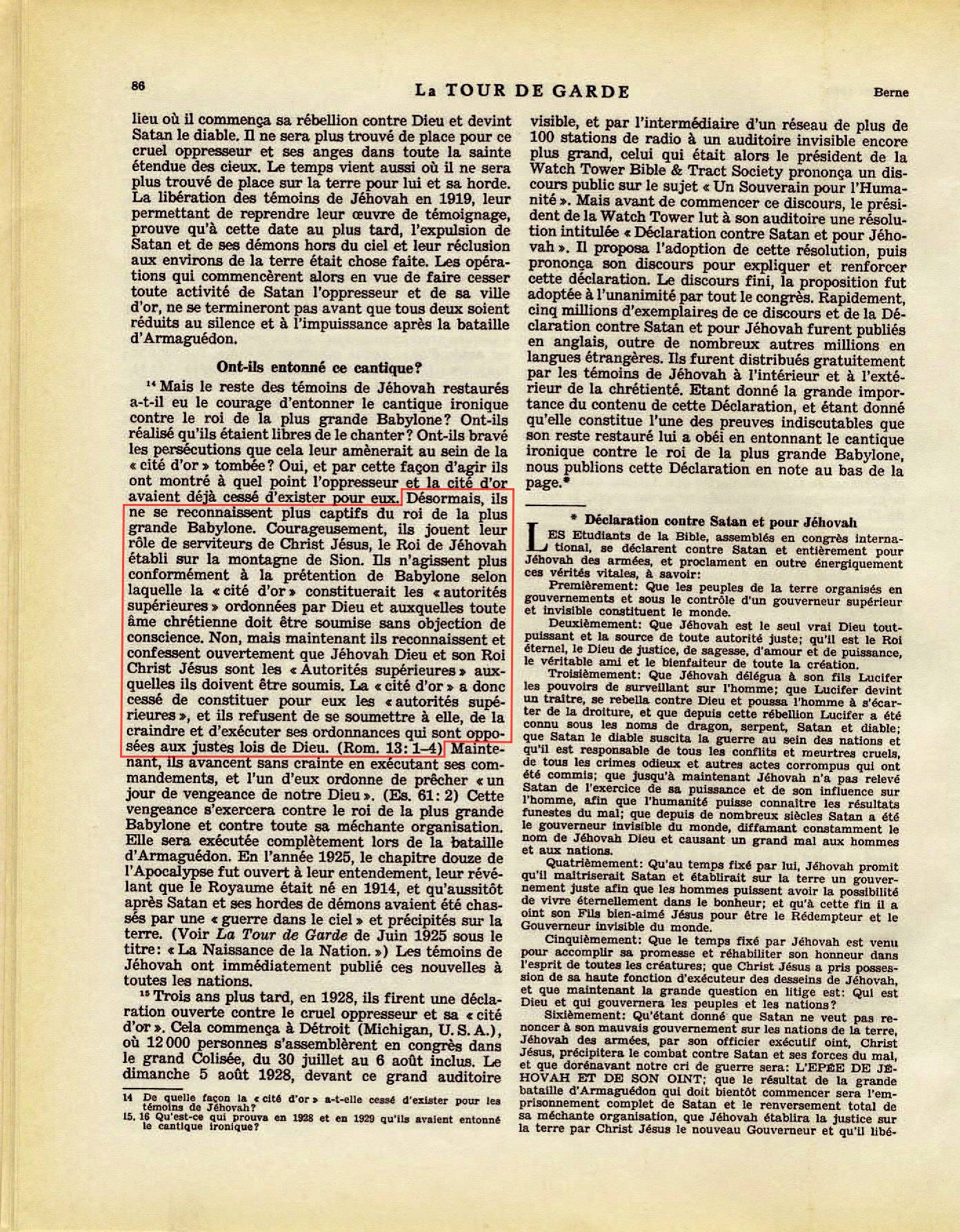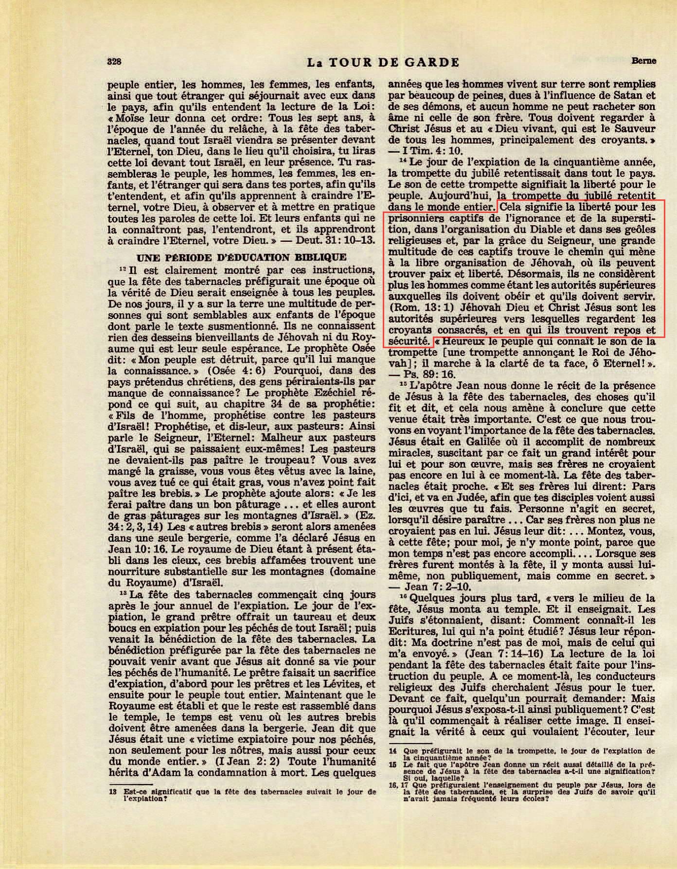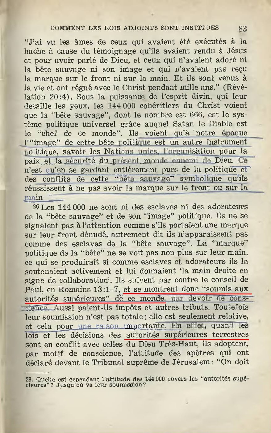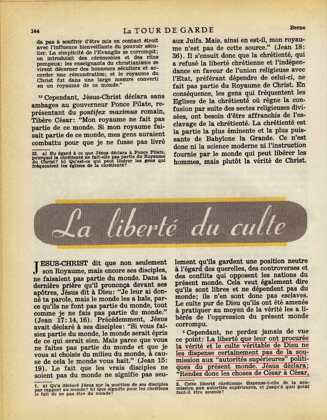 [...] à cause de la doctrine religieuse prévalant encore, selon laquelle les chefs de l'organisation visible de Satan sont les "autorités supérieures" auxquelles toutes les âmes chrétiennes doivent être soumises, comme cela est recommandé dans l'épître aux Romains, chapitre 13, verset 1 [...] Cette interprétation religieuse erronée des Ecritures, au sujet des "autorités supérieures", a longtemps incité les chrétiens ignorants à se soumettre aux dirigeant de ce monde, au détriment des intérêts de l'oeuvre de Dieu et de la vraie liberté. "La Tour de Garde" publia l'explication scripturale du chapitre 13 de l'épître aux Romains. Elle montrait que Jéhovah et Christ sont les "autorités supérieures" et non les gouvernants de ce monde "
