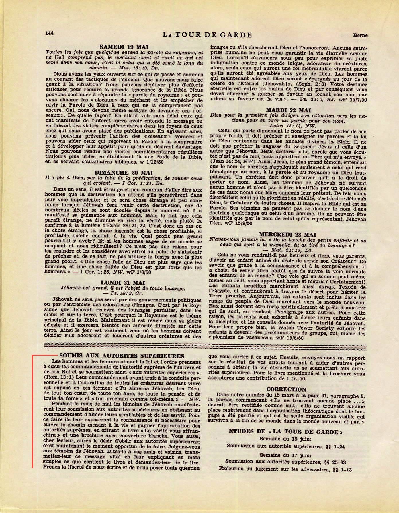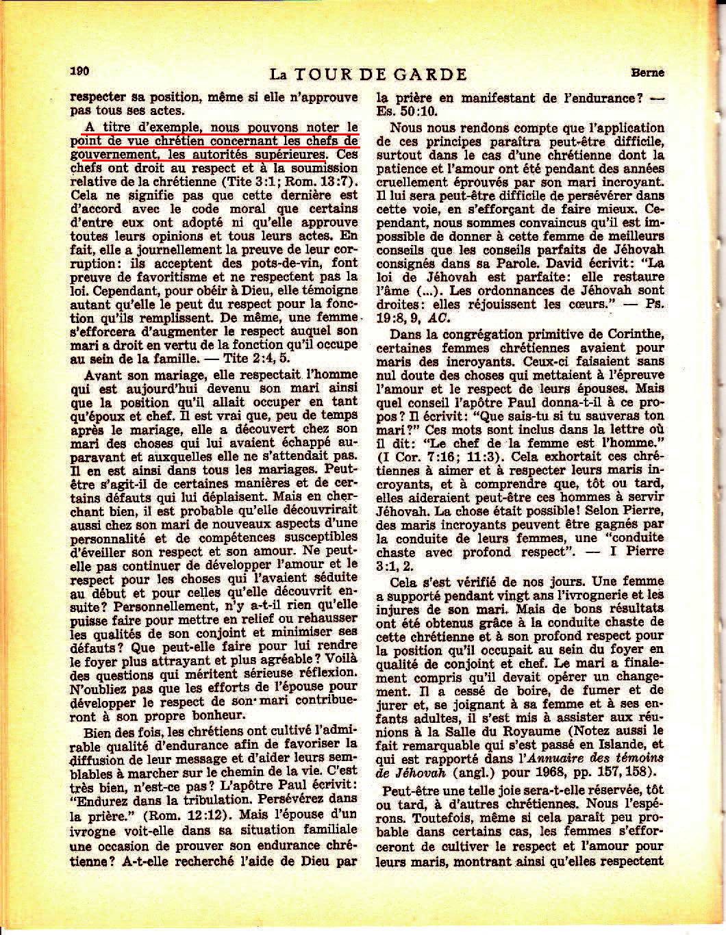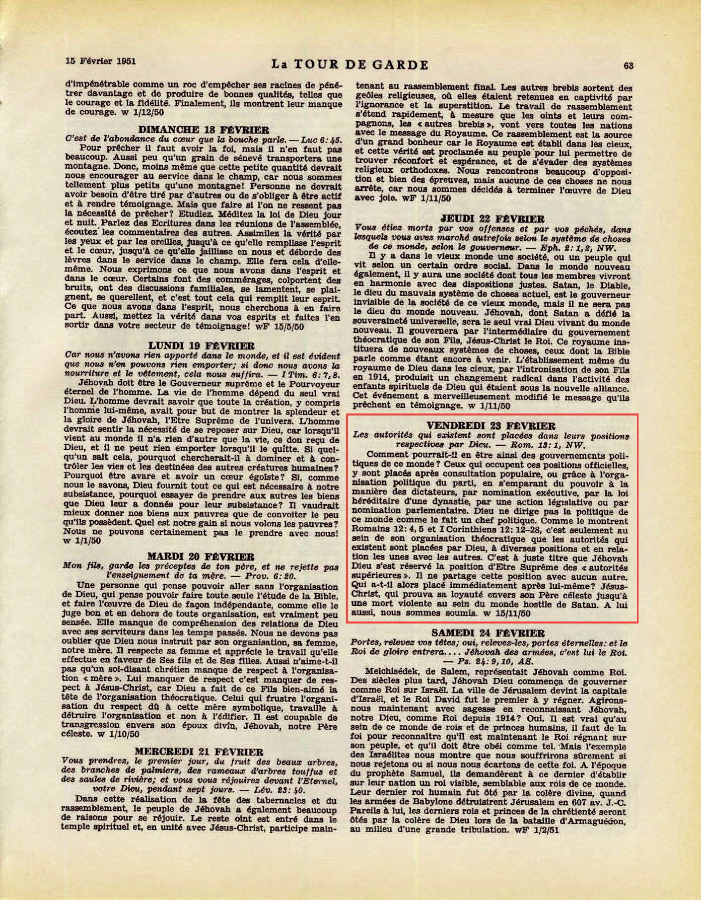 ... En considération des paroles de Jésus et des instructions des apôtres, cette ligne de conduite implique notre soumission aux "autorités supérieures". Ces autorités qui se trouvent au sein de l'organisation divine nous demandent la crainte et l'honneur. Source : 🇫🇷 La Tour de Garde, 15 Août 1951, page 255 + Cover |