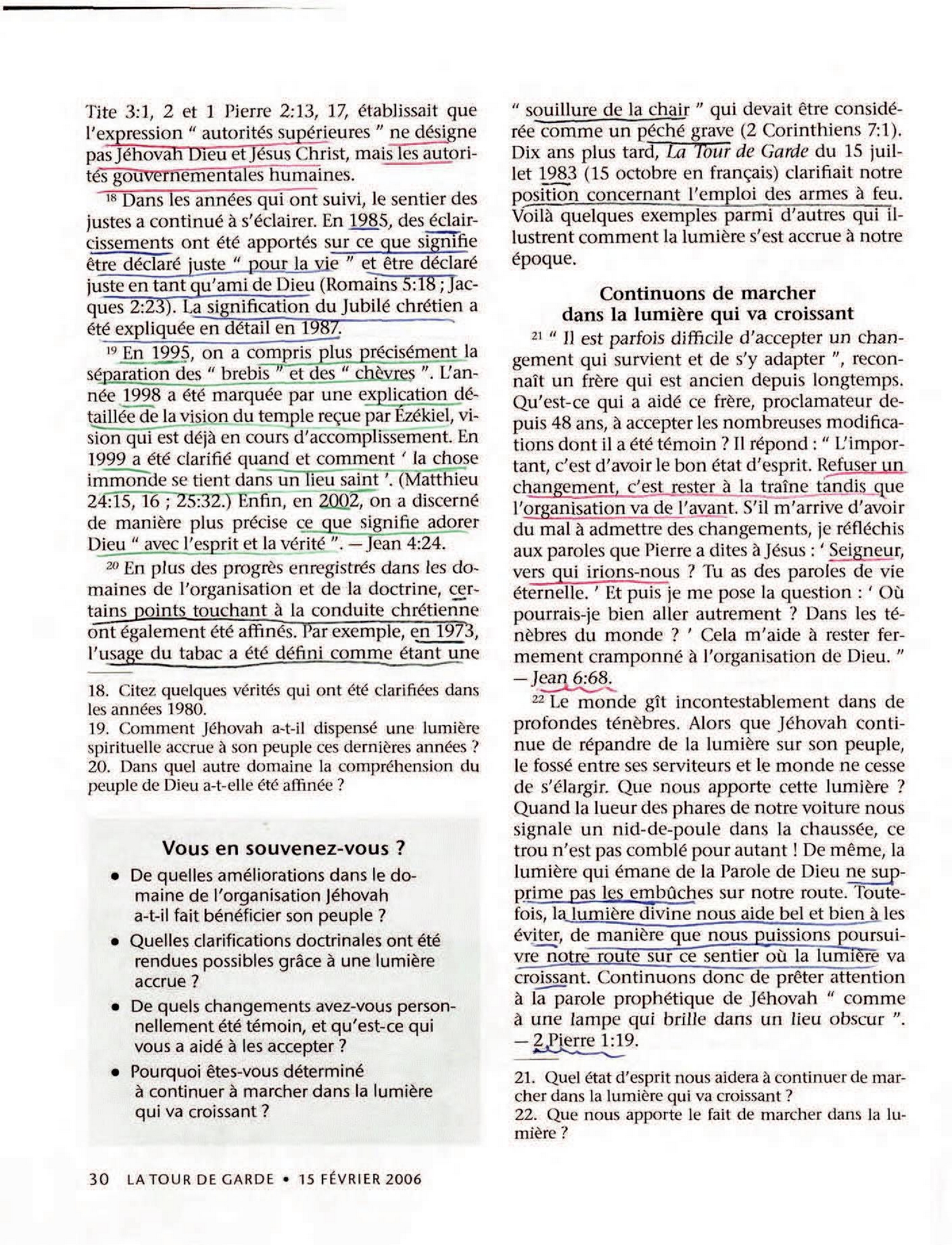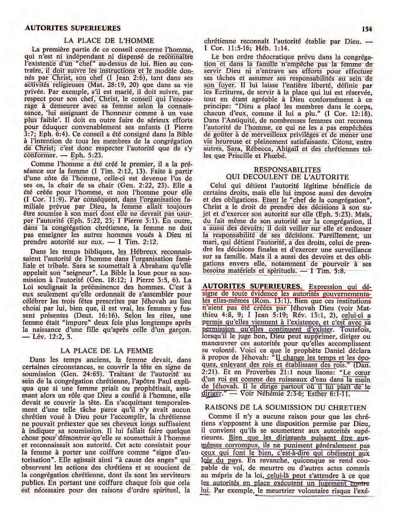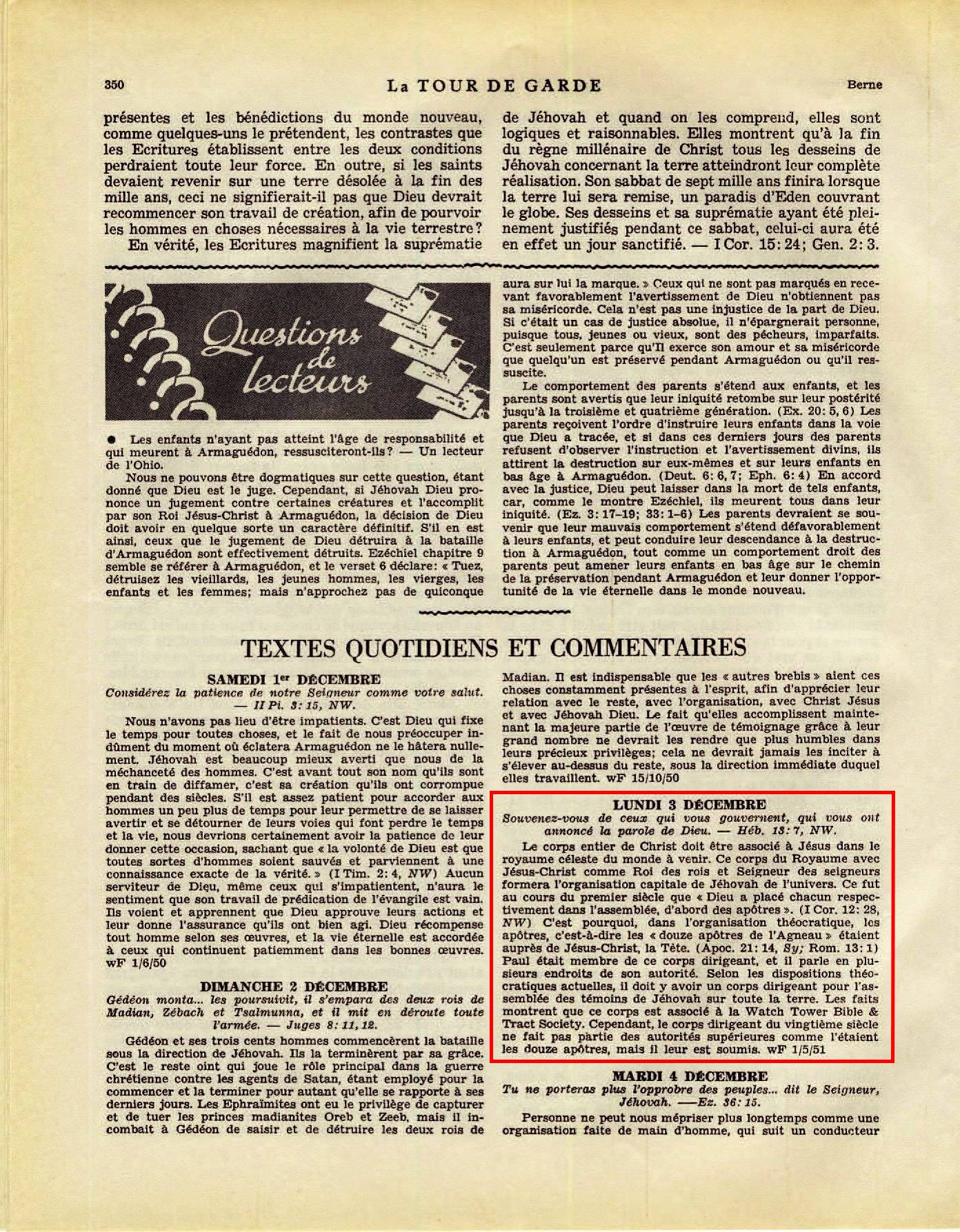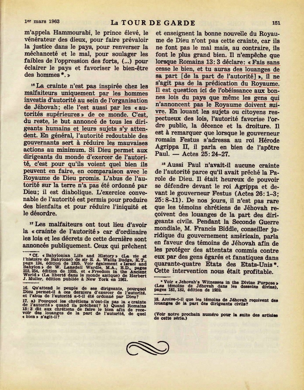 ... En considération des paroles de Jésus et des instructions des apôtres, cette ligne de conduite implique notre soumission aux "autorités supérieures". Ces autorités qui se trouvent au sein de l'organisation divine nous demandent la crainte et l'honneur. Source : 🇫🇷 La Tour de Garde, 15 Août 1951, page 255 + Cover |