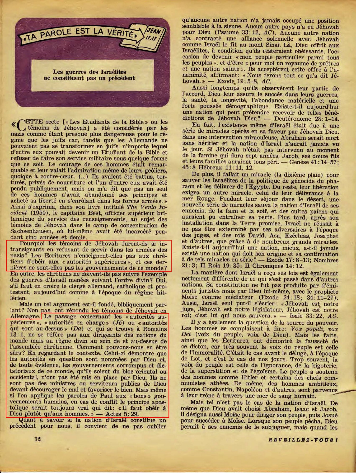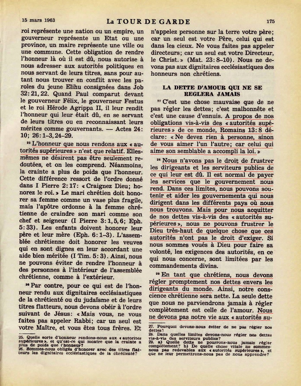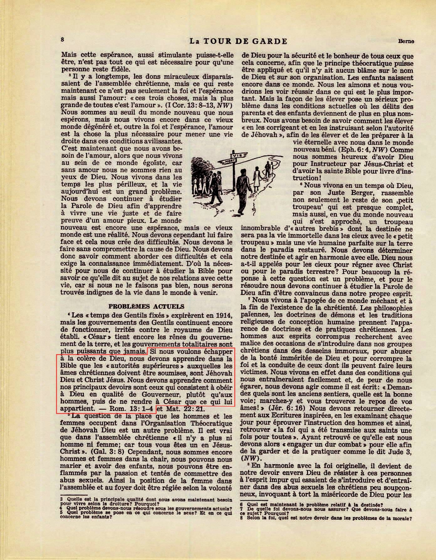 ... Le passage concernant les "autorités supérieures", "autorités en charge" (Jé) ou "autorités qui sont au-dessus" (Da) et qui se trouve à Romains 13:1, ne se réfère pas aux dirigeants des nations du monde mais au règne divin au sein de et au-dessus de l'assemblée chrétienne. Comment pouvons-nous en être sûrs ? En regardant le contexte. Celui-ci démontre que les autorités en question sont nommées par Dieu et, de toute évidence, les gouvernements corrompus et dictatoriaux de ce monde, qu'ils soient du bloc oriental ou occidental, n'ont pas été mis en place par Dieu. Ils ne sont pas des ministres ou serviteurs publics de Dieu devant décourager le mal et favoriser le bien. Mais même si l'on applique les paroles de Paul aux "bons" gouvernements humains, en cas de conflit le principe apostolique serait toujours vrai qui dit: "Il faut obéir à Dieu plutôt qu'aux hommes." - Actes 5:29. " Source : 🇫🇷 Reveillez-vous, 8 Septembre 1959, page 12 + Cover |