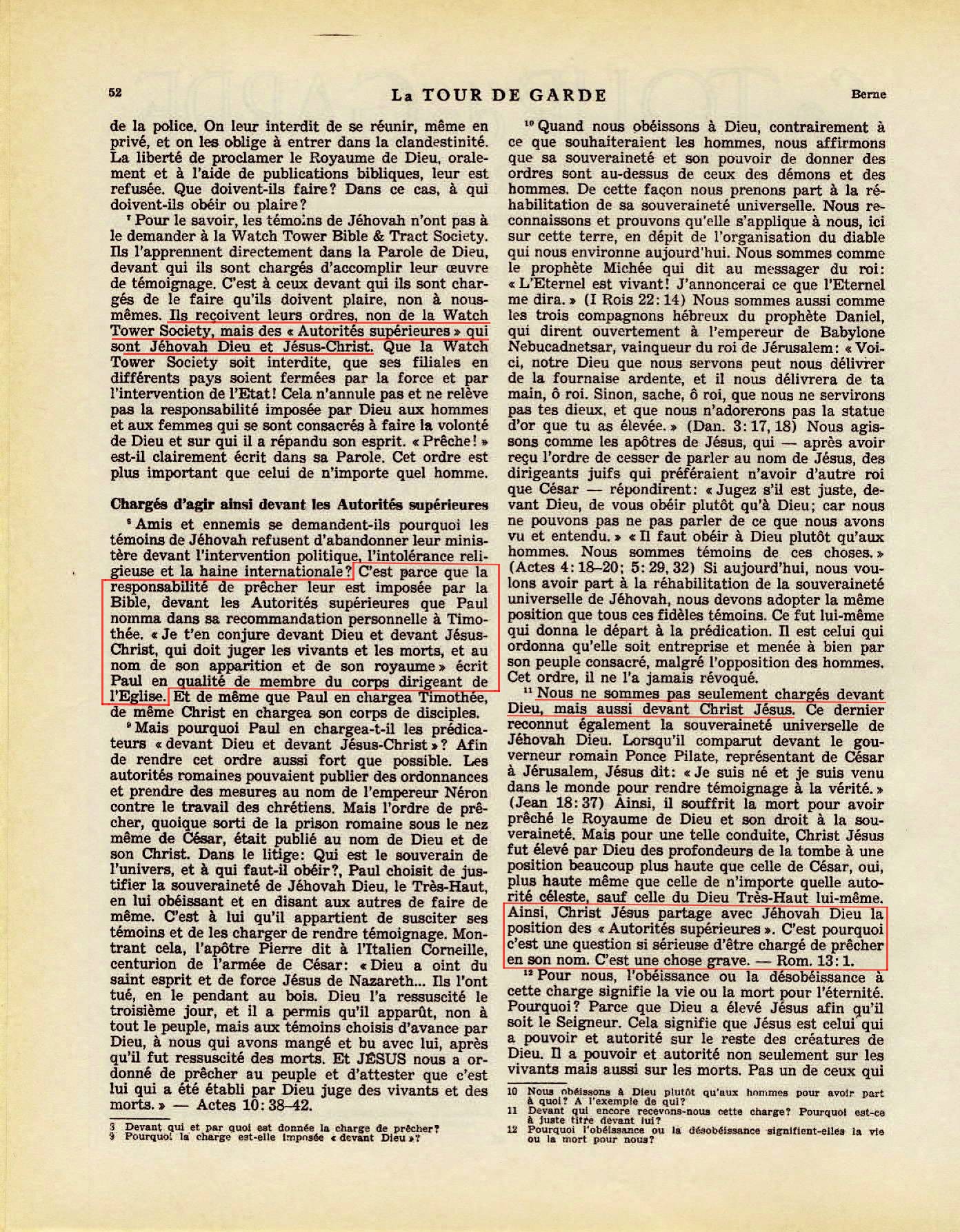 Ils reçoivent leurs ordres, non de la Watch Tower Society, mais des "Autorités supérieures" qui sont Jéhovah Dieu et Jésus-Christ.... C'est parce que la responsabilité de prêcher leur est imposée par la Bible, devant les Autorités supérieures que Paul nomma dans sa recommandantion personnelle à Timothée. "Je t'en conjure devant Dieu et devant Jésus-Christ, qui doit juger les vivants et les morts, et au nom de son apparition et de son royaume" écrit Paul en qualité de membre du corps dirigeant de l'Eglise... Nous ne sommes pas seulement chargés devant Dieu, mais aussi devant Christ Jésus... Ainsi Christ Jésus partage avec Jéhovah Dieu la position des "Autorités supérieures". C'est pourquoi c'est une question si sérieuse d'être chargé de prêcher en son nom. C'est une chose grave. Rom 13:1.