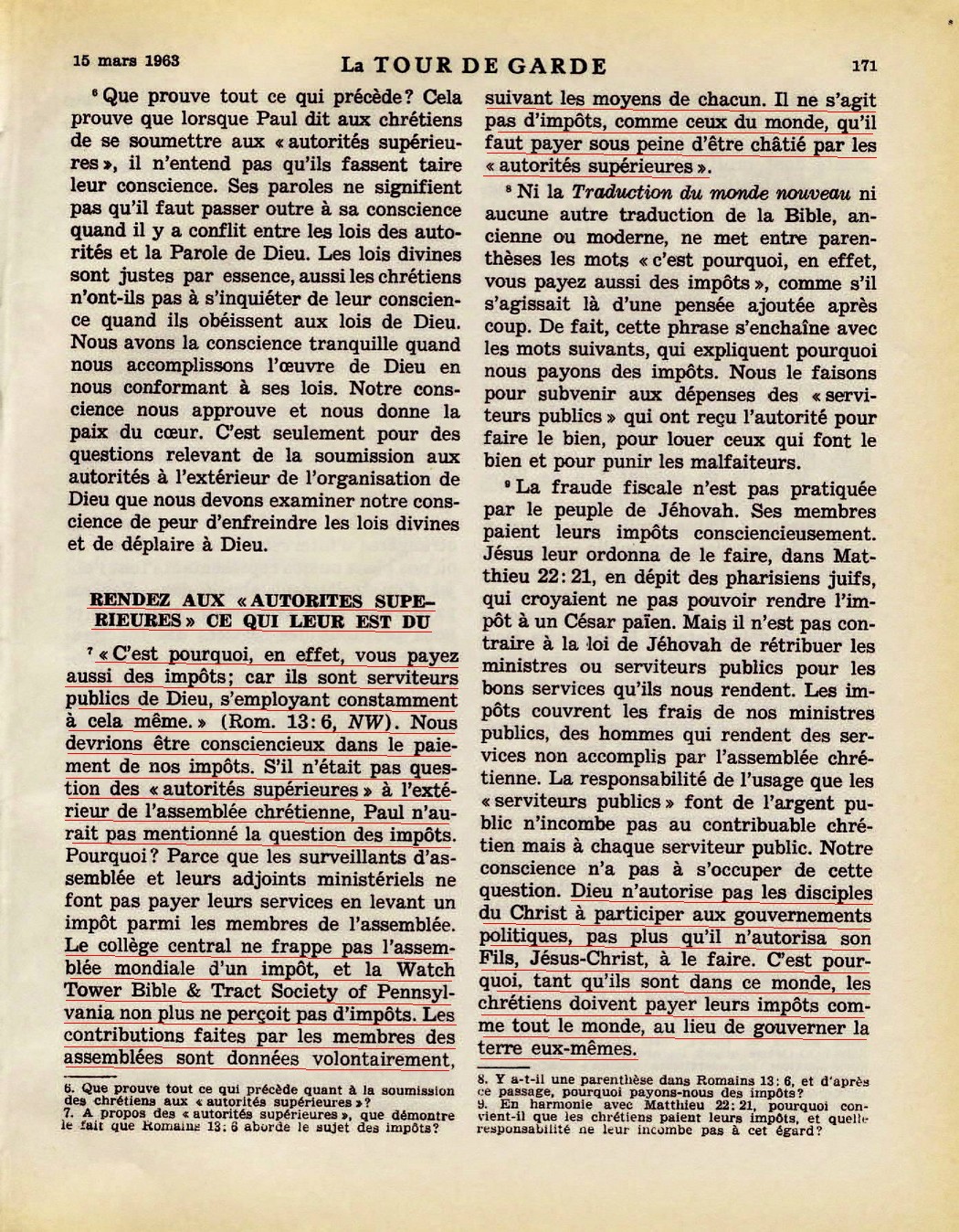 " C'est pourquoi, en effet, vous payez des impôts; car ils sont serviteurs publics de Dieu, s'employant constamment à cela même. " (Rom. 13:6, NW). Nous devrions être consciencieux dans le paiement de nos impôts. S'il n'était pas question des "autorités supérieures" à l'extérieur de l'assemblée chrétienne, Paul n'aurait pas mentionné la question des impôts... Le collège central ne frappe pas l'assemblée mondiale d'un impôt, et la Watch Tower Bible & Tract Society of Pennsylvania non plus ne perçoit pas d'impôts. Les contributions faites par les membres des assemblées sont données volontairement, suivant les moyens de chacun. Il ne s'agit pas d'impôts, comme ceux du monde, qu'il faut payer sous peine d'être châtié par les "autorités supérieures"... Dieu n'autorise pas les disciples du Christ à participer aux gouvernements politiques, pas plus qu'il n'autorisa son Fils, Jésus-Christ, à le faire. C'est pourquoi, tant qu'ils sont dans ce monde, les chrétiens doivent payer leurs impôts comme tout le monde, au lieu de gouverner la terre eux-mêmes.