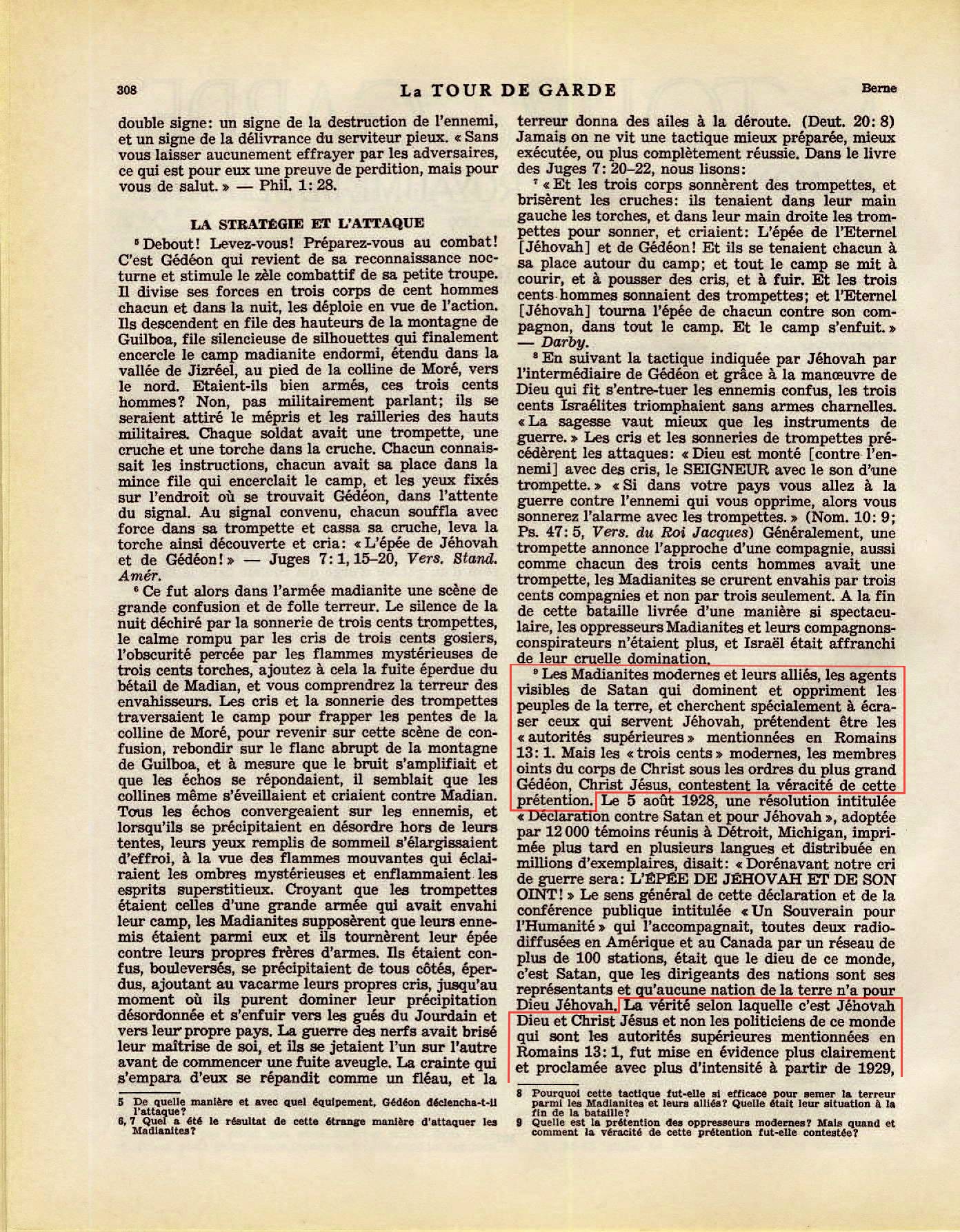 Les Madianites modernes et leurs alliés, les agents visibles de Satan qui dominent et oppriment les peuples de la terre, et cherchent spécialement à écraser ceux qui servent Jéhovah, prétendent être les "autorités supérieures" mentionnées en Romains 13:1. Mais les "trois cents" modernes, les membres oints du corps de Christ sous les ordres du plus grand Gédéon, Christ Jésus, contestent la véracité de cette prétention... La vérité selon laquelle c'est Jéhovah Dieu et Christ Jésus et non les politiciens de ce monde qui sont les autorités supérieures mentionnées en Romains 13:1, fut mise en évidence plus clairement et proclamée avec plus d'intensité à partir de 1929, surtout dans les numéros de "La Tour de Garde" du 1er et du 15 Juin de cette année-là (édition anglaise) Les apôtres ne considéraient pas les politiciens de ce monde comme les "autorités supérieures" du commerce, de la politique et de la fausse religion, aussi bien que les puissances des démons invisibles... Aussi, ce fut avec cette vérité relative aux véritables "autorités supérieures", qu'à partir de 1928, les témoins de Jéhovah attaquèrent les Madianites modernes... Le fait de savoir que Dieu et Christ sont les AUTORITES Supérieures, mit en déroute et détruisit, en ce qui concernait l'adoration de Jéhovah, le pouvoir des autorités de ce monde sur les chrétiens... Les conducteurs du monde se disputent, se querellent, luttent entre eux et s'entretuent. Leurs actions même prouvent qu'il ne peuvent pas être les "autorités supérieures"