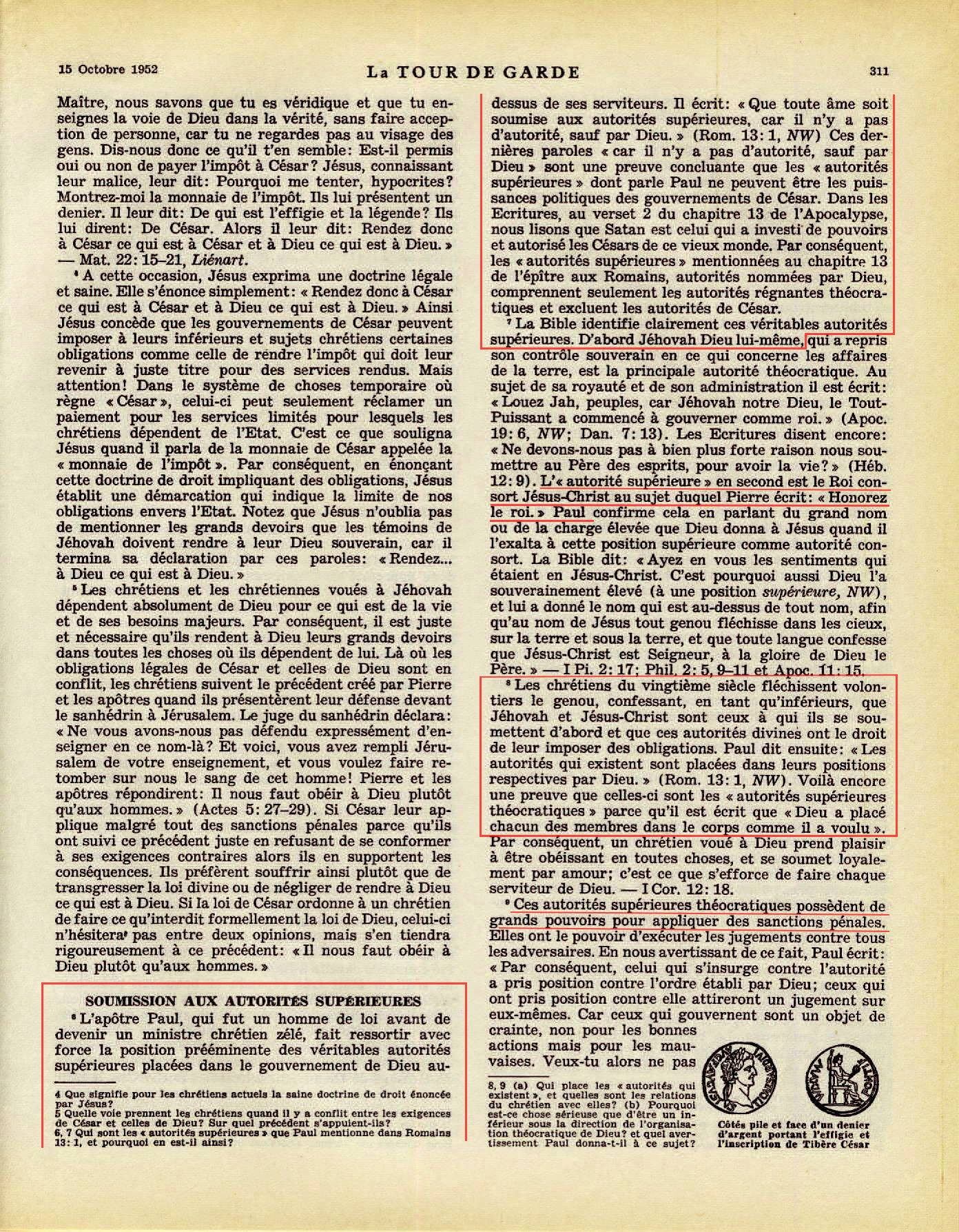L'apôtre Paul, qui fut un homme de loi avant de devenir un ministre chrétien zélé, fait ressortir avec force la position prééminente des véritables autorités supérieures placées dans le gouvernement de Dieu au-dessus de ses serviteurs. Il écrit: "Que toute âme soit soumise aux autorités supérieures, car il n'y a pas d'autorité, sauf par Dieu." (Rom. 13:1, NW) Ces dernières paroles "car il n'y a pas d'autorité, sauf par Dieu" sont une preuve concluante que les "autorités supérieures" dont parle Paul ne peuvent être les puissances politiques des gouvernements de César Dans les Ecritures, au verset 2 du chapitre 13 de l'Apocalypse, nous lisons que Satan est celui qui a investi de pouvoirs et autorité les Cesars de ce vieux monde. Par conséquent, les "autorités supérieures" mentionnées au chapitre 13 de l'épître aux Romains, autorités nommées par Dieu, comprennent seulement les autorités régnantes théocratiques et excluent les autorités de César. La Bible identifie clairement ces veritables autorités supérieures. D'abord Jéhovah Dieu lui-même,... L'"autorité supérieure" en second est le roi consort Jésus-Christ au sujet duquel Pierre écrit: "Honorez le roi" Paul confirme cela... Les chrétiens du vingtième siècle fléchissent volontiers le genou, confessant, en tant qu'inférieurs, que Jéhovah et Jésus Christ sont ceux à qui ils se soumettent d'abord et que ces autorités divines ont le droit de leur imposer des obligations. Paul dit ensuite: "Les autorités qui existent sont placées dans leurs positions respectives par Dieu." (Rom. 13:1, NW). Voilà encore une preuve que celles-ci sont les "autorités supérieures théocratiques" parce qu'il est écrit que "Dieu à placé chacun des membres dans le corps comme il a voulu". Ces autorités supérieures théocratiques possèdent de grands pouvoirs pour appliquer des sanctions pénales. Source : 🇫🇷 La Tour de Garde, 15 Octobre 1952, page 311 + Cover |