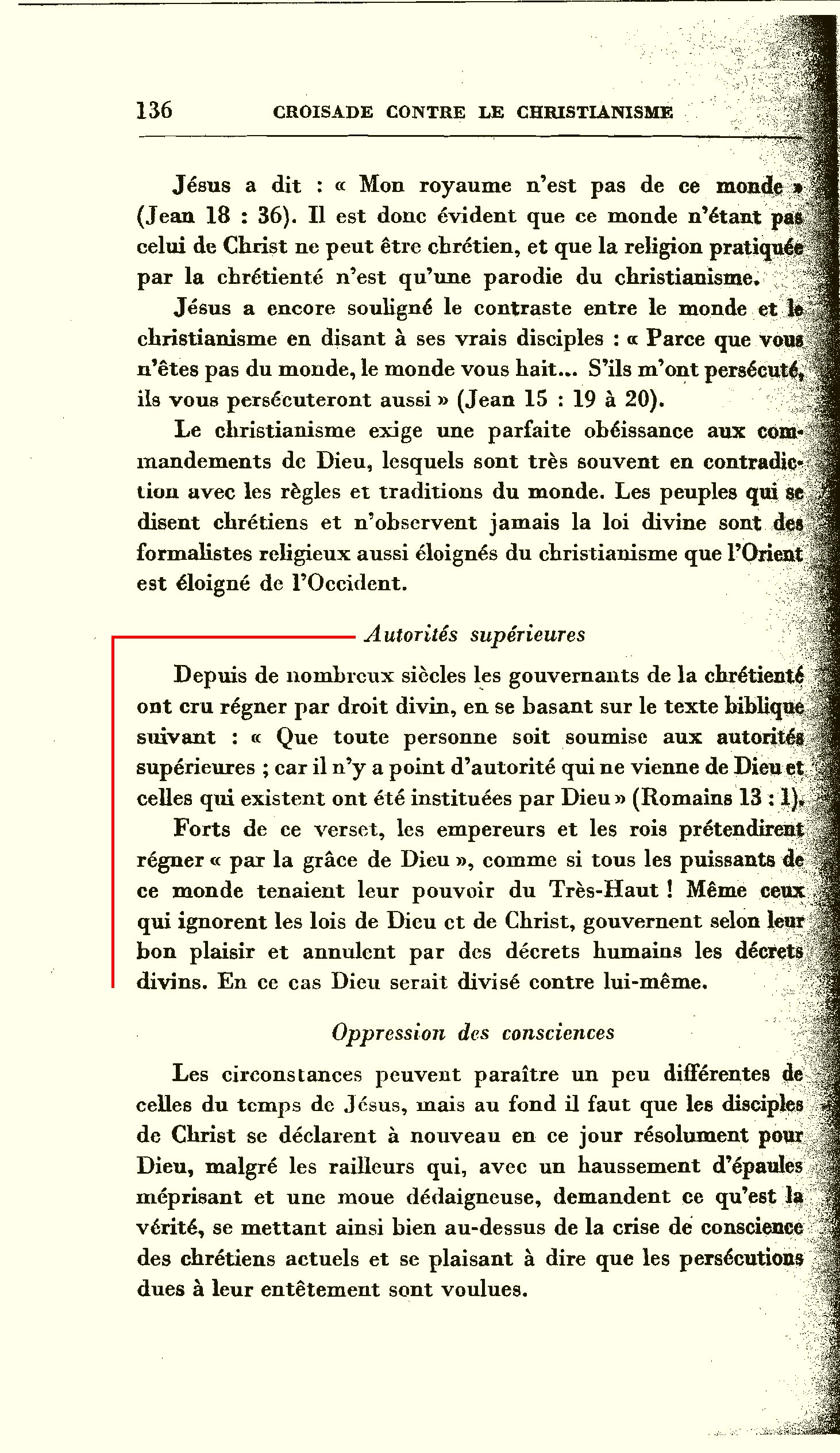 Forts de ce verset, les empereurs et les rois prétendirent régner "par la grâce de Dieu", comme si tous les puissants de ce monde tenaient leur pouvoir du Très-Haut ! Même ceux qui ignorent les lois de Dieu et de Christ, gouvernent selon leur bon plaisir et annulent par des décrets humains les décrets divins. En ce cas Dieu serait divisé contre lui-même. Source : 🇫🇷 1939 - Croisade contre le christianisme, page 136 + Cover |