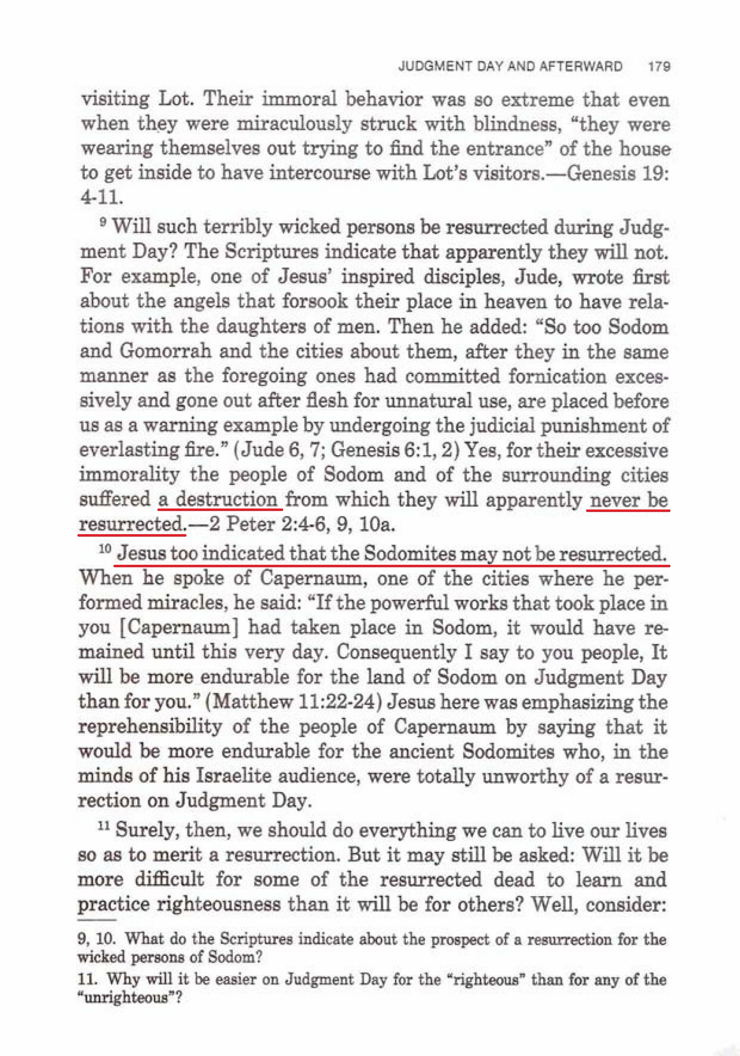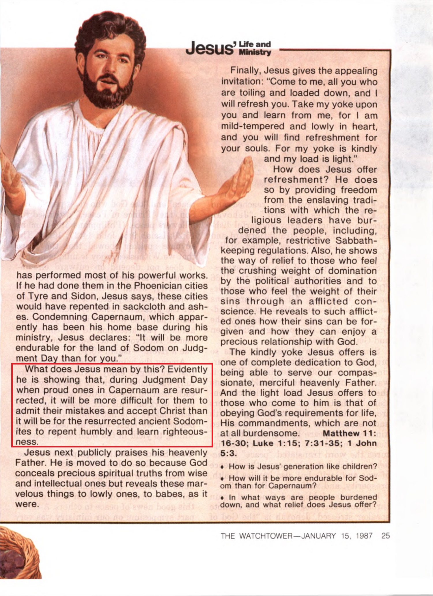 What does Jesus mean by this? Evidently he is showing that, during Judgment Day when proud ones in Capernaum are resurrected, it will be more difficult for them to admit their mistakes and accept Christ than it will be for the resurrected ancient Sodomites to repent humbly and learn righteousness. Source : 🇺🇸 The Watchtower, January 15 1987, page 25 + Cover |