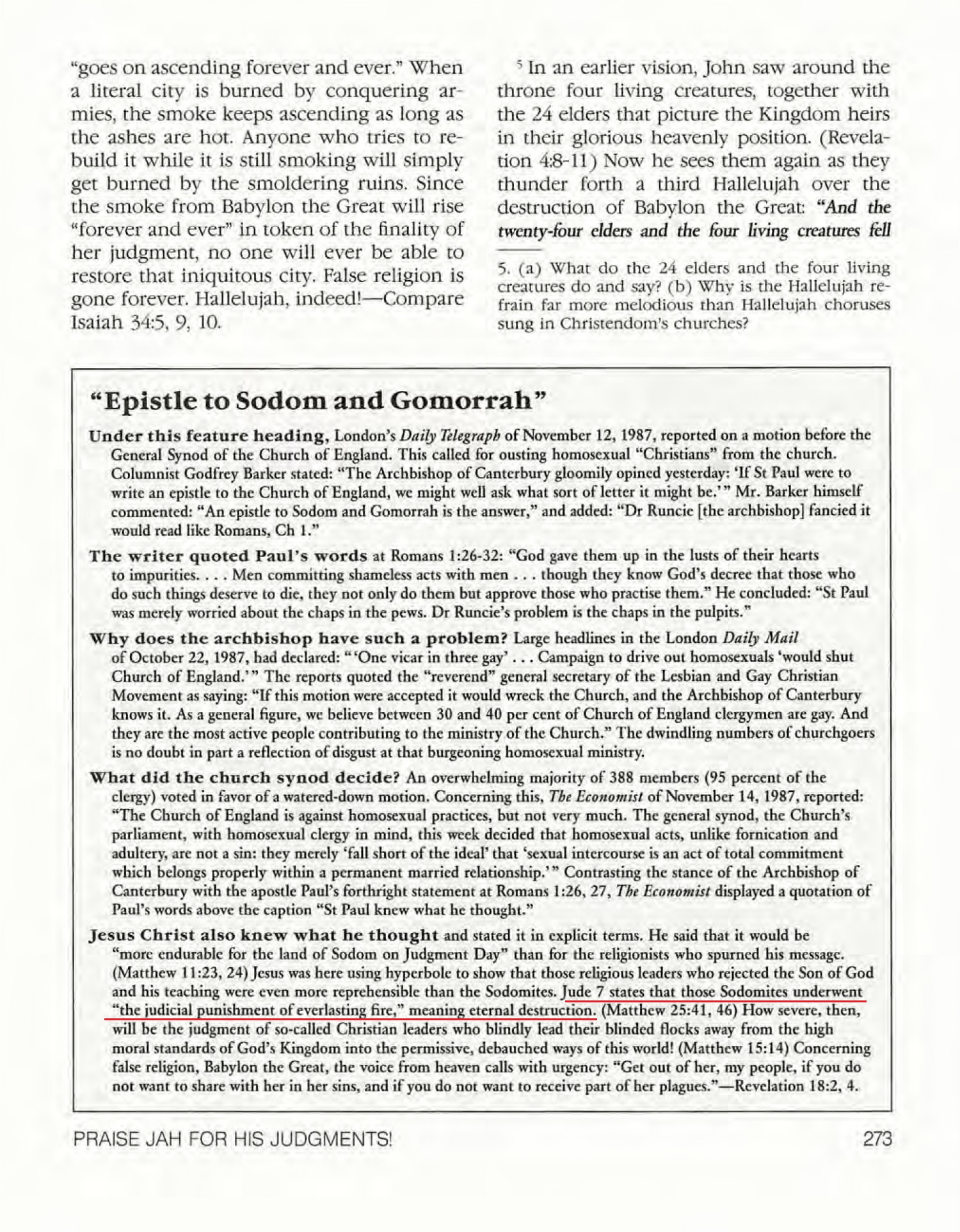 Our previous consideration of 2 Peter 2:5-9 has shown that those destroyed by God at Sodom and Gomorrah are eternally “cut off”. Corroborating this is Jude 7, which states that these cities are “placed before us as a warning example by undergoing the judicial punishment of everlasting fire” . (NW) “Everlasting fire” symbolizes the same thing as Gehenna, namely, second death. The destruction upon Sodom and Gomorrah must be final, [...] Jude 7 shows that those ancient cities had their judgment day back there at the time of their destruction, since they are spoken of as having already undergone an execution of judgment, “the judicial punishment of everlasting fire.” By no wresting of scripture can this be made to mean a future resurrection for slain of the Lord. [...] If those slain by the Lord at Sodom have no resurrection, then those slain by him at Armageddon will have none, for the former pictures the latter. So in their endeavor to prove their contention that not all slain at Armageddon will remain dead, some seek to show that the Sodomites destroyed by fire will return in a resurrection.