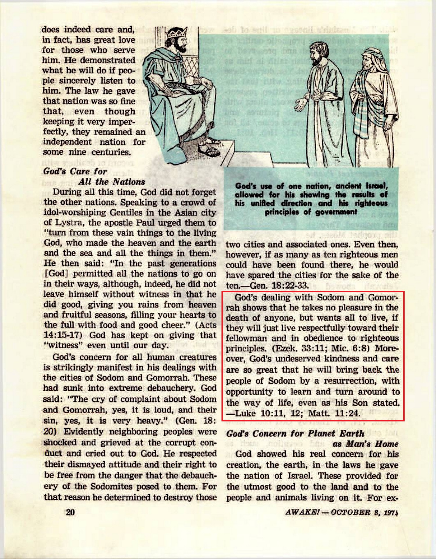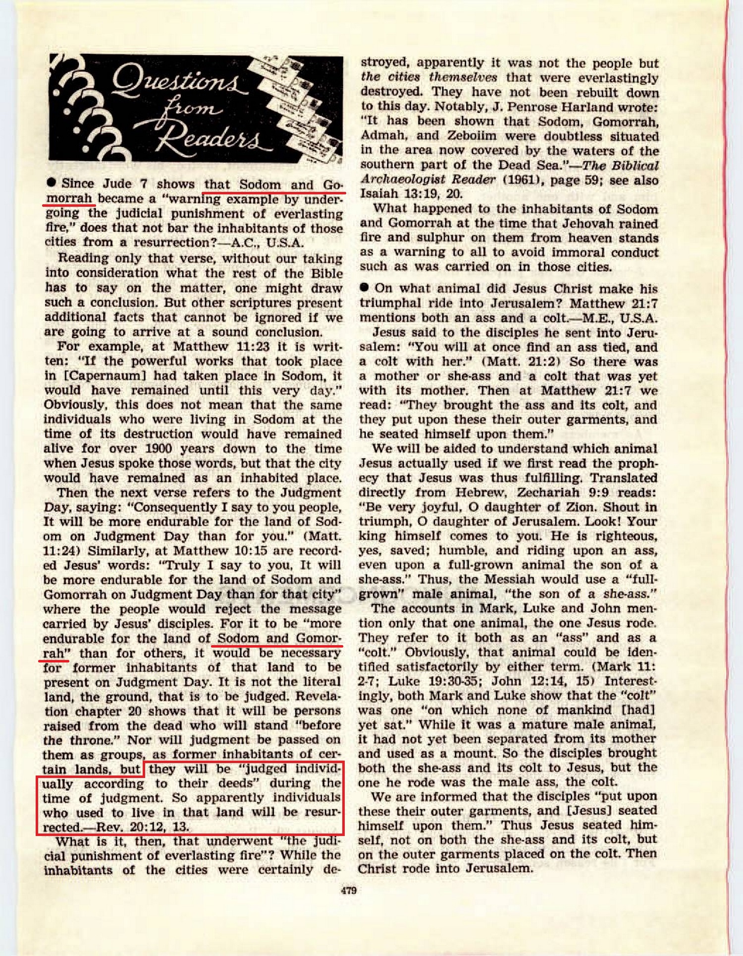 Since Jude 7 shows that Sodom and Gomorrah became a “warning example by undergoing the judicial punishment of everlasting fire,” does that not bar the inhabitants of those cities from a resurrection? [...] Then the next verse refers to the Judgment Day, saying: “Consequently I say to you people, It will be more endurable for the land of Sodom on Judgment Day than for you.” (Matt. 11:24) Similarly, at Matthew 10:15 are recorded Jesus’ words: “Truly I say to you, It will be more endurable for the land of Sodom and Gomorrah on Judgment Day than for that city” where the people would reject the message carried by Jesus’ disciples. For it to be “more endurable for the land of Sodom and Gomorrah”than for others, it would be necessary for former inhabitants of that land to be present on Judgment Day. It is not the literal raised from the dead who will stand “before the throne.” Nor will judgment be passed on them as groups, as former inhabitants of certain lands, but they will be “judged individually according to their deeds” during the time of judgment. So apparently individuals who used to live in that land will be resurrected. — Rev. 20:12, 13. Source : 🇺🇸 The Watchtower, August 1, 1965, page 479 + Cover |