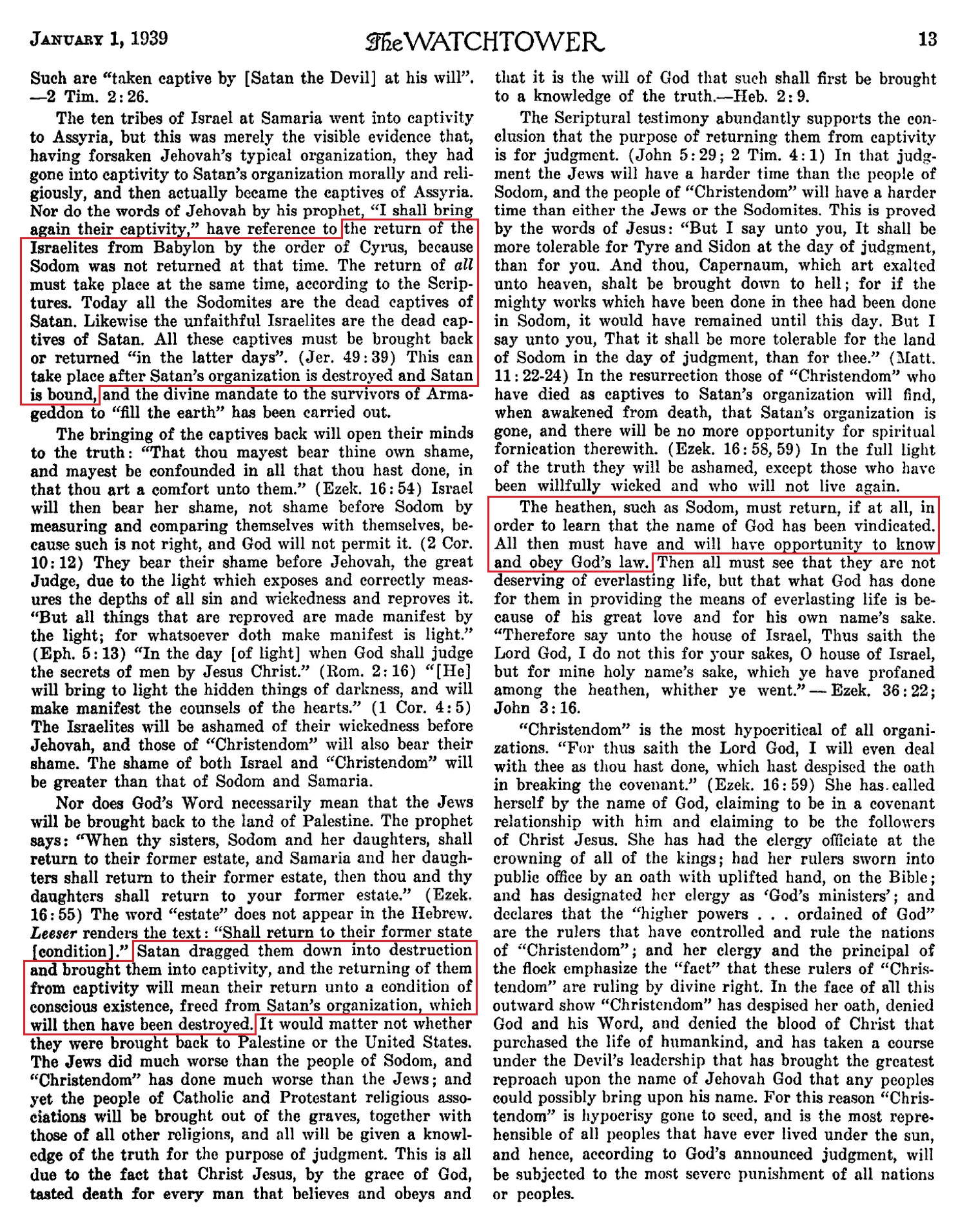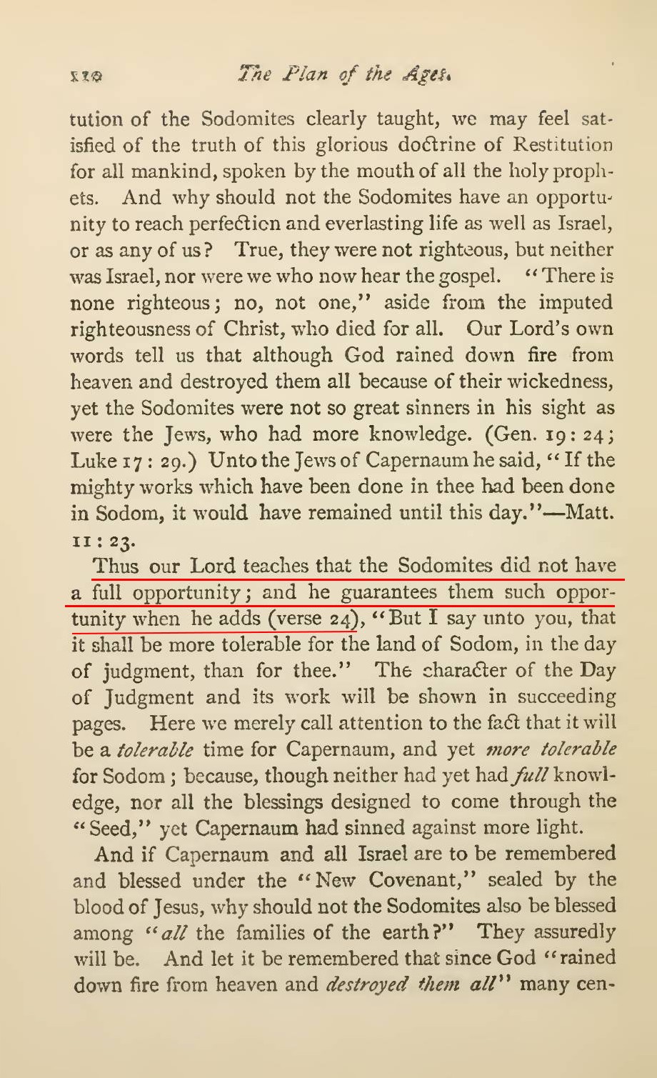 Sodom, Samaria and Jerusalem were the captives of the Devil's organization, and all went down into death as such captives. The Almighty God will destroy Satan's organization and will bring the people of those nations, with exceptions, back from that captivity [...] The return of all must take place at the same time, according to the Scriptures. Today all the Sodomites are the dead captives of Satan. Likewise the unfaithful Isrealites are the dead captives of Satan. All these captives must be brought back or returned "in the latter days". (Jer. 49:39) This can take place after Satan's organization is destroyed and Satan is bound [...] Satan dragged them down into destruction and brought them into captivity, and the returning of them from captivity will mean their return unto a condition of conscious existence, freed from Satan's organization, which will then have been destroyed [...] The heathen, such as Sodom, must return, if at all, in order to learn that the name of God has been vindicated. All then must have and will have opportunity to know and obey God's law.