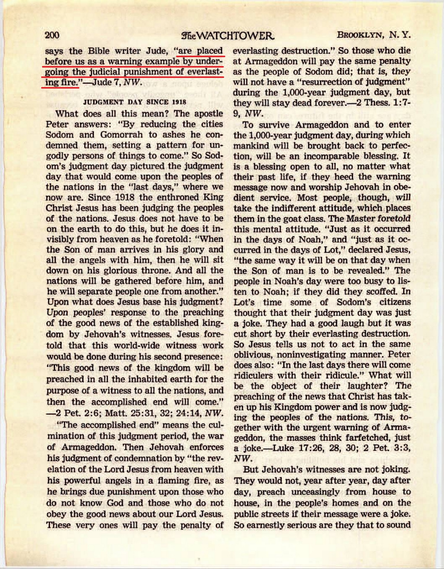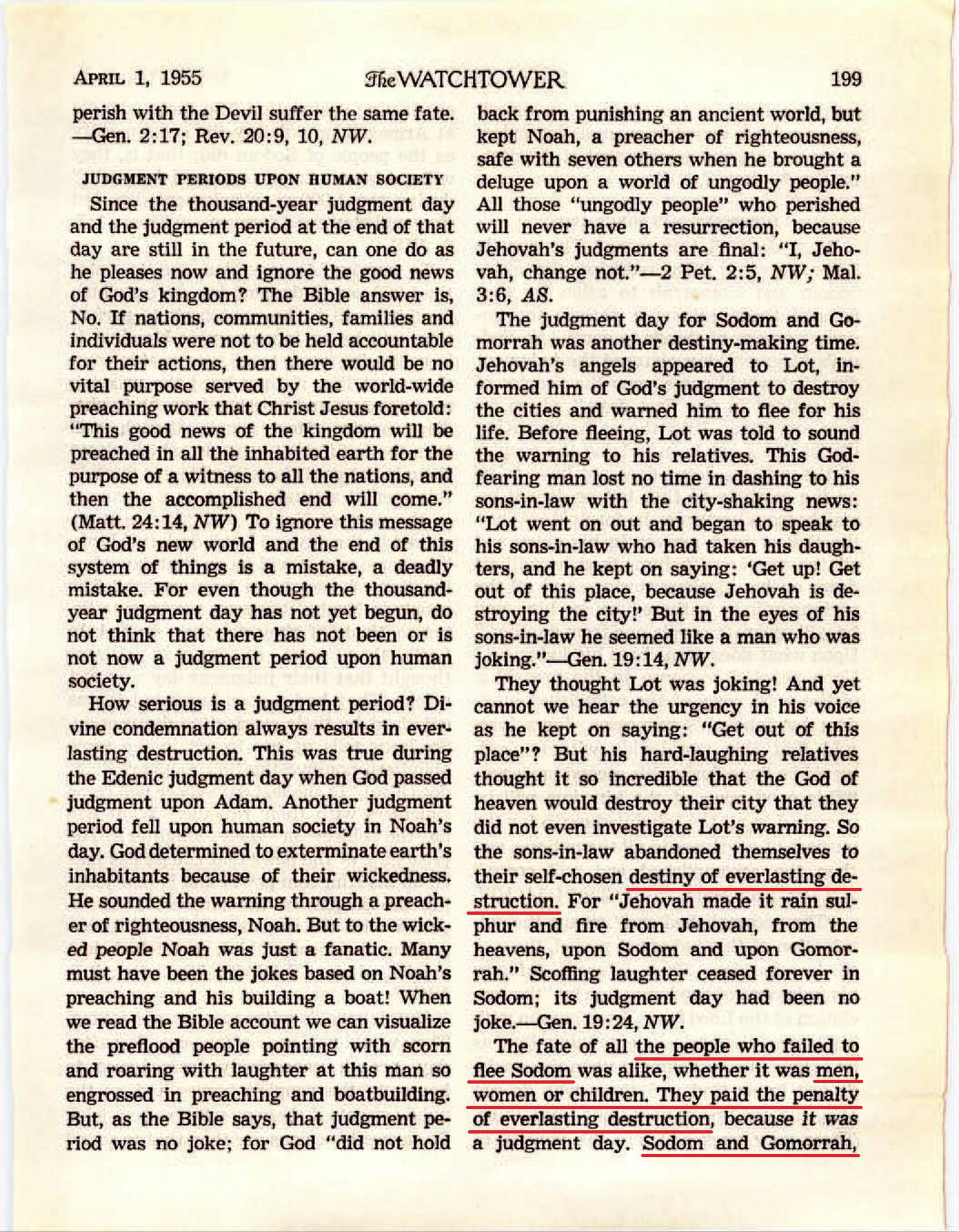 The fate of all the people who failed to flee Sodom was alike, whether it was men, women or children. They paid the penalty of everlasting destruction, because it was a judgment day. Sodom and Gomorrah, says the Bible writer Jude, “are placed before us as a warning example by undergoing the judicial punishment of everlasting fire.” — Jude 7, NW. [...] In Lot’s time some of Sodom’s citizens thought that their judgment day was just a joke. They had a good laugh but it was cut short by their everlasting destruction. Source : 🇺🇸 The Watchtower, April 1, 1955, page 199, page 200 + Cover |