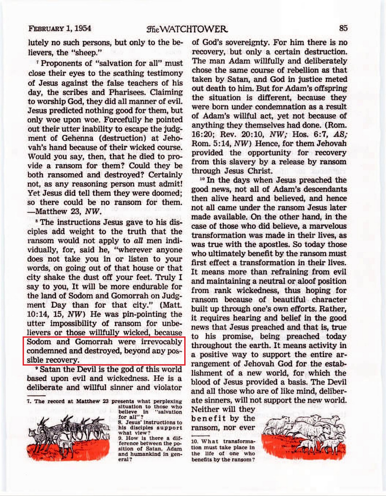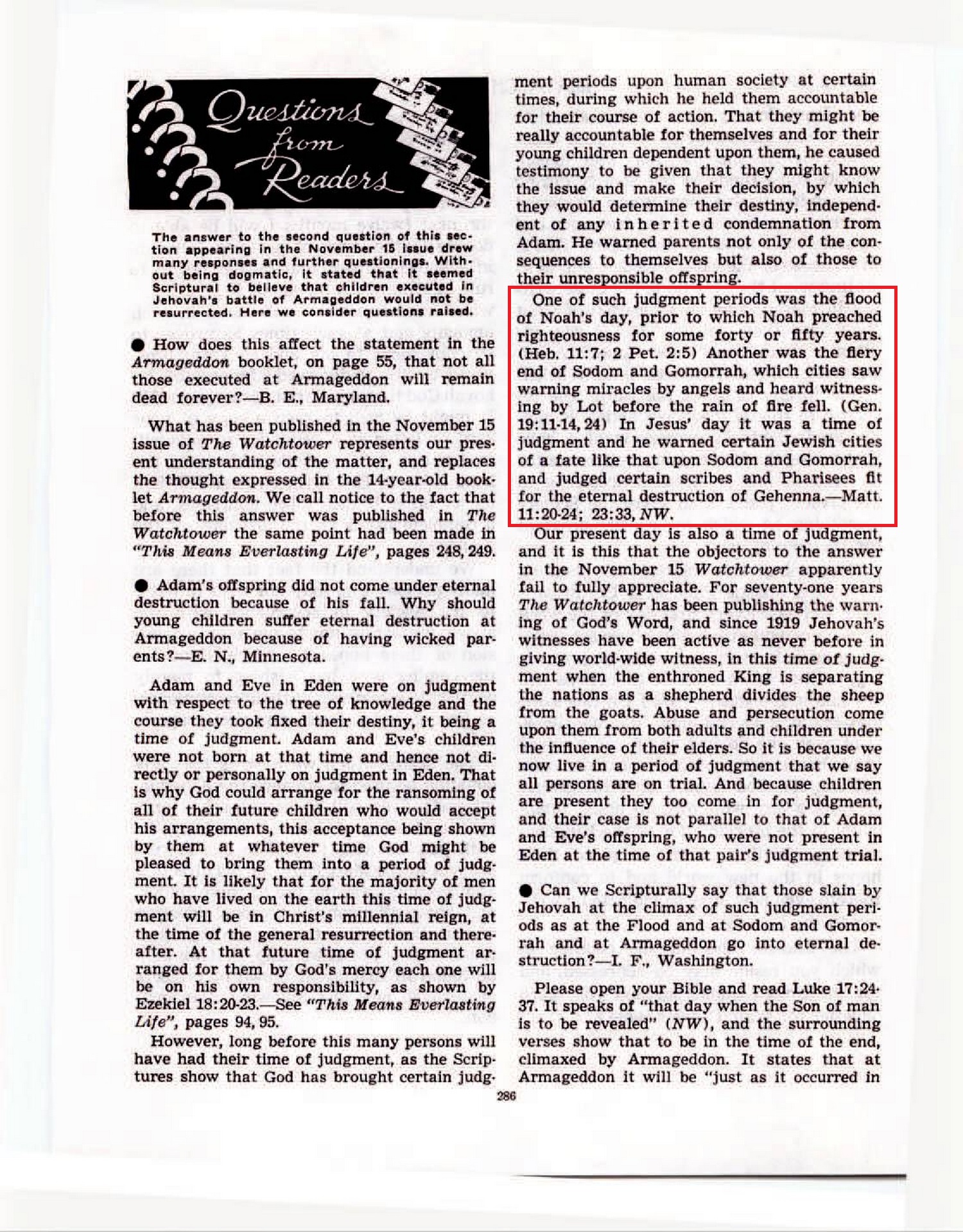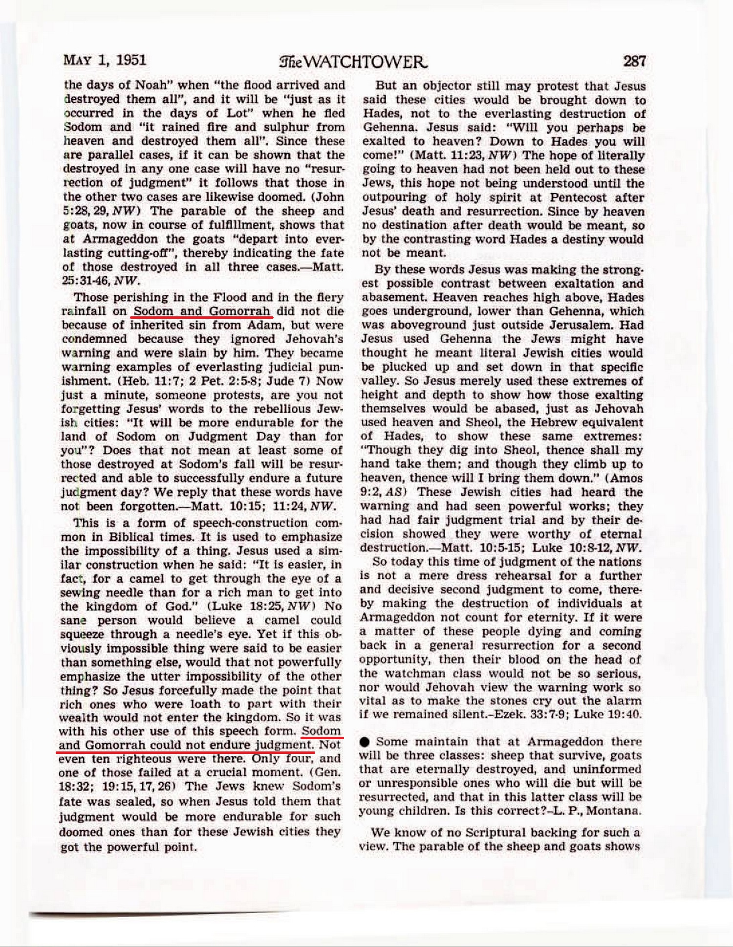 And since Peter also includes Sodom and Gomorrah in the foregoing reference, we know that those who perished by Jehovah’s fiery judgment in Lot’s day also had their eternal destiny sealed. Source : 🇺🇸 The Watchtower, November 15, 1956, page 678 + Cover |