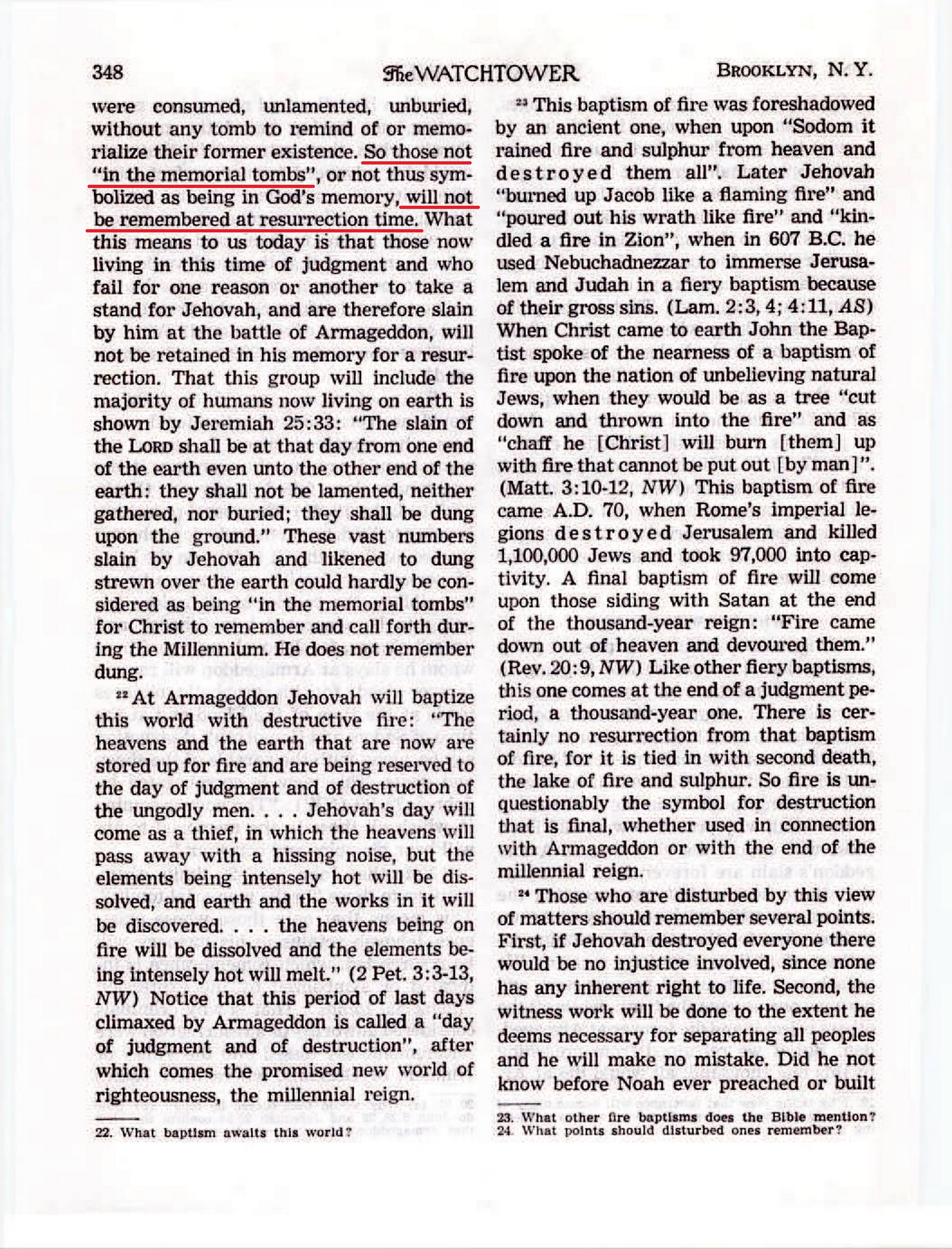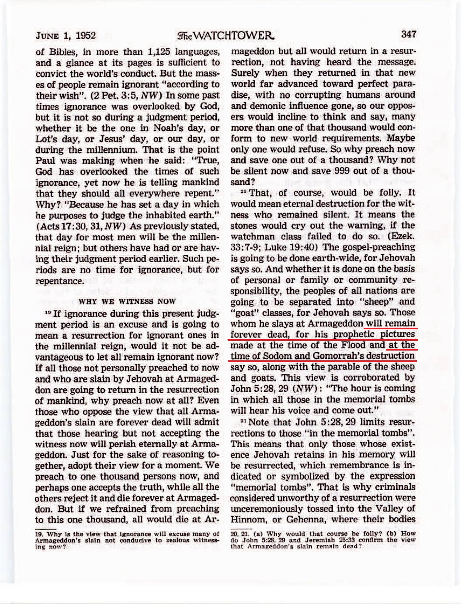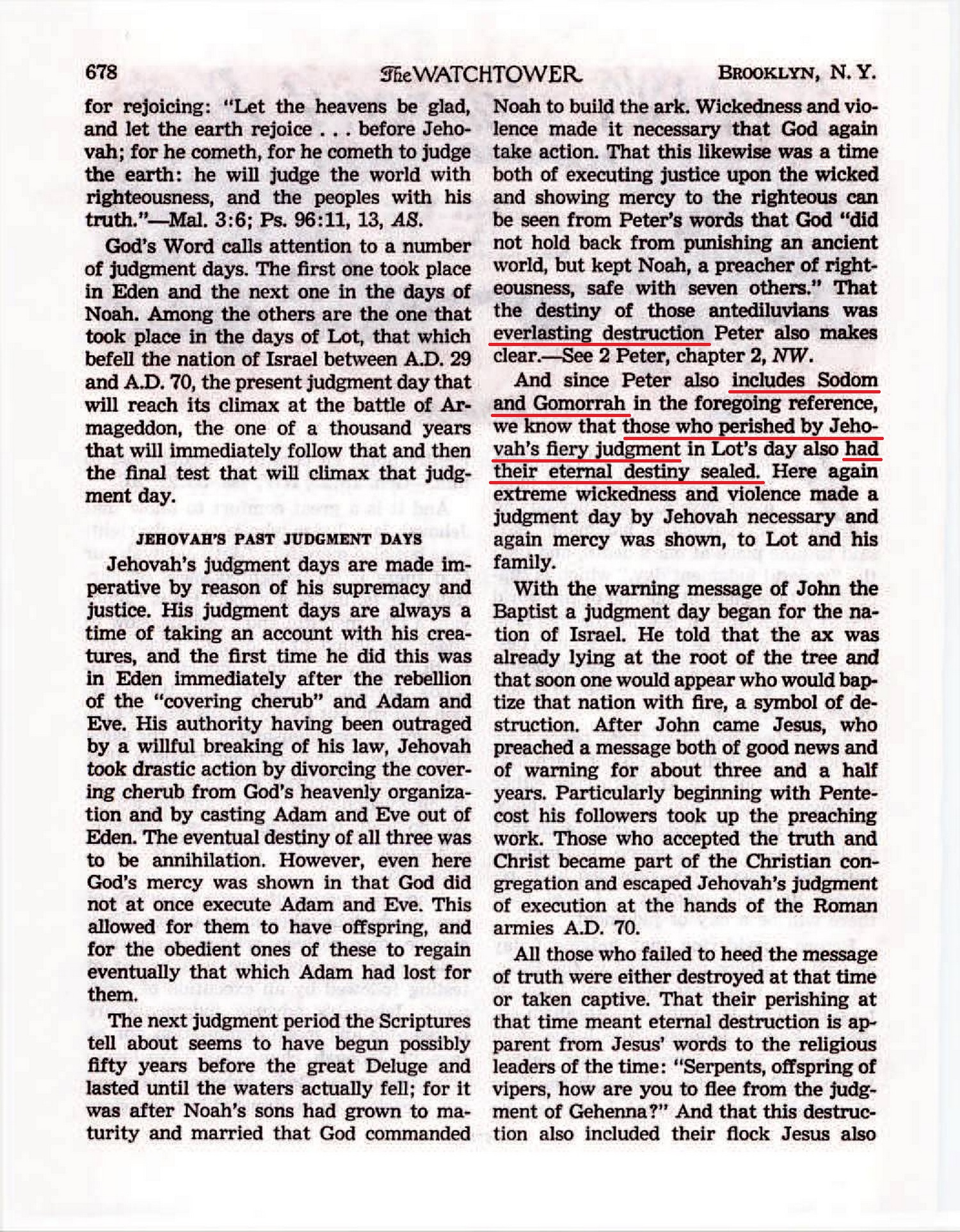 And since Peter also includes Sodom and Gomorrah in the foregoing reference, we know that those who perished by Jehovah’s fiery judgment in Lot’s day also had their eternal destiny sealed. Source : 🇺🇸 The Watchtower, November 15, 1956, page 678 + Cover |