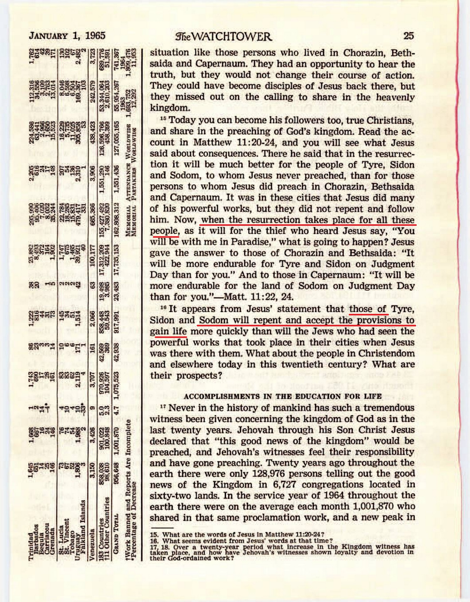 It appears from Jesus’ statement that those of Tyre, Sidon and Sodom will repent and accept the provisions to gain life more quickly than will the Jews who had seen the powerful works that took place in their cities when Jesus was there with them. Source : 🇺🇸 The Watchtower, January 1 , 1965, page 25 + Cover |