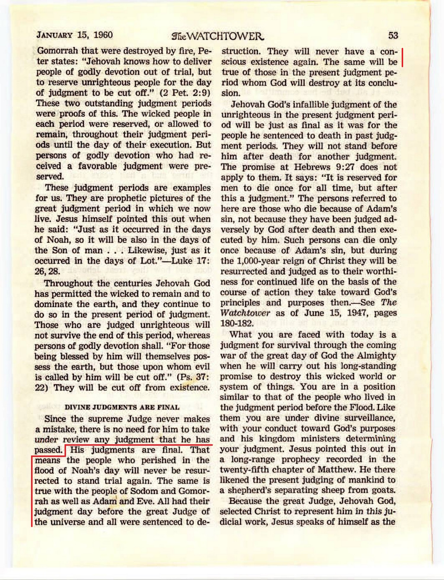 Since the supreme Judge never makes a mistake, there is no need for him to take under review any judgment that he has passed. His judgments are final. That means the people who perished in the flood of Noah’s day will never be resurrected to stand trial again. The same is true with the people of Sodom and Gomorrah as well as Adam and Eve. All had their judgment day before the great Judge of the universe and all were sentenced to destruction. They will never have a conscious existence again. Source : 🇺🇸 The Watchtower, January 15, 1960, page 53 + Cover |