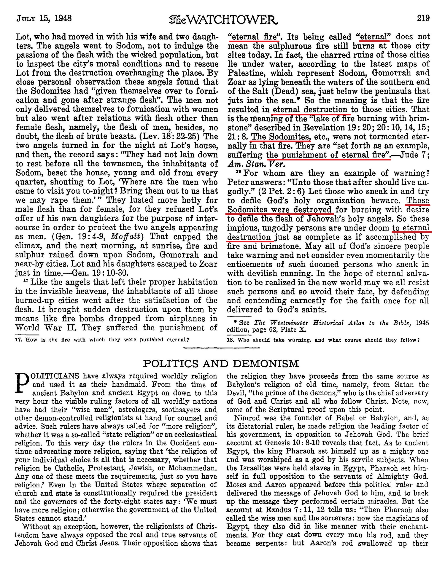Like the angels that left their proper habitation in the invisible heavens, the inhabitants of all those burned-up cities went after the satisfaction of the flesh. It brought sudden destruction upon them by means like fire bombs dropped from airplanes in World War II. They suffered the punishment of "eternal fire". Its being called "eternal" does not mean the sulphurous fire still burns at those city sites today. [...] So the meaning is that the fire resulted in eternal destruction to those cities. That is the meaning of the "lake of fire burning with brimstone" described in Revelation 19:20; 20:10, 14, 15; 21:8. The Sodomites, etc., were not tormented eternally in that fire. They are "set forth as an example, suffering the punishment of eternal fire".-Jude 7; [...] Those Sodomites were destroyed for burning with desire to defile the flesh of Jehovah’s holy angels. So these impious, ungodly persons are under doom to eternal destruction just as complete as if accomplished by fire and brimstone. Source : 🇺🇸 The Watchtower, July 15 1948, page 219 + Cover |