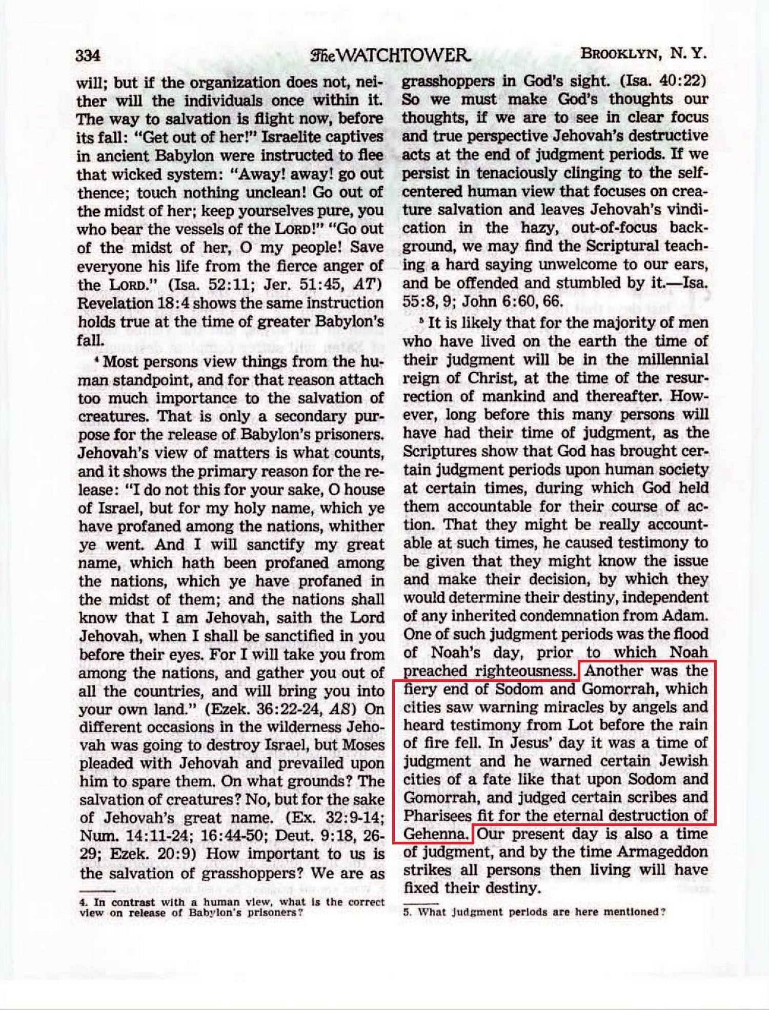 One of such judgment periods was the flood of Noah’s day, prior to which Noah preached righteousness for some forty or fifty years. (Heb. 11:7; 2 Pet. 2:5) Another was the fiery end of Sodom and Gomorrah, which cities saw warning miracles by angels and heard witnessing by Lot before the rain of fire fell. (Gen. 19:11-14,24) In Jesus’ day it was a time of judgment and he warned certain Jewish cities of a fate like that upon Sodom and Gomorrah, and judged certain scribes and Pharisees fit for the eternal destruction of Gehenna. — Matt. 11:20-24; 23:33־,NW. Source : 🇺🇸 The Watchtower, May 1, 1951, page 286 + Cover |