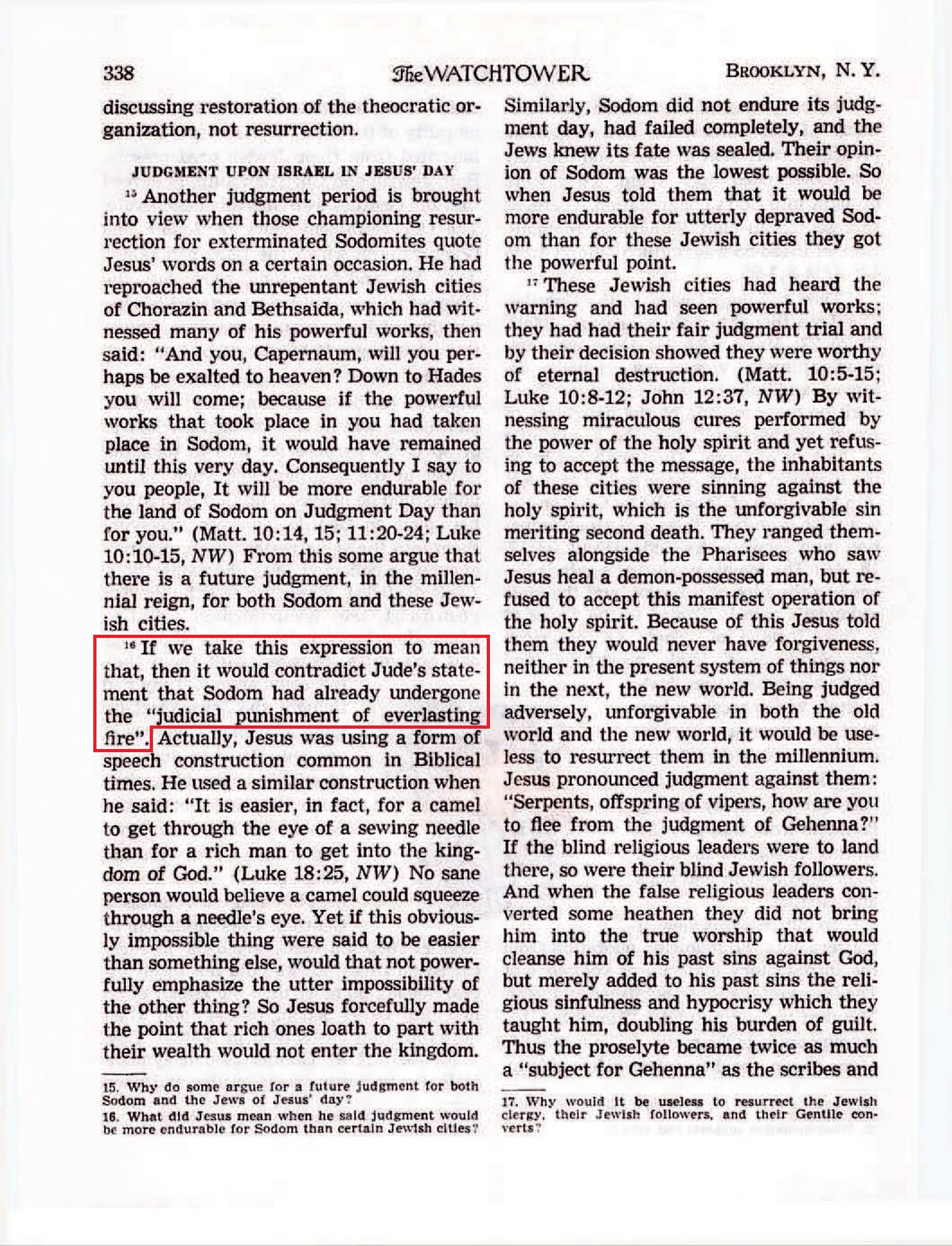 Another judgment period is brought into view when those championing resurrection for exterminated Sodomites quote Jesus’ words on a certain occasion. [...] Consequently I say to you people, It will be more endurable for the land of Sodom on Judgment Day than for you.” [...] From this some argue that there is a future judgment, in the millennial reign, for both Sodom and these Jewish cities. If we take this expression to mean that, then it would contradict Jude’s statement that Sodom had already undergone the “judicial punishment of everlasting fire”. Actually, Jesus was using a form of speech construction common in Biblical times. He used a similar construction when he said: “It is easier, in fact, for a camel to get through the eye of a sewing needle than for a rich man to get into the kingdom of God.” (Luke 18:25, NW) No sane person would believe a camel could squeeze through a needle’s eye.