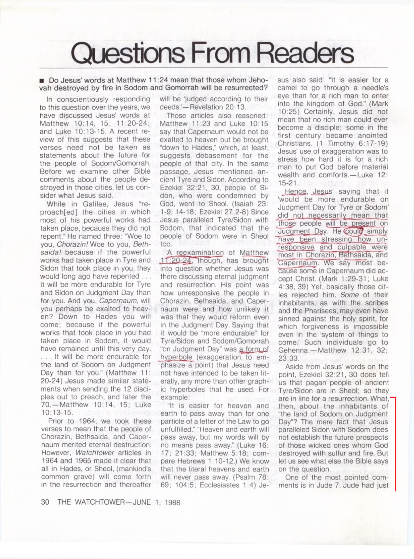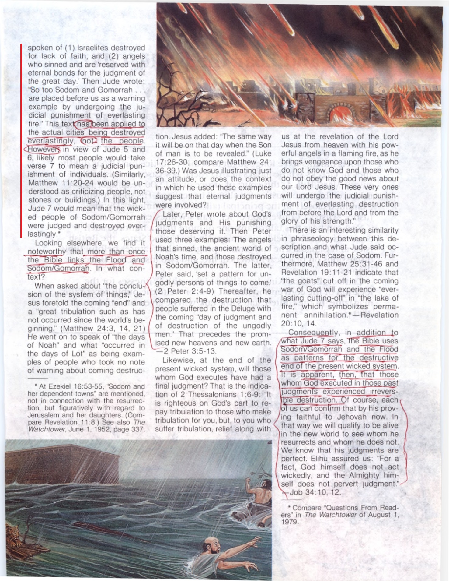 One of the most pointed comments is in Jude 7. Jude had just spoken of (1) Israelites destroyed for lack of faith, and (2) angels who sinned and are ‘reserved with eternal bonds for the judgment of the great day.’ Then Jude wrote: "So too Sodom and Gomorrah... are placed before us as a warning example by undergoing the judicial punishment of everlasting fire.” This tex has been applied to the actual cities’ being destroyed everlastingly, not the people. However, in view of Jude 5 and 6jikely most people would take verse 7 to mean a judicial punishment of individuals. (Similarly, Matthew 11:20-24 would be understood as criticizing people, not stones or buildings.) In this light, Jude 7 would mean that the wicked people of Sodom/Gomorrah were judged and destroyed everlastingly. Source : 🇺🇸 The Watchtower June 1, 1988 (Questions From Readers), page 30, page 31 + Cover |