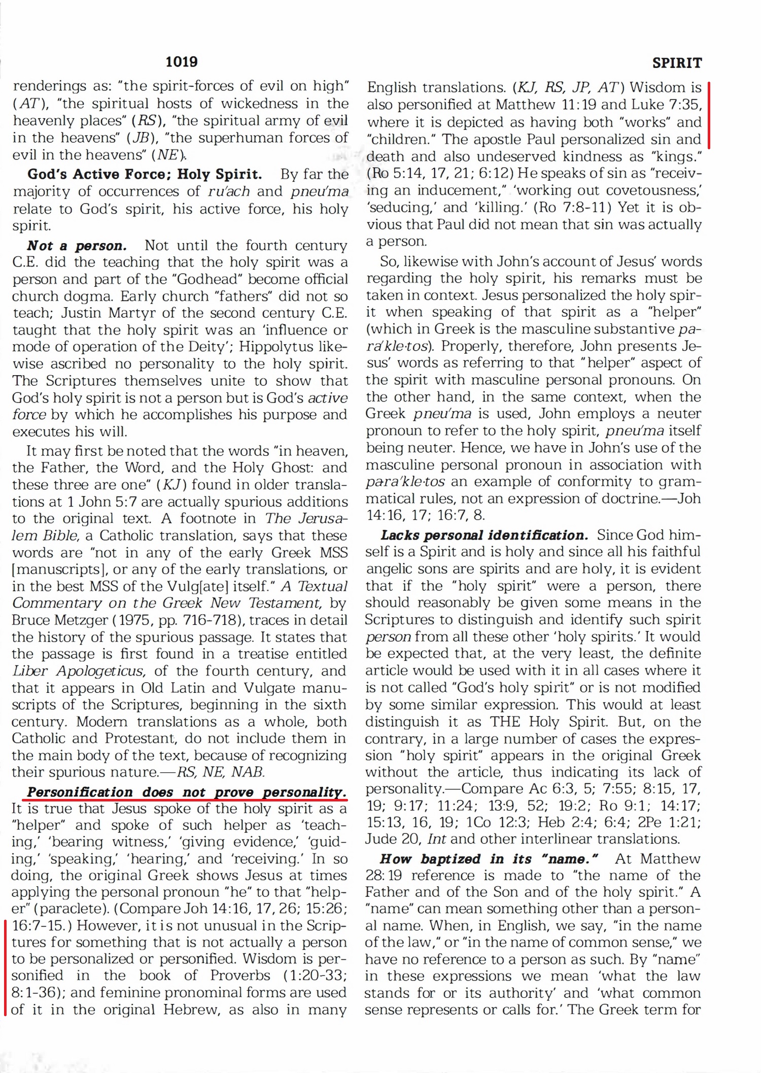 However, it is not unusual in the Scriptures for something that is not actually a person to be personalized or personified. Wisdom is personified in the book of Proverbs (1:20-33; 8:1-36); and feminine pronominal forms are used of it in the original Hebrew, as also in many English translations. (KJ, RS, JP, AT) Wisdom is also personified at Matthew 11:19 and Luke 7:35, where it is depicted as having both "works" and "children." Source : 🇺🇸 1988 - Insight on the Scriptures, Vol2, page 1019 + Cover |