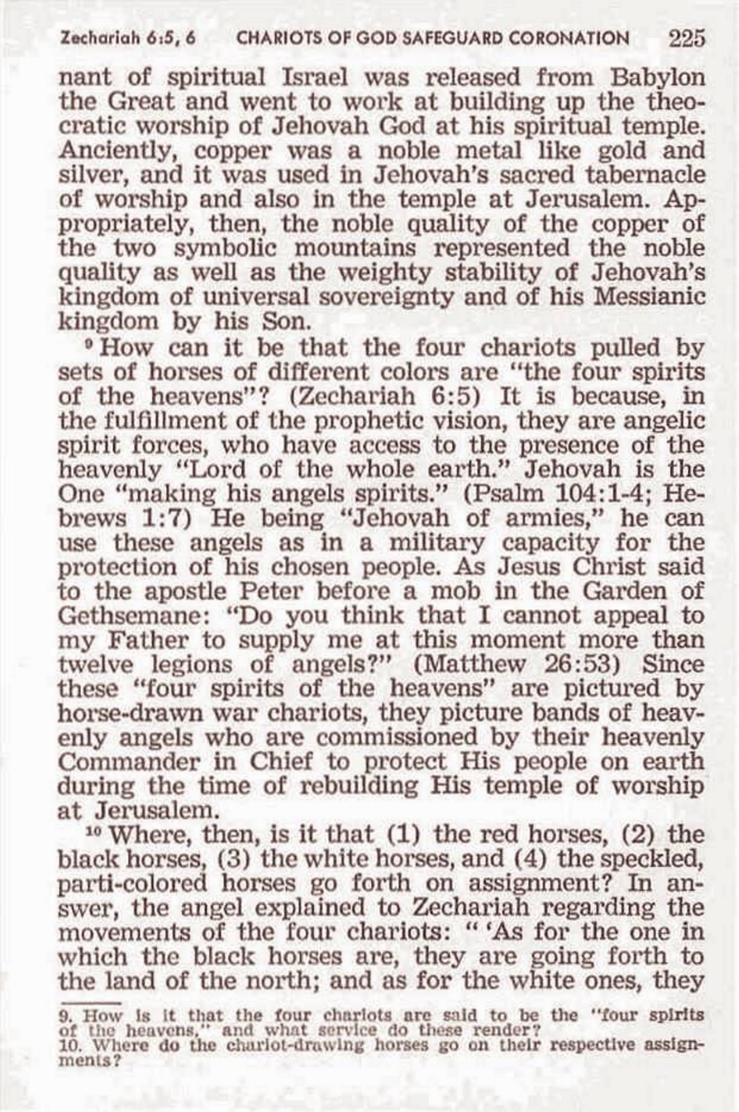 We need not make guesses as to what the differentiating colors of the horses mean. The colors of the horses served to distinguish the chariots pulled by each color group. How many horses were hitched to each chariot, Zechariah does not tell us. Source : 🇺🇸 1972 - Paradise restored to mankind by theocracy, page 222, page 223 + Cover |