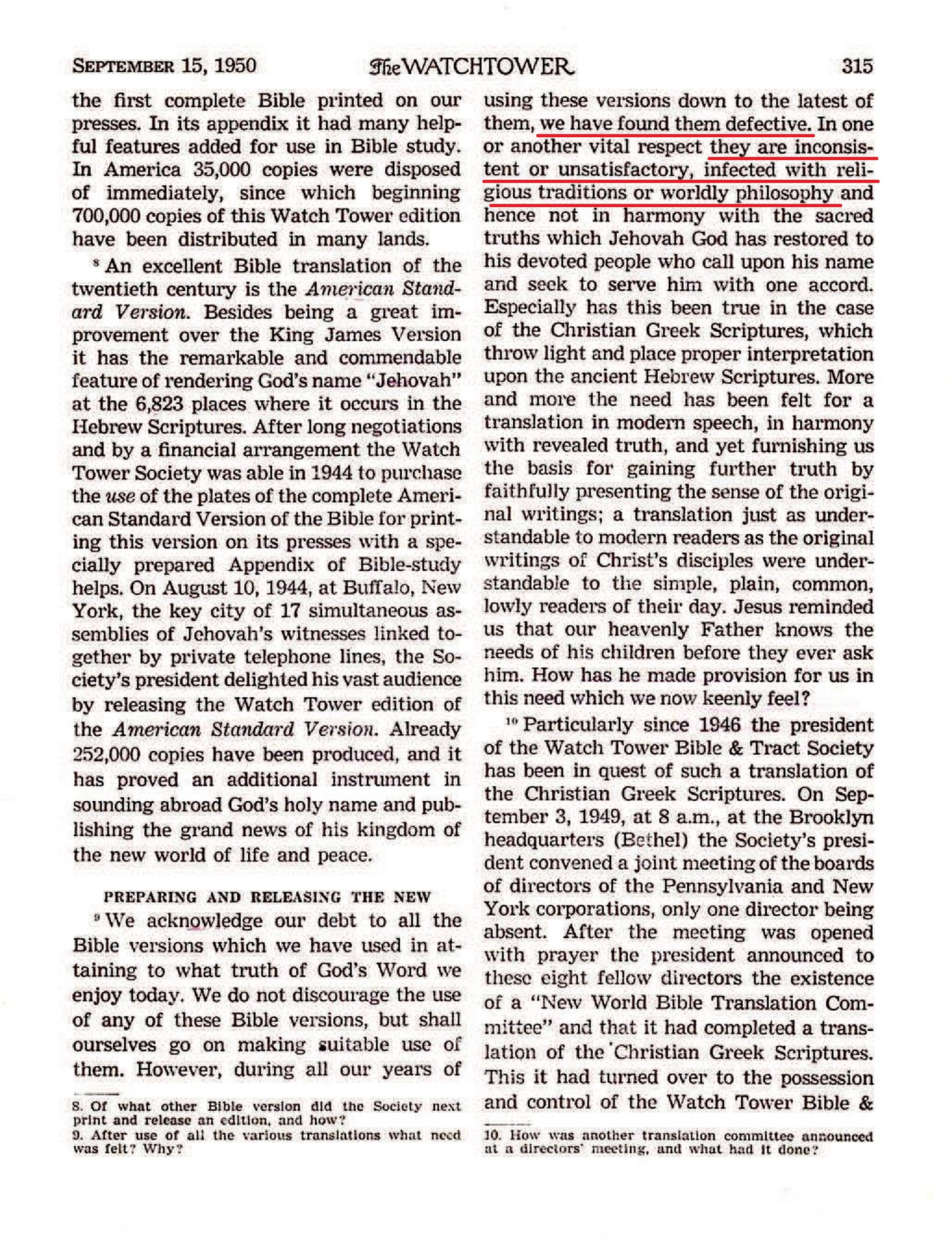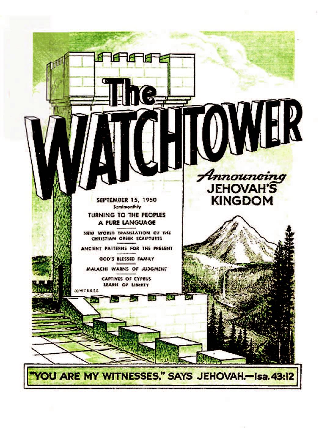 We acknowledge our debt to all the Bible versions which we have used in attaining to what truth of God's Word we enjoy today. We do not discourage the use of any of these Bible versions, but shall ourselves go on making imitable use of them. However, during all our years of using these versions down to the latest of them, we have found them defective. In one or another vital respect they are inconsistent or unsatisfactory, infected with religious traditions or worldly philosophy and hence not in harmony with the sacred truths which Jehovah God has restored to his devoted people who call upon his name and seek to serve him with one accord. Source : 🇫🇷 The Watchtower, September 15 1950, page 315 + Cover |