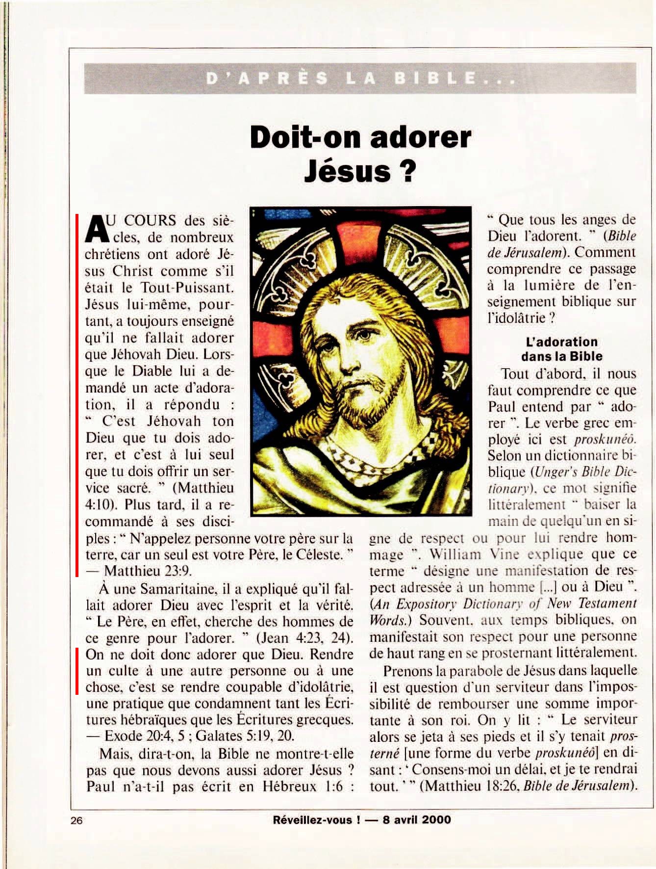 AU COURS des siècles, de nombreux chrétiens ont adoré Jésus Christ comme s’il était le Tout-Puissant. Jésus lui-même, pourtant, a toujours enseigné qu’il ne fallait adorer que Jéhovah Dieu. Lorsque le Diable lui a demandé un acte d’adoration, il a répondu : “ C’est Jéhovah ton Dieu que tu dois adorer, et c’est à lui seul que tu dois offrir un service sacré. ” (Matthieu 4:10). Plus tard, il a recommandé à ses disciples : “ N’appelez personne votre père sur la terre, car un seul est votre Père, le Céleste. ” — Matthieu 23:9... On ne doit donc adorer que Dieu. Rendre un culte à une autre personne ou à une chose, c'est se rendre coupable d'idolâtrie...