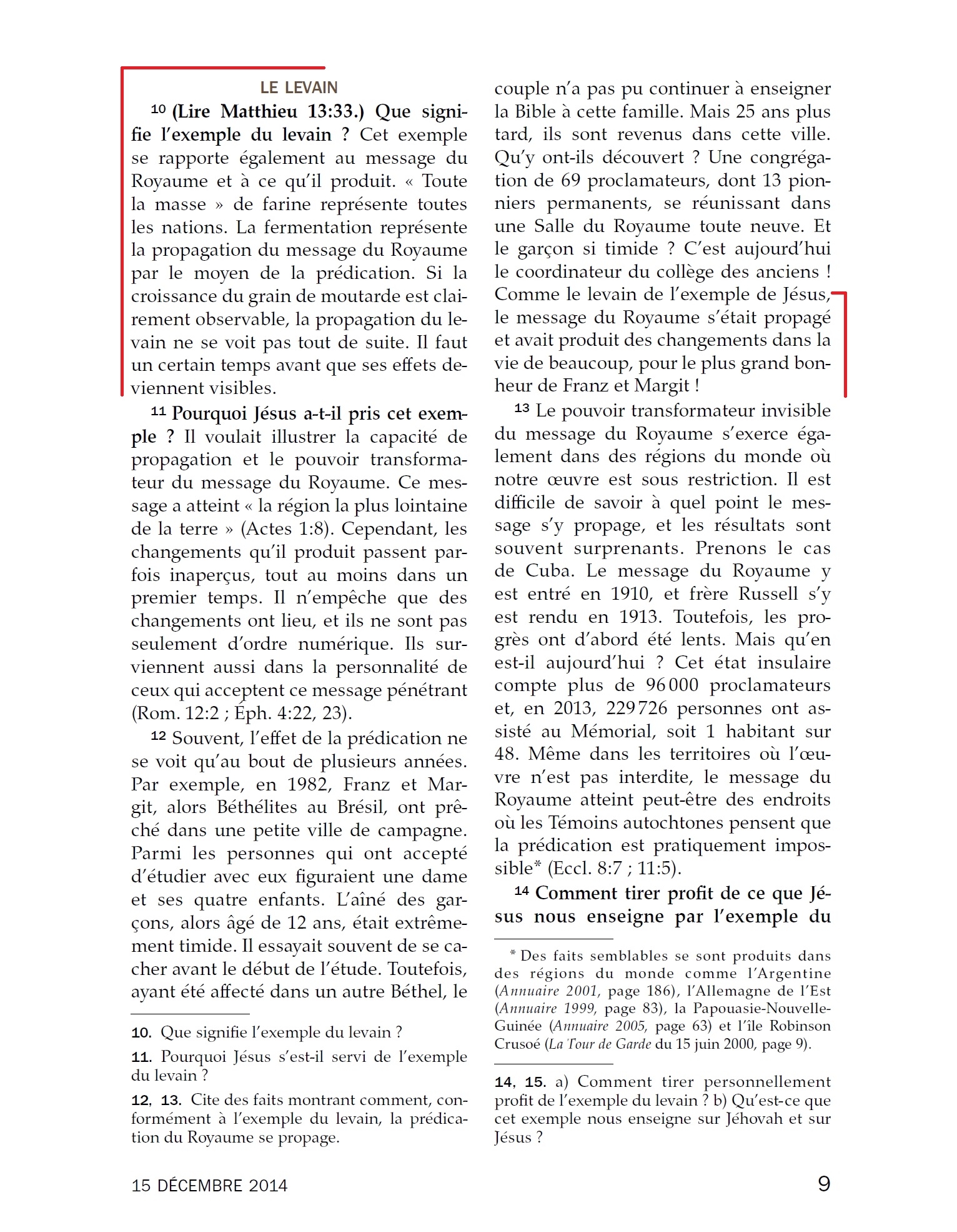 (Lire Matthieu 13:33.) Que signifie l'exemple du levain ? Cet exemple se rapporte également au message du Royaume et à ce qu'il produit. "Toute la masse" de farine représente toutes les nations. La fermentation représente la propagation du message du Royaume par le moyen de la Prédication. Pourquoi Jésus a-t-il pris cet exemple ? Il voulait illustrer la capacité de propagation et le pouvoir transformateur du Royaume. [...] des changements ont lieu, [...] Ils surviennent aussi dans la personnalité de ceux qui acceptent ce message pénétrant [...] Comme le levain de l'exemple de Jésus, le message du Royaume s'était propagé et avait produit des changements dans la vie de beaucoup, pour le plus grand bonheur de Franz et Margit ! Source : 🇫🇷 La Tour de Garde, 15 Décembre 2014, page 9 + Cover |