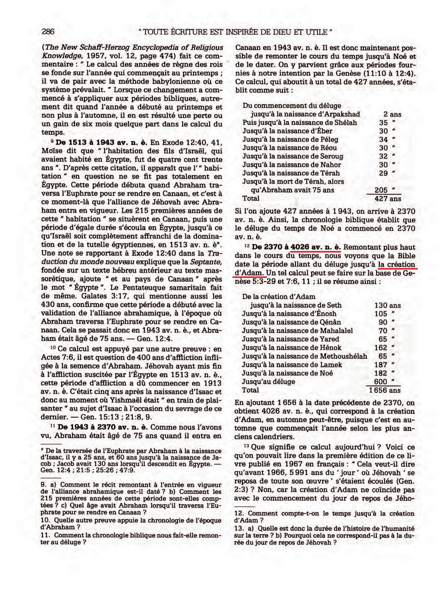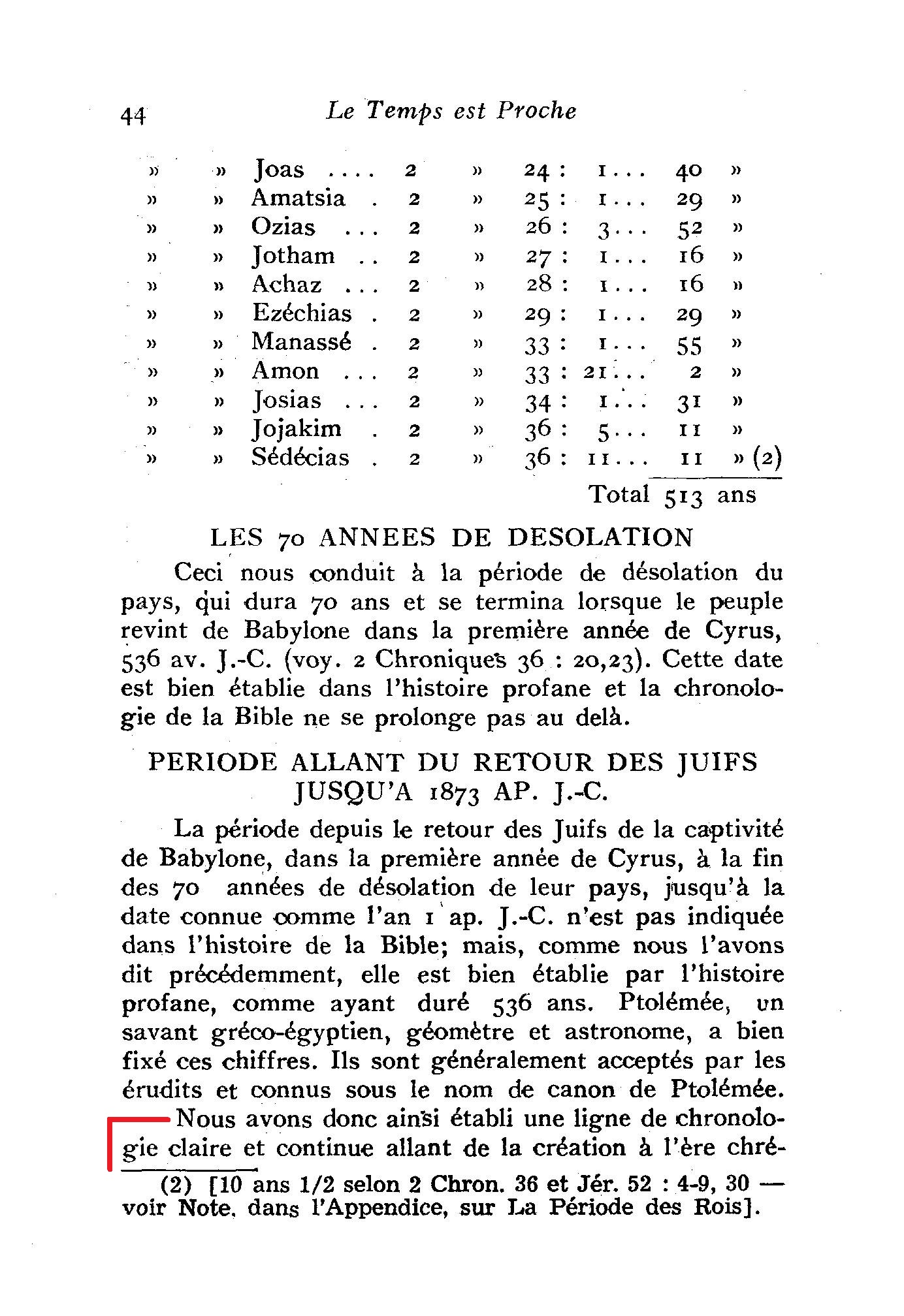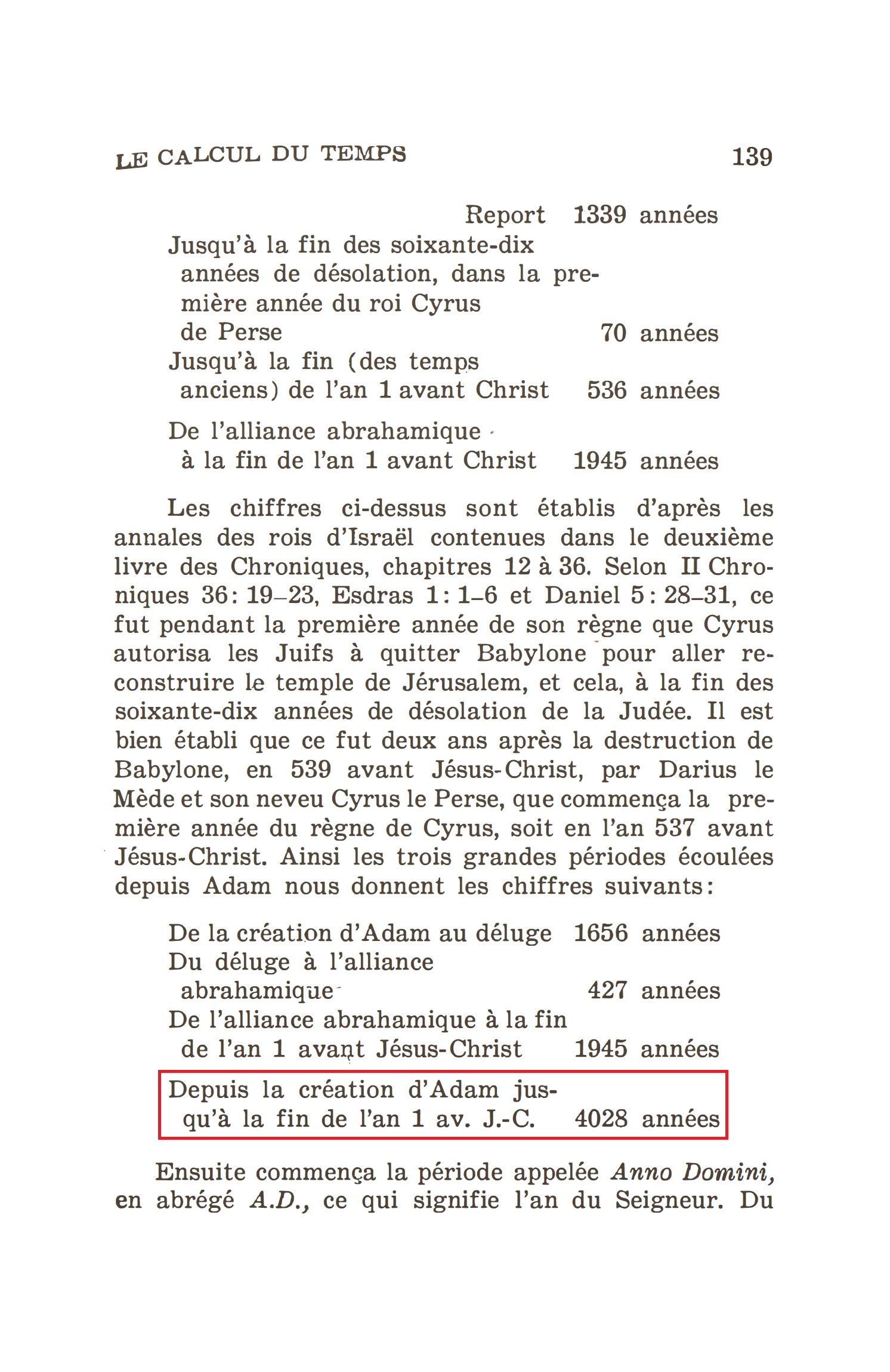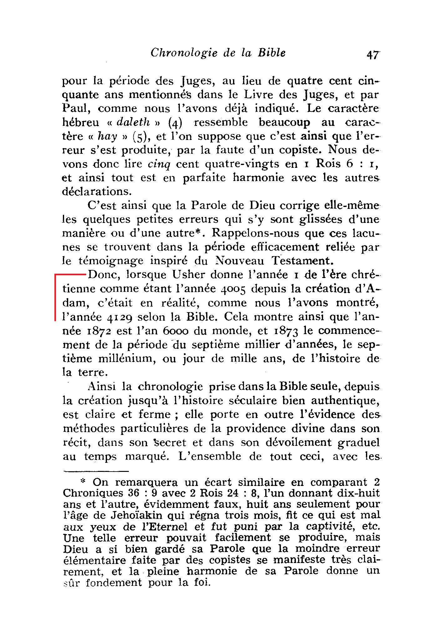 Nous avons donc ainsi établi une ligne de chronologie claire et continue allant de la création à l’ère chrétienne, formant en tout une période de quatre mille cent vingt-huit (4128) ans. En ajoutant ceux-ci aux 1872 ans de l’ère chrétienne, nous obtenons une période de 6ooo ans, allant de la création à l’an 1873 ap. J.-C.