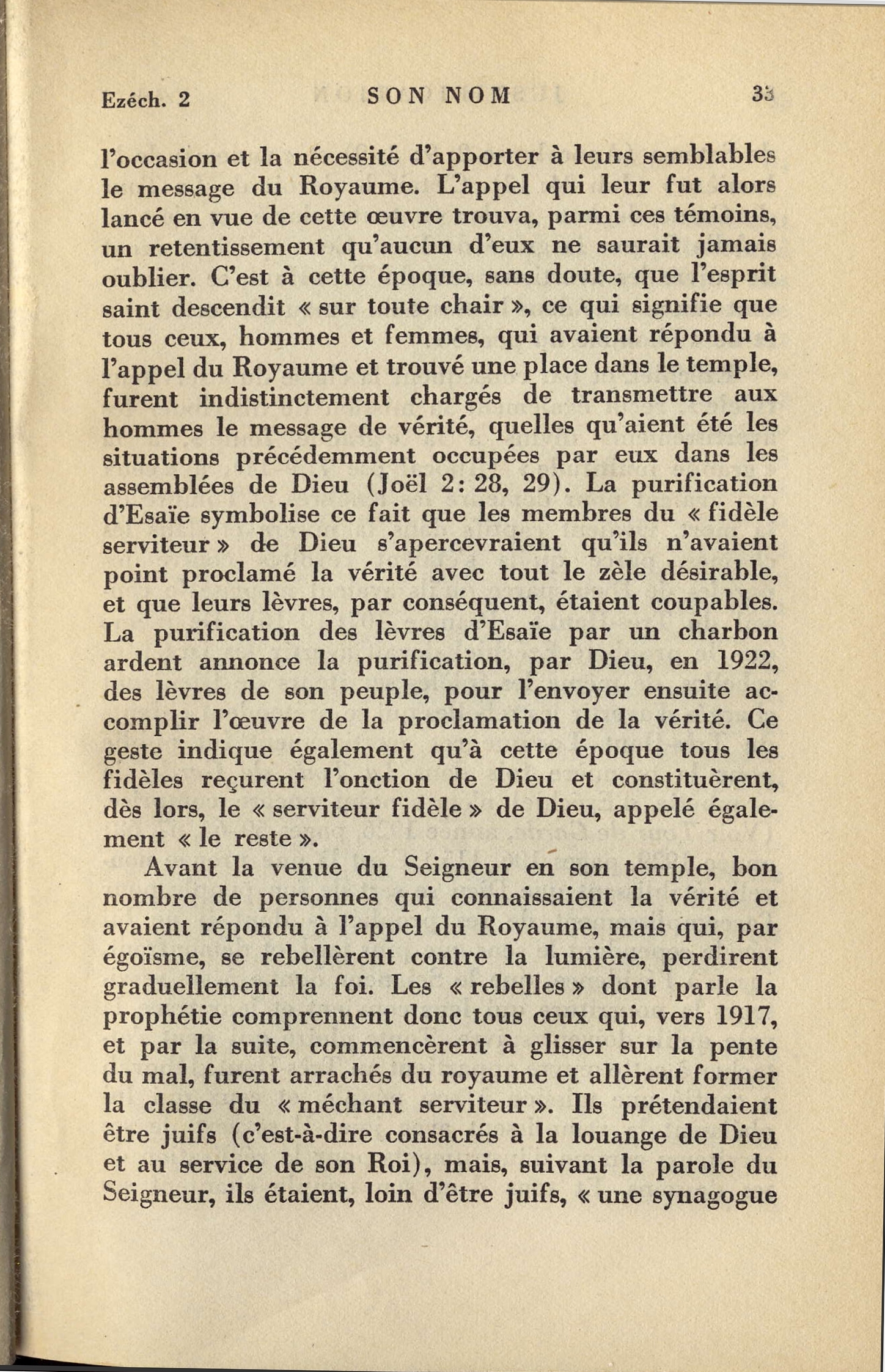 [...] Avant la venue du Seigneur en son temple, bon nombre de personnes qui connaissaient la vérité et avaient répondu à l'appel du Royaume, mais qui, par égoïsme, se rebellèrent contre la lumière, perdirent graduellement la foi. Les « rebelles » dont parle la prophétie comprennent donc tous ceux qui, vers 1917, et par la suite, commencèrent à glisser sur la pente du mal, furent arrachés du royaume et allèrent former la classe du « méchant serviteur ». Source : 🇫🇷 1931 - Justification page 33 + Cover |