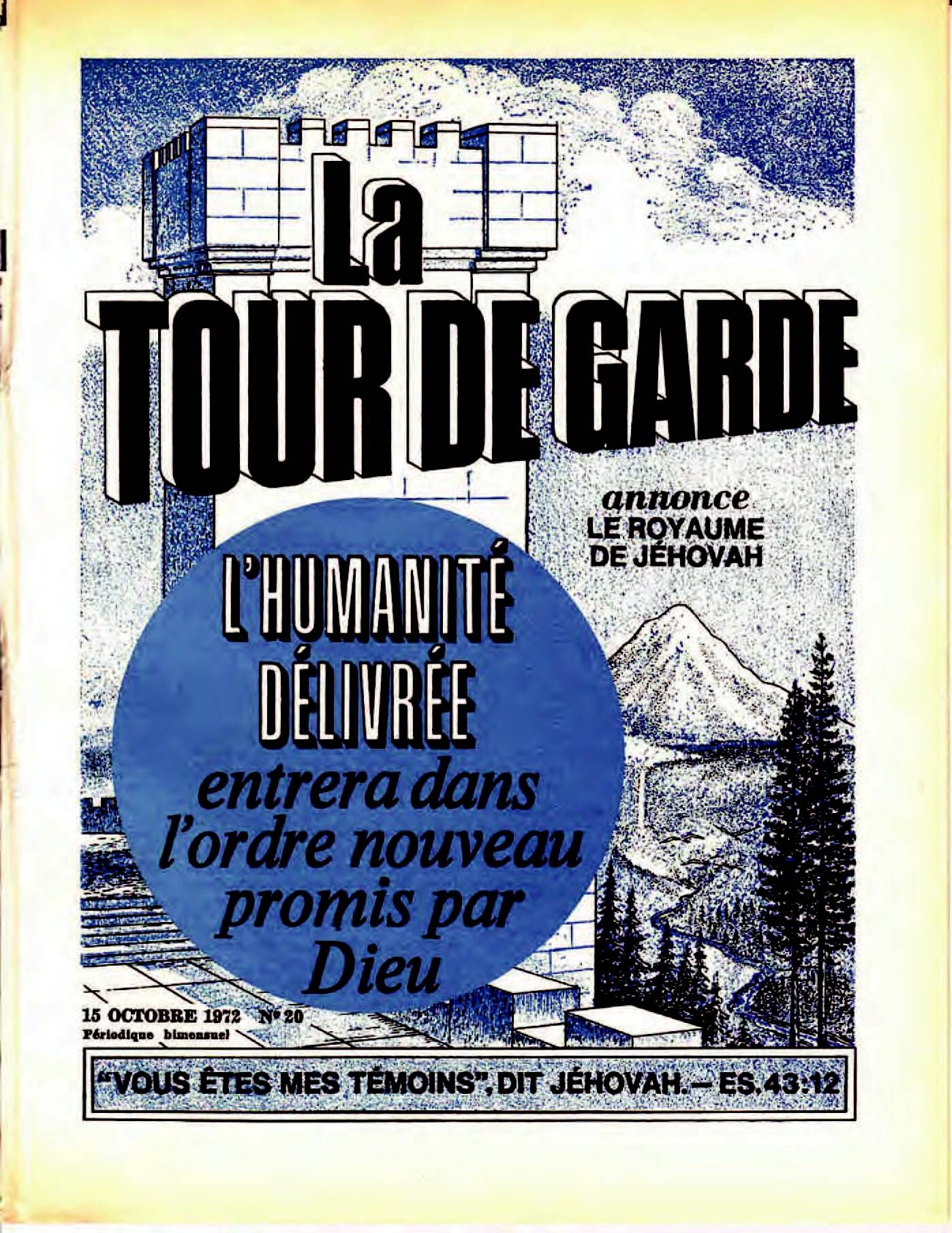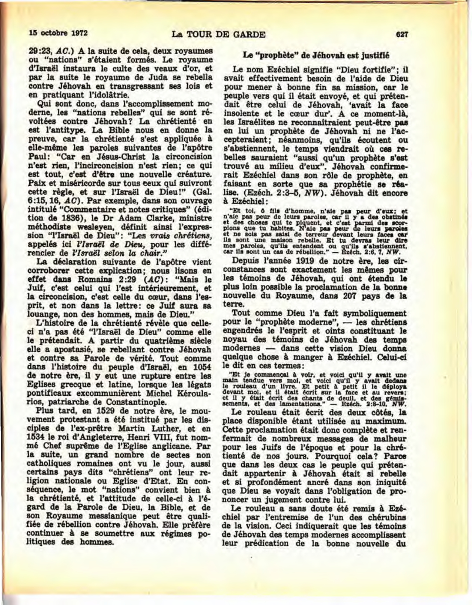 Lorsque Jéhovah s’adressa au prêtre juif Ézéchiel pour le désigner comme son prophète, il dit : “Fils d’homme, je t’envoie vers les fils d’Israël, vers des nations rebelles qui se sont rebellées contre moi.” (Ézéch. 2:3, NW). En ce “temps de la fin”, qui sont les “fils d’Israël” et les “nations rebelles” envers Jéhovah ? [...] Qui sont donc, dans l’accomplissement moderne, les “nations rebelles” qui se sont révoltées contre Jéhovah ? La chrétienté en est l’antitype [...] L’histoire de la chrétienté révèle que celle-ci n’a pas été “l’Israël de Dieu” comme elle le prétendait. À partir du quatrième siècle elle a apostasié, se rebellant contre Jéhovah et contre sa Parole de vérité. [...] Plus tard, en 1529 de notre ère, le mouvement protestant a été institué par les disciples de l’ex-prêtre Martin Luther, et en 1534 le roi d’Angleterre, Henri VIII, fut nommé Chef suprême de l’Église anglicane. Par la suite, un grand nombre de sectes non catholiques romaines ont vu le jour, aussi certains pays dits “chrétiens” ont leur religion nationale ou Église d’État. En conséquence, le mot “nations” convient bien à la chrétienté, et l’attitude de celle-ci à l’égard de la Parole de Dieu, la Bible, et de son Royaume messianique peut être qualifiée de rébellion contre Jéhovah. Elle préfère continuer à se soumettre aux régimes politiques des hommes. Source : 🇫🇷 La Tour de Garde 15 Octobre 1972, page 626 + page 627 + Cover | En ligne |