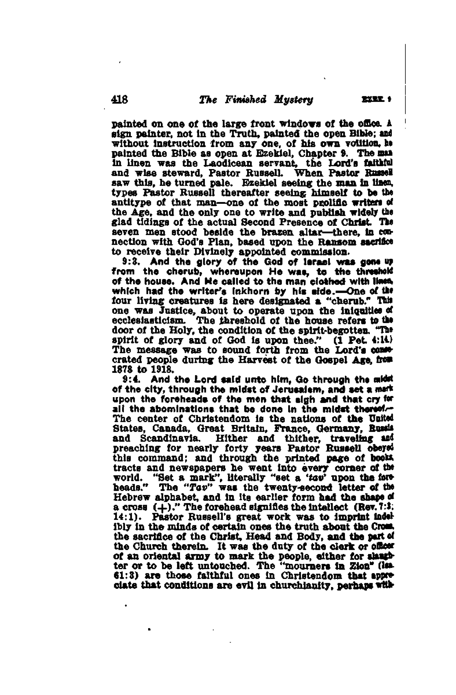 And the Lord said unto him, Go through the midst of the city, through the midst of Jerusalem, and set a mark upon the foreheads of the men that sigh and that cry for all the abominations that be done in the midst thereof. — The center of Christendom is the nations of the United States, Canada, Great Britain, France, Germany, Russia and Scandinavia. Hither and thither, traveling and preaching for nearly forty years Pastor Russell obeyed this command; and through the printed page of books, tracts and newspapers he went into every corner of the world. "Set a mark", literally "set a ‘tav' upon the foreheads." The "Tav" was the twenty-second letter of the Hebrew alphabet, and in its earlier form had the shape of a cross (+)." The forehead signifies the intellect (Rev. 7:3; 14:1). Pastor Russell's great work was to imprint indelibly in the minds of certain ones the truth about the Cross, the sacrifice of the Christ, Head and Body, and the part of the Church therein. It was the duty of the clerk or officer of an oriental army to mark the people, either for slaughter or to be left untouched. The "mourners in Zion" (Isa. 61:3) are those faithful ones in Christendom that appreciate that conditions are evil in churchianity, perhaps without understanding just how. All these are to be marked in their minds with the knowledge of the Present Truth. Source : 🇺🇸 1918 - The Finished Mystery, page 418 et page 419 + Cover |