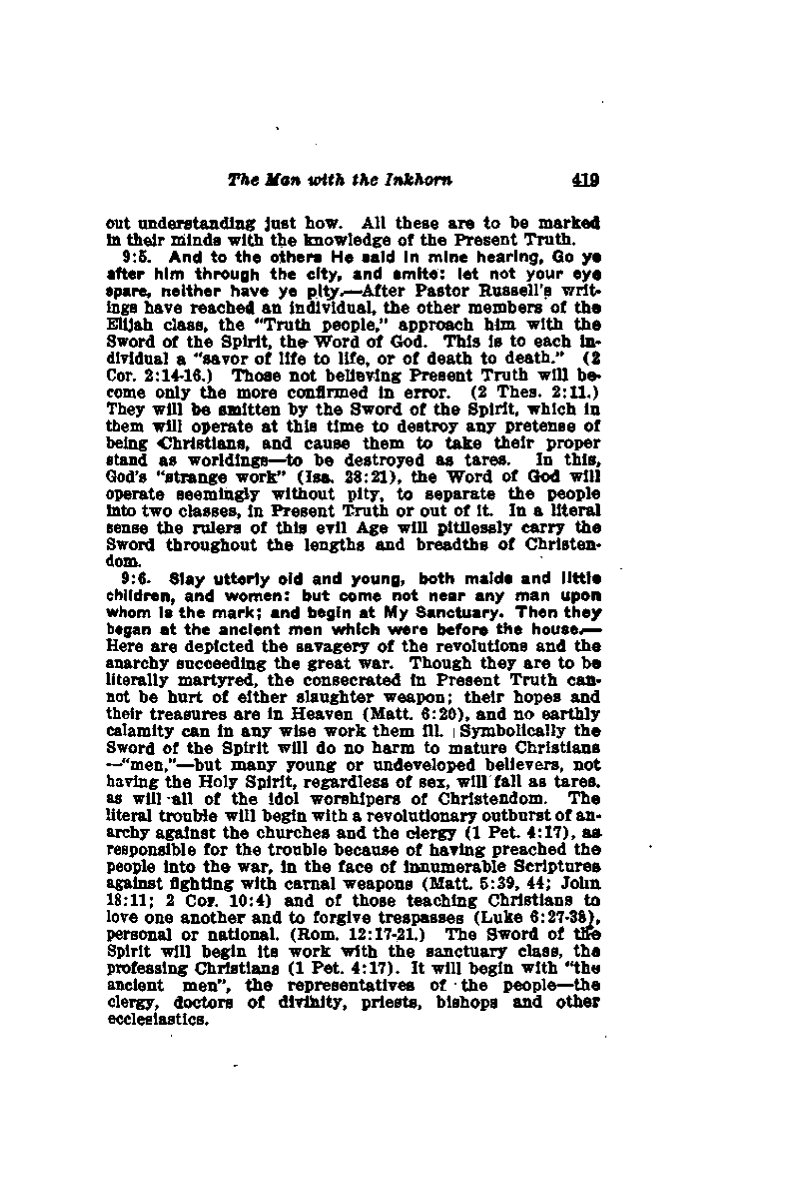 🇫🇷 Traduction : 9:11. Et voici, l'homme vêtu de lin, qui avait l'encreur à ses côtés, rapporta l'affaire, disant : J'ai fait ce que Tu m'as commandé. - Le pasteur Russell était fidèle à sa grande tâche d'écrire et de publier la Vérité et d'imprimer le « tav » de la Vérité Présente dans l'esprit des engendrés de l'esprit. En octobre 1916, il mourut, et au-delà du voile il a, avant cela, sans aucun doute, rapporté la présence du Christ qu'il a fait l'œuvre qu'il lui était donné d'accomplir.