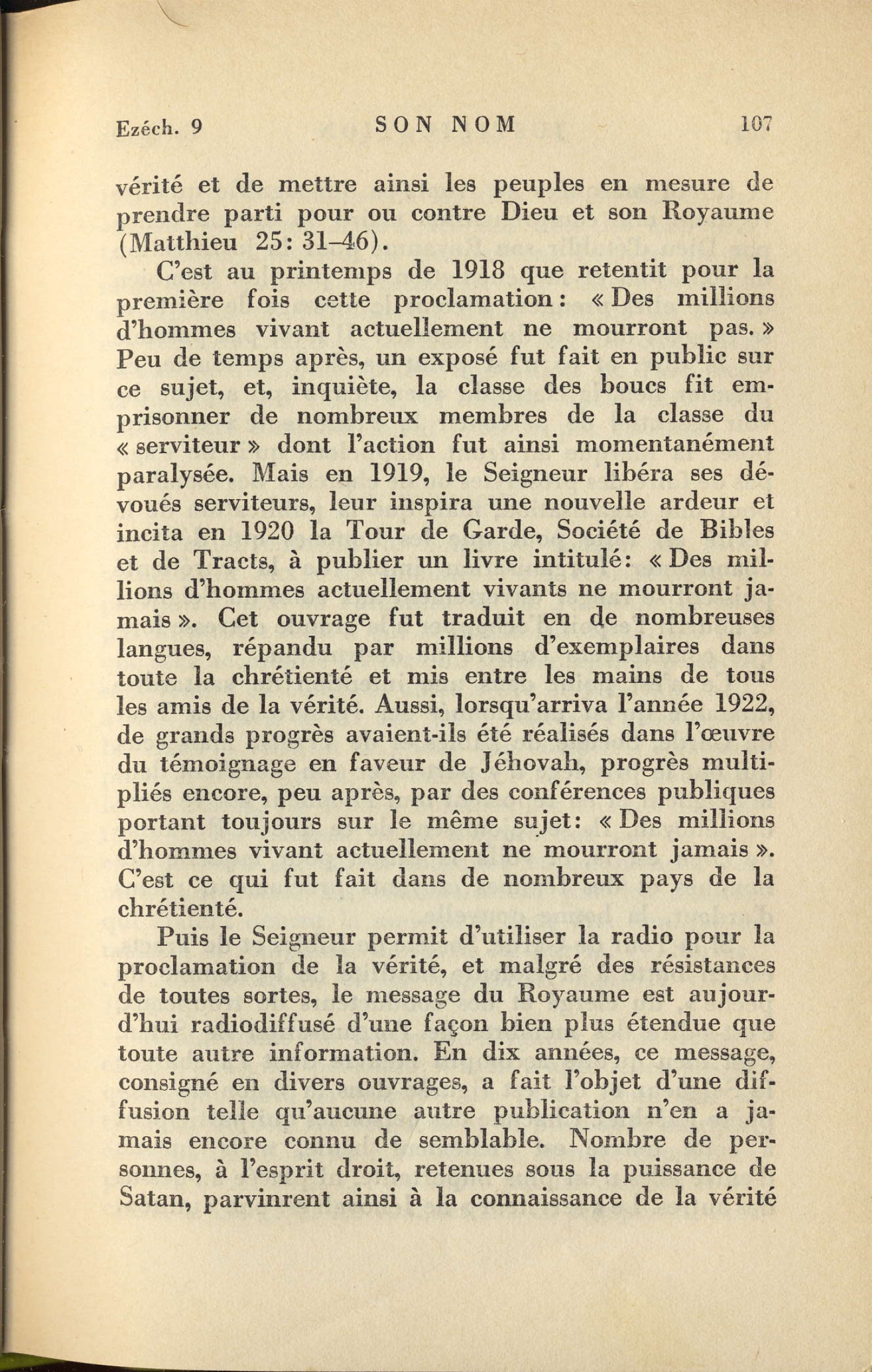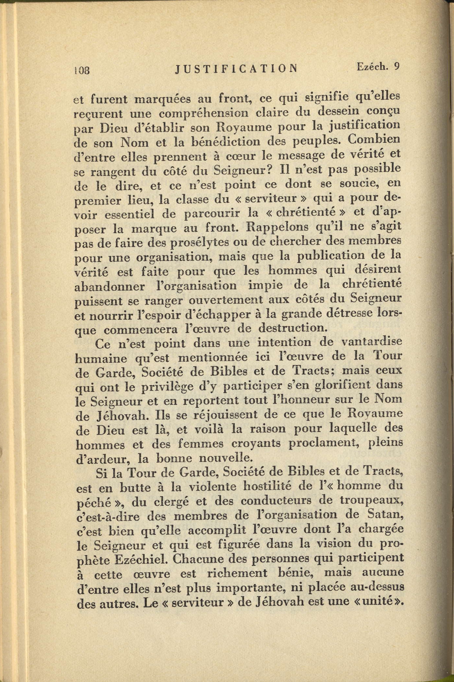 C'est donc à l'humanité entière que les fidèles serviteurs du Seigneur doivent porter témoignage de la vérité, et sur toutes les nations du monde ils doivent faire flotter l'étendard du Seigneur. [...] Et la classe du serviteur a le privilège de porter le témoignage en faveur la vérité et de mettre ainsi les peuples en mesure de prendre parti pour ou contre Dieu et son Royaume (Matthieur 25:31-46). C'est au printemps de 1918 que retentit pour la première fois cette proclamation: « Des millions d'hommes vivant actuellement ne mourront pas. » Peu de temps après, un exposé fut fait en public sur ce sujet, et, inquiète la classe des boucs fit emprisonner de nombreux membres de la classe du « serviteur » dont l'action fut ainsi momentanément paralysée. Mais en 1919, le Seigneur libéra ses dévoués serviteurs, leur inspira une nouvelle ardeur et incita en 1920 la Tour de garde, Société de Bibles et de Tracts, à publier un livre intitulé: « Des millions d'hommes actuellement vivant ne mourront jamais ». Cet ouvrage fut traduit en de nombreuses langues, répandu par millions d'exemplaires dans toutes la chrétienté et mis entre les mains de tous les amis de la vérité. Aussi, lorsqu'arriva l'année 1922, de grands progrès avaient-ils été réalisés dans l'oeuvre du témoignage en faveur de Jéhovah, progrès multipliés encore, peu après, par des conférences publiques portant toujours sur le même sujet « Des millions d'hommes vivant actuellement ne mourront jamais ». C'est ce qui fut fait dans de nombreux pays de la chrétienté. Puis le Seigneur permit d'utiliser la radio pour la proclamation de la vérité, et malgré des résistances de toutes sortes, le message du Royaume est aujourd'hui radiodiffusé d'une façon bien plus étendue que toute autre information. En dix année, ce message, consigné en divers ouvrages, a fait l'objet d'une diffusion telle qu'aucune autre publication n'en a jamais encore connu de semblable. Nombre de personnes, à l'esprit droit, retenues sous la puissance de Satan, parvinrent à la connaissance de la vérité et furent marquées au front, ce qui signifie qu'elles reçurent une compréhension claire du dessein conçu par Dieu d'établir son Royaume pour la justification de son Nom et les bénédiction des peuples. [...] la classe du « serviteur » qui a pour devoir essentiel de parcourir la « chrétienté » et d'apposer la marque au front. [...] elle accomplit l'oeuvre dont l'a chargé le seigneur et qui est figurée dans la vision du prophète Ezéchiel. Source : 🇫🇷 1931 - « Justification - Tome 1 » page 106 + page 107 + page 108 + Cover |