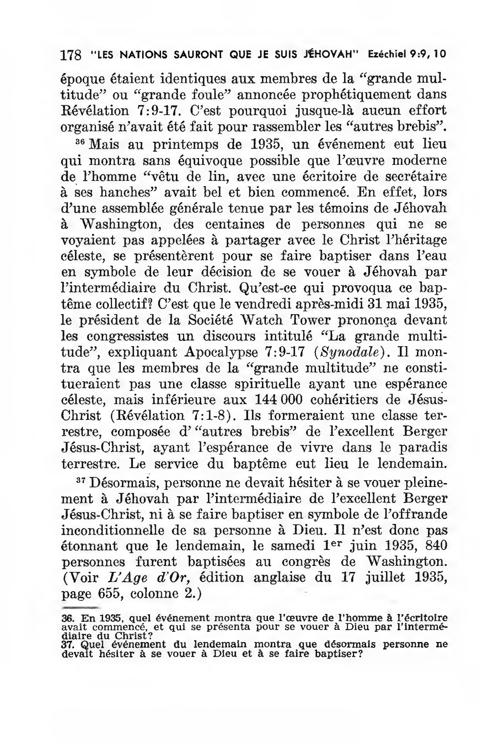 36. En 1935, quel événement montra que l’œuvre de l’homme à l’écritoire avait commencé, et qui se présenta pour se vouer à Dieu par l’intermédiaire du Christ? Mais au printemps de 1935, un événement eut lieu qui montra sans équivoque possible que l’œuvre moderne de l’homme “vêtu de lin, avec une écritoire de secrétaire à ses hanches” avait bel et bien commencé. En effet, lors d’une assemblée générale tenue par les témoins de Jéhovah à Washington, des centaines de personnes qui ne se voyaient pas appelées à partager avec le Christ l’héritage céleste se présentèrent pour se faire baptiser dans l’eau en symbole de leur décision de se vouer à Jéhovah par l’intermédiaire du Christ. Qu’est-ce qui provoqua ce baptême collectif? C’est que le vendredi après-midi 31 mai 1935, le président de la Société Watch Tower prononça devant les congressistes un discours intitulé “La grande multitude”, expliquant Apocalypse 7:9-17 (Synodale). Il montra que les membres de la “grande multitude” ne constitueraient pas une classe spirituelle ayant une espérance céleste, mais inférieure aux 144 000 cohéritiers de Jésus Christ (Révélation 7:1-8). Ils formeraient une classe terrestre, composée d’“autres brebis” de l’excellent Berger Jésus Christ, ayant l’espérance de vivre dans le paradis terrestre. Le service du baptême eut lieu le lendemain. Source : 🇫🇷 1971 - « Les nations sauront que je suis Jéhovah. » Comment ? page 177 + page 178 + Cover |