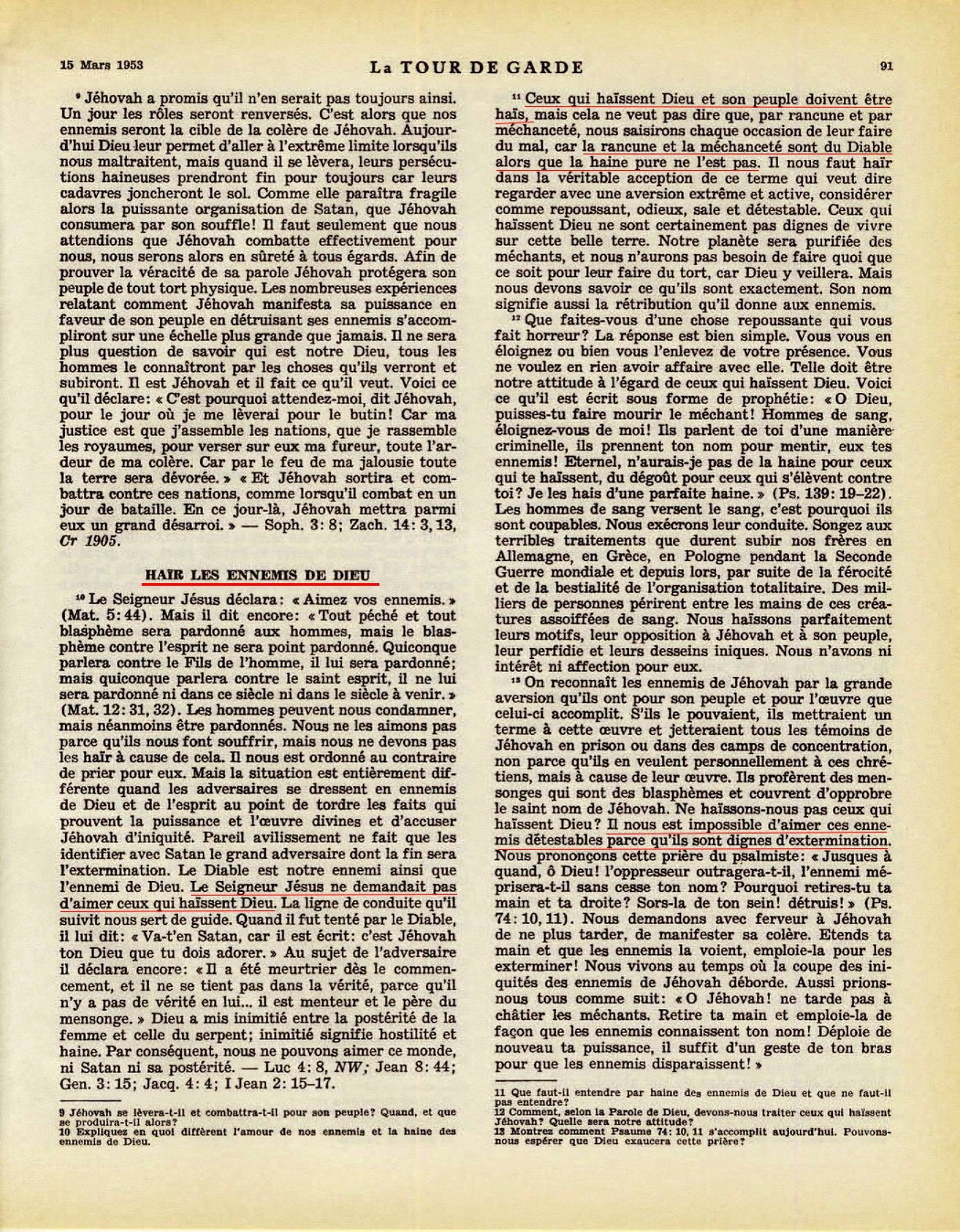 Le Seigneur Jésus ne demandait pas d'aimer ceux qui haïssent Dieu... Ceux qui haïssent Dieu et son peuple doivent être haïs... la rancune et la méchanceté sont du Diable alors que la haine pure ne l'est pas... Il nous est imposible d'aimer ces ennemis détestables parce qu'ils sont dignes d'extermination. » Source : 🇫🇷 La Tour de Garde, 15 mars 1953, page 91 + Cover |