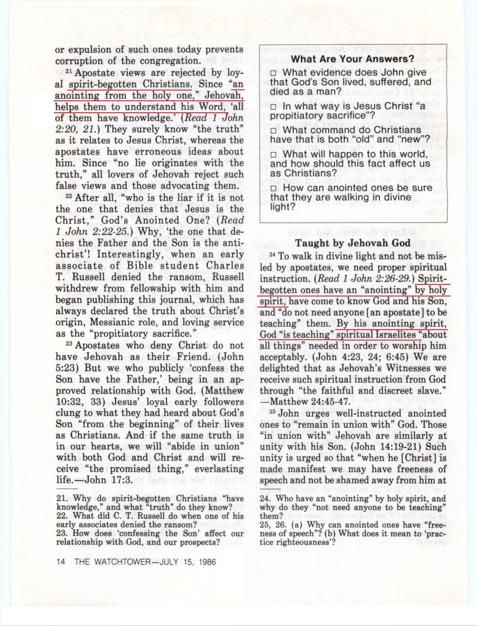 Apostate views are rejected by loyal spirit-begotten Christians. Since “ananointing from the holy one,” Jehovah, helps them to understand his Word, ‘all of them have knowledge.’ [...] Spirit-begotten ones have an “anointing” by holy spirit, have come to know God and his Son, and “do not need anyone [an apostate] to be teaching” them. By his anointing spirit, God “is teaching” spiritual Israelites “about all things” needed in order to worship him acceptably.