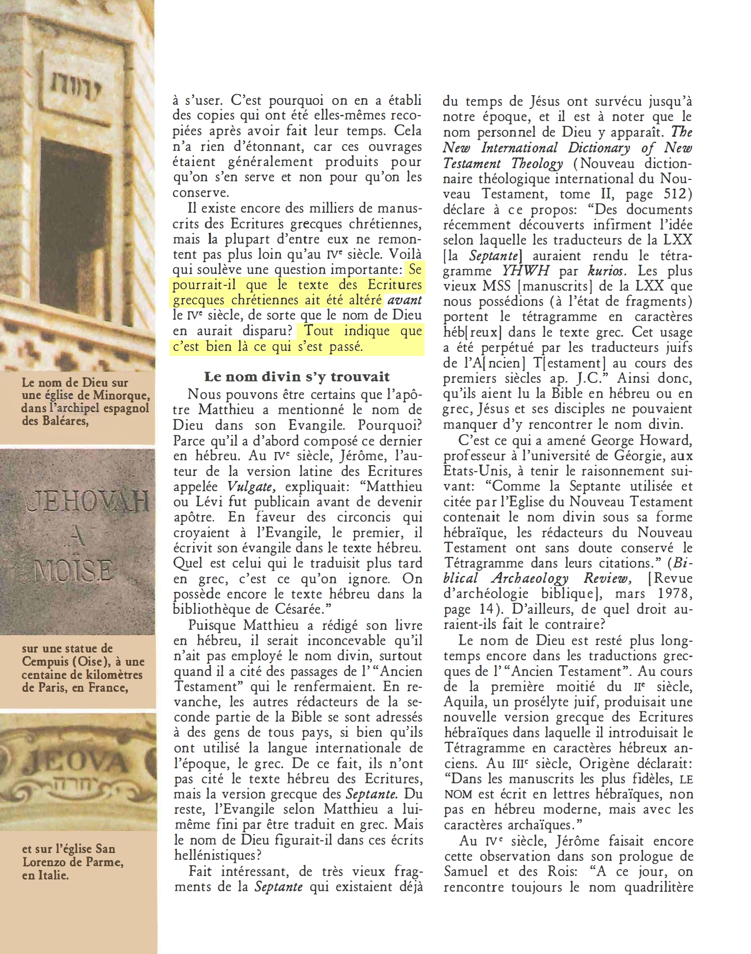 Nous ne possédons aucun manuscrit grec des livres classés dans nos Bibles de Matthieu à Révélation qui contienne le nom divin sous sa forme complète. Faut-il en déduire que celui-ci ne devait pas y figurer ? Ce serait surprenant... Il existe encore des milliers de manuscrits des Ecritures grecs chrétiennes, mais la plupart d'entre eux ne remontent pas plus loin qu'au IVe siècle. Voilà qui soulève une question importante : Se pourrait-il que le texte des Ecritures grecques chrétiennes ait été altéré avant le IV Source : 🇫🇷 1984 - Le nom divin qui demeure à jamais, page 23, page 24 + Cover |